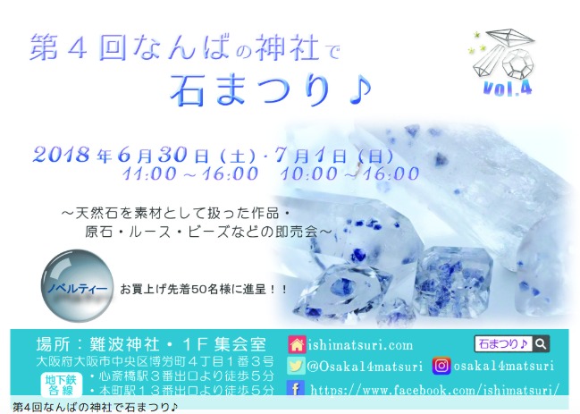 6月30日(土)7月1日(日)に、大阪 心斎橋の難波神社で開催される石イベント「なんばの神社で石まつり♪」に出展します。