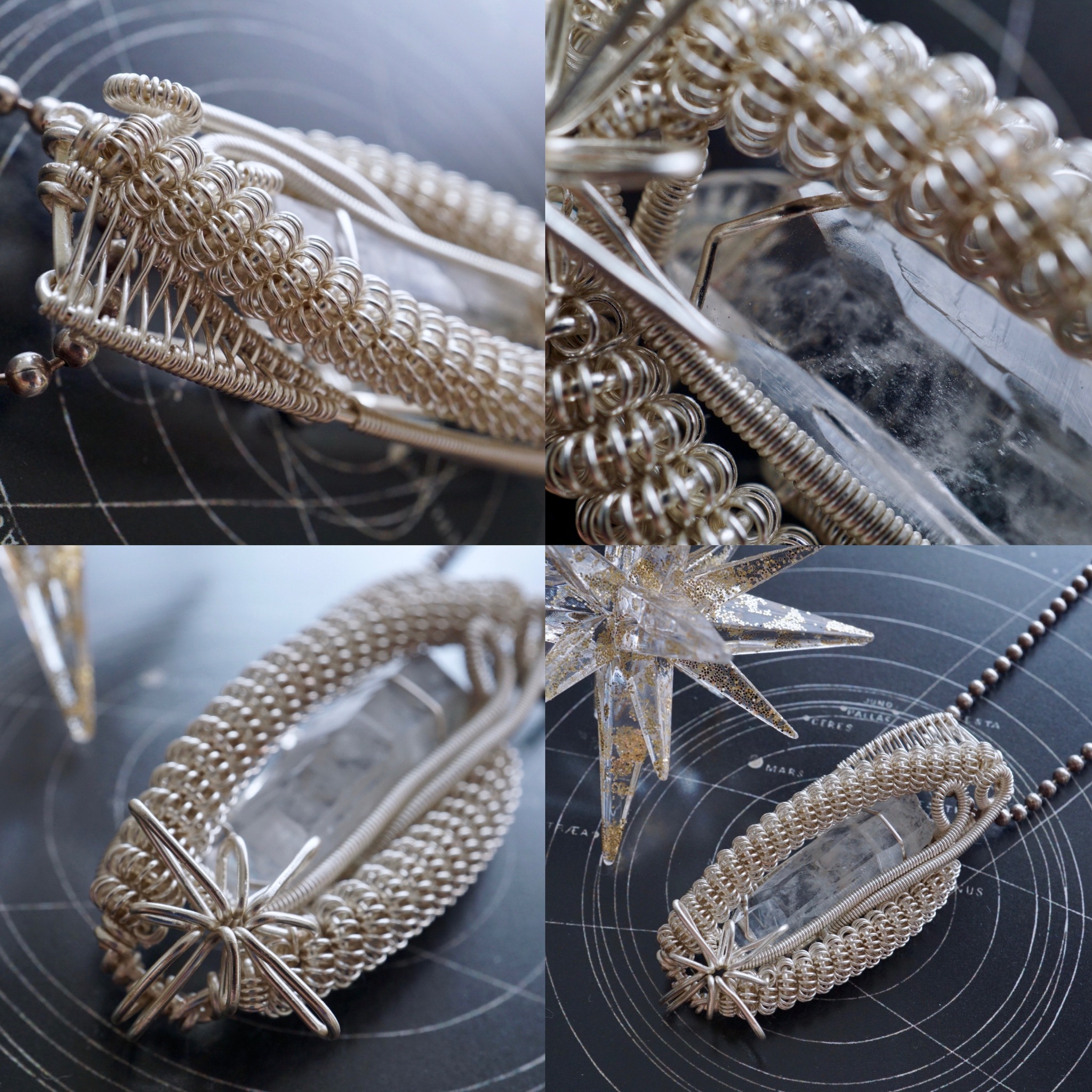 透明度の高い、表面の模様の美しい水晶のピースをなるたけ隠さぬよう、ワイヤーで覆う面積は最小限で、きっちり留まる石留めの方法を採用。