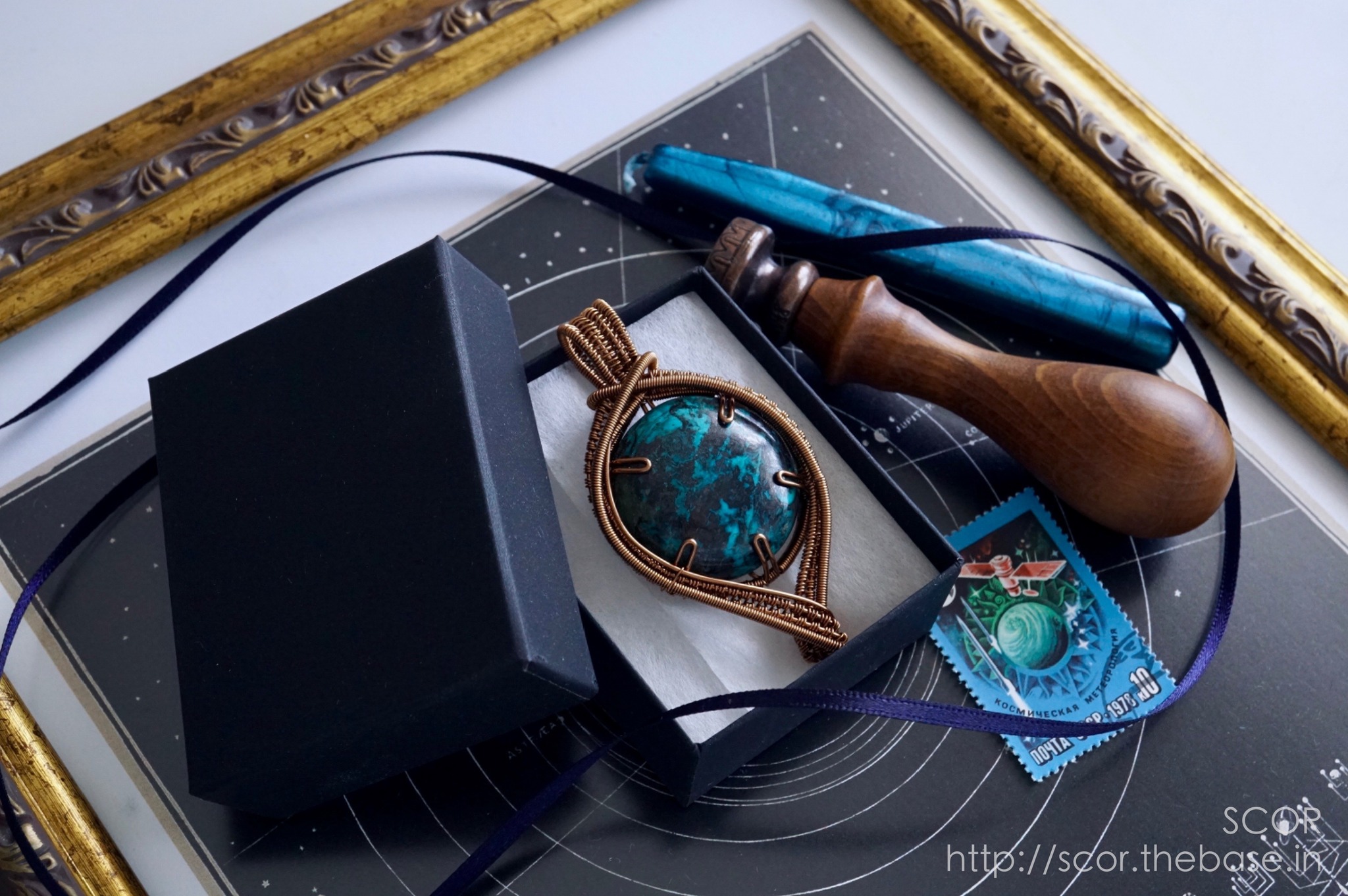 石のカラーと同じ「緑 × 青」の宇宙切手を作品に添えてお届けしました。