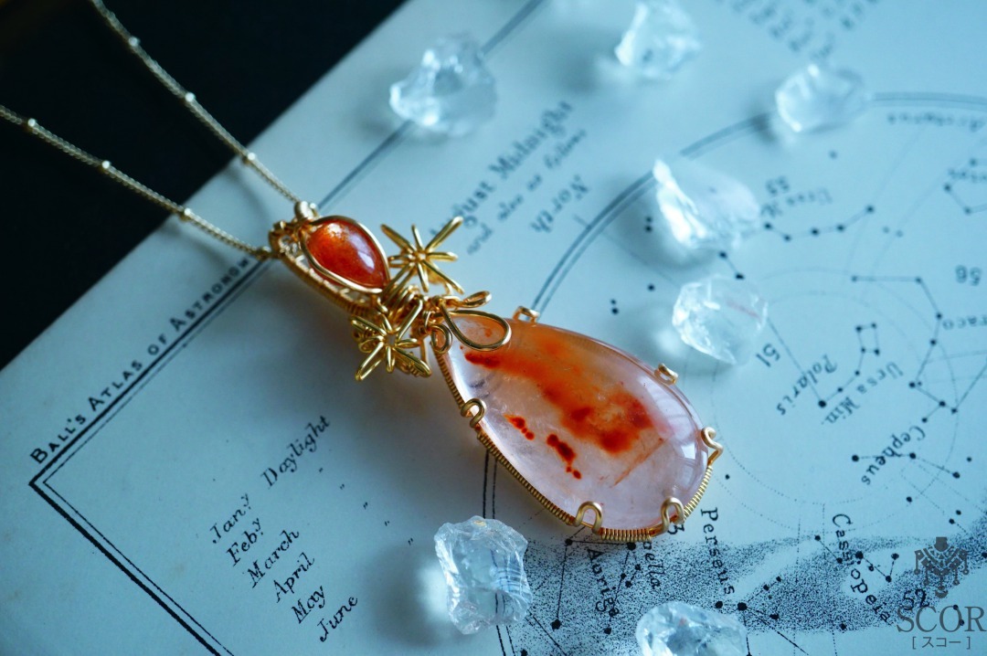 水辺に群生する植物・蒲(がま)のような色合いのインクルージョンが見られるオレンジヘアクオーツと、サンストーンを使ったペンダントです。