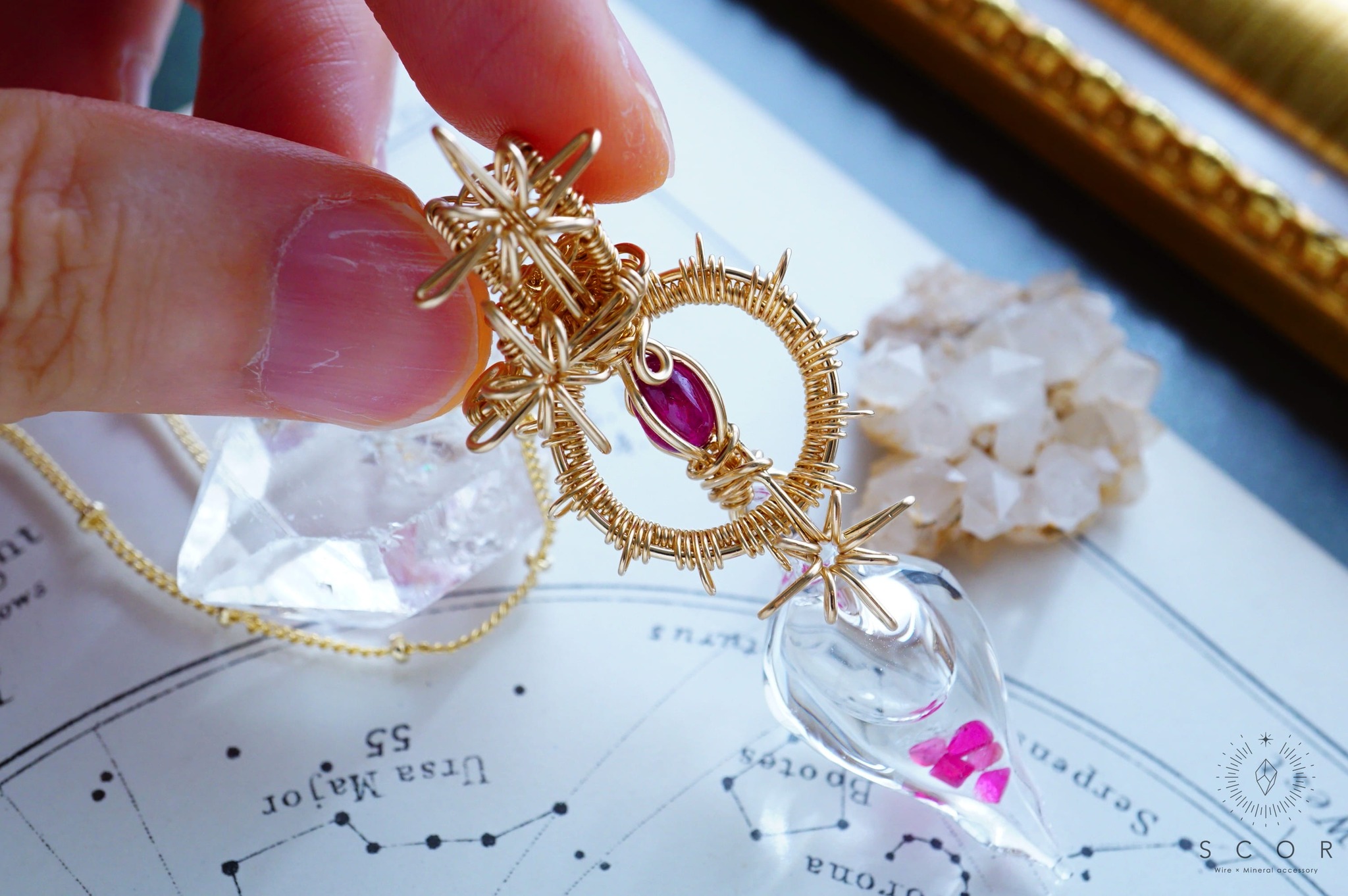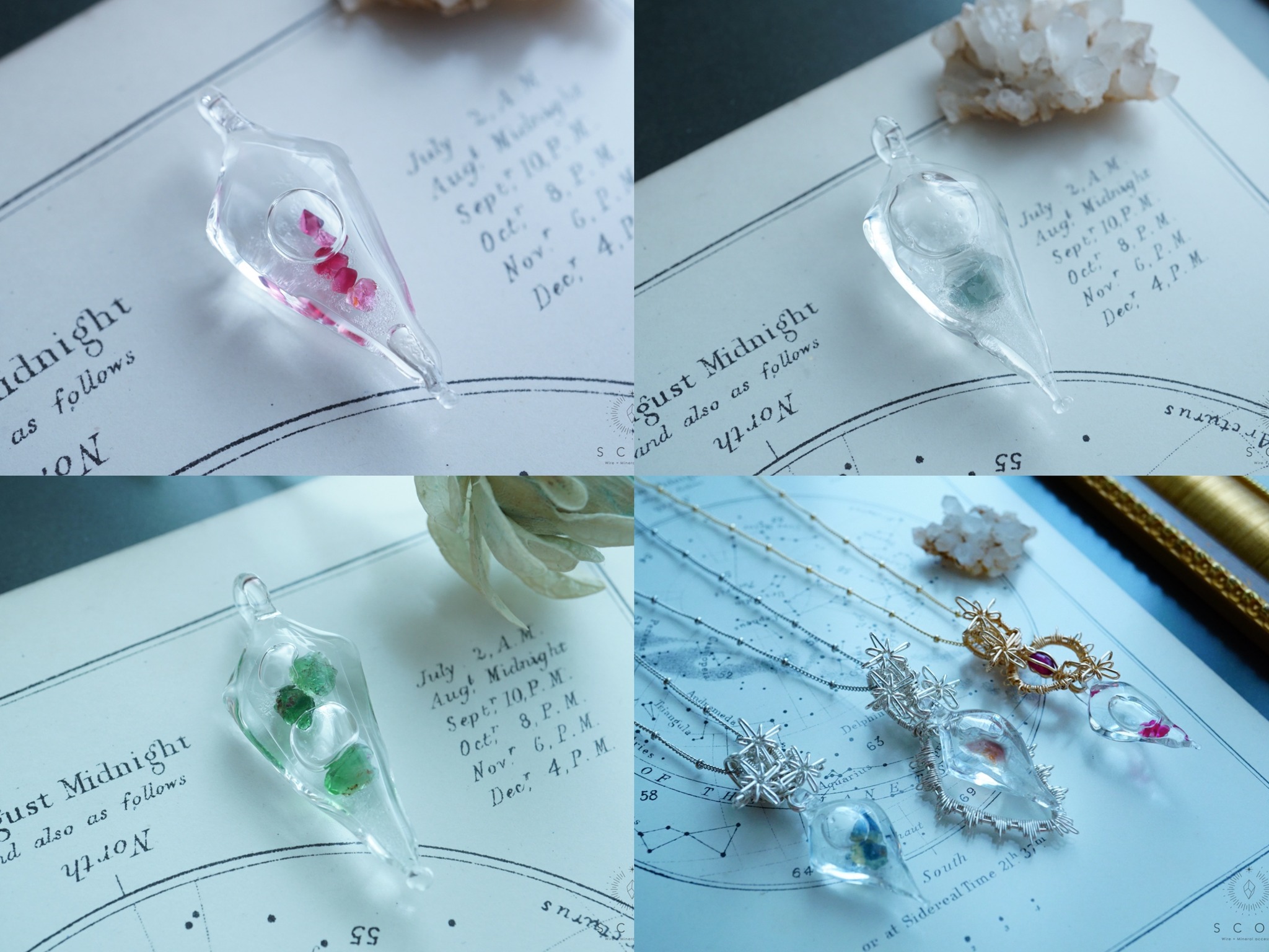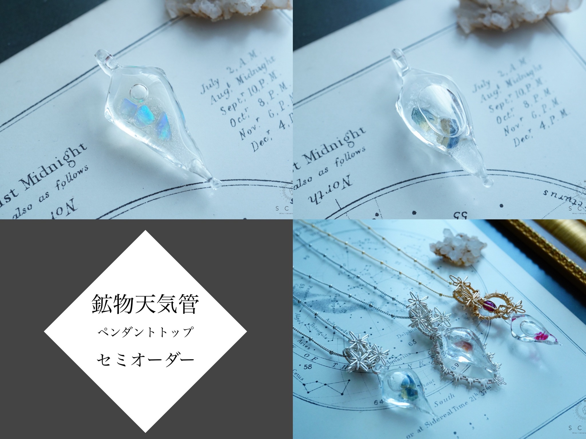 その中にさまざまな鉱物を入れた硝子工房 桃缶オリジナルの「鉱物天気管」を、SCOR [ スコー ]がお客さまのご希望のワイヤーで、お好みのデザインメニューのペンダントトップに仕立てます。