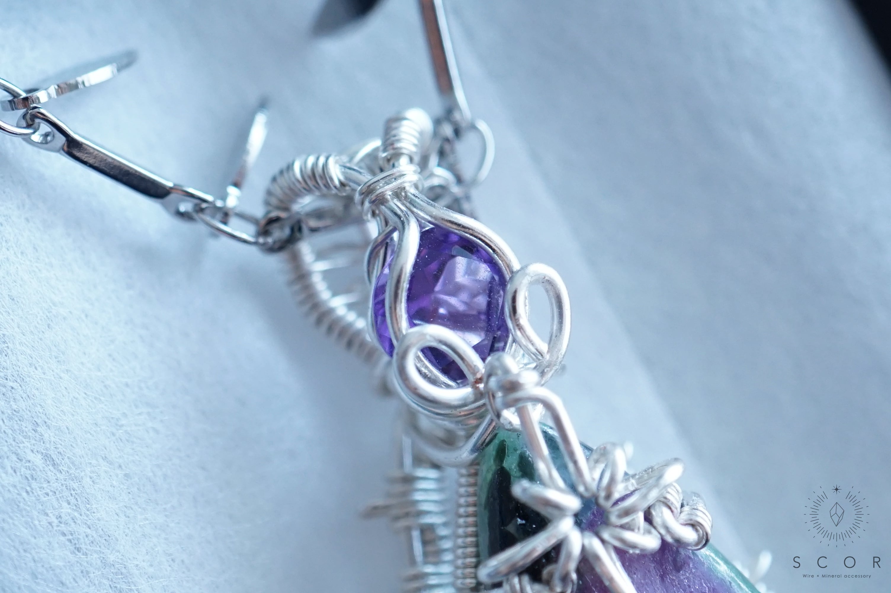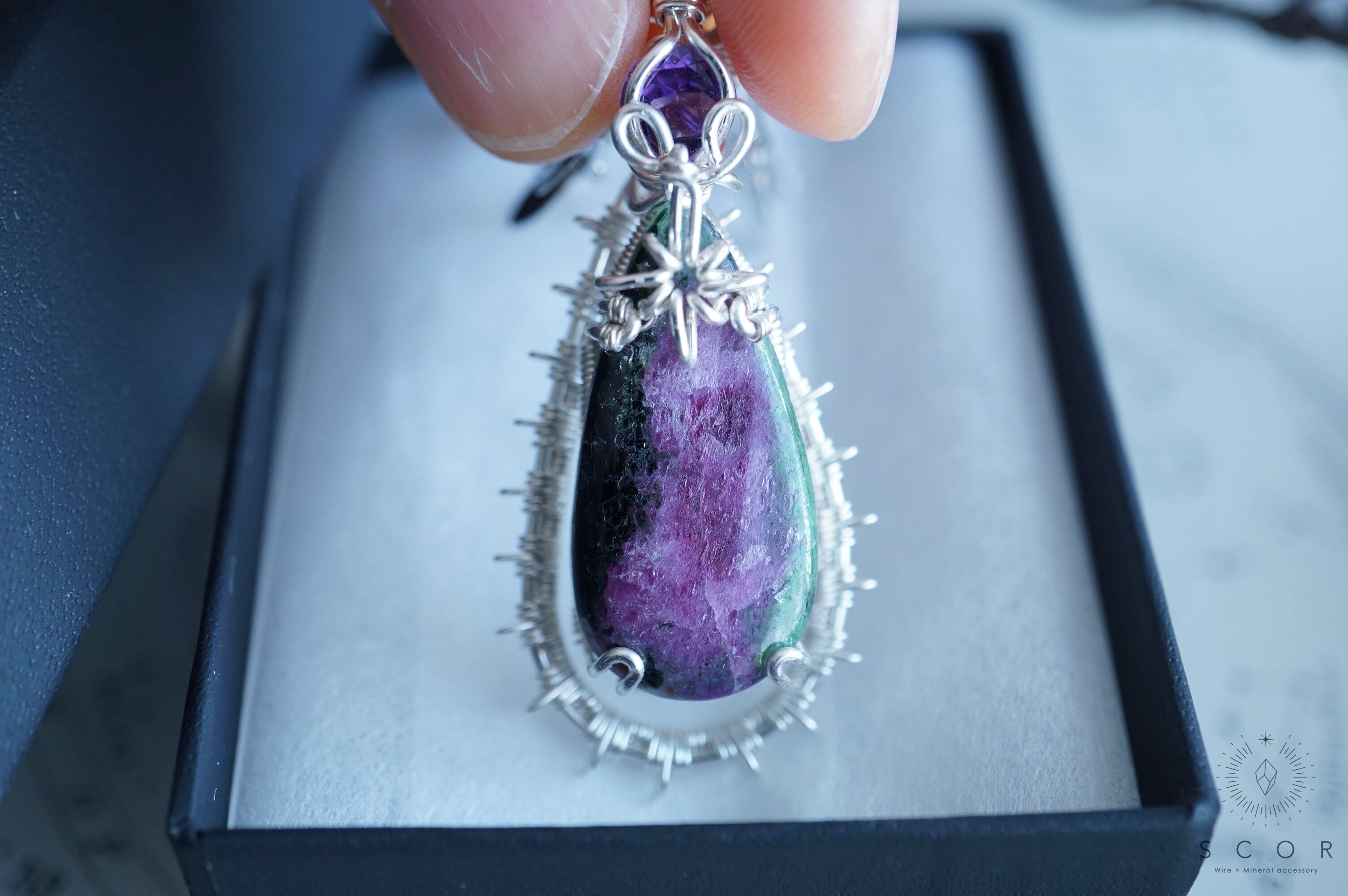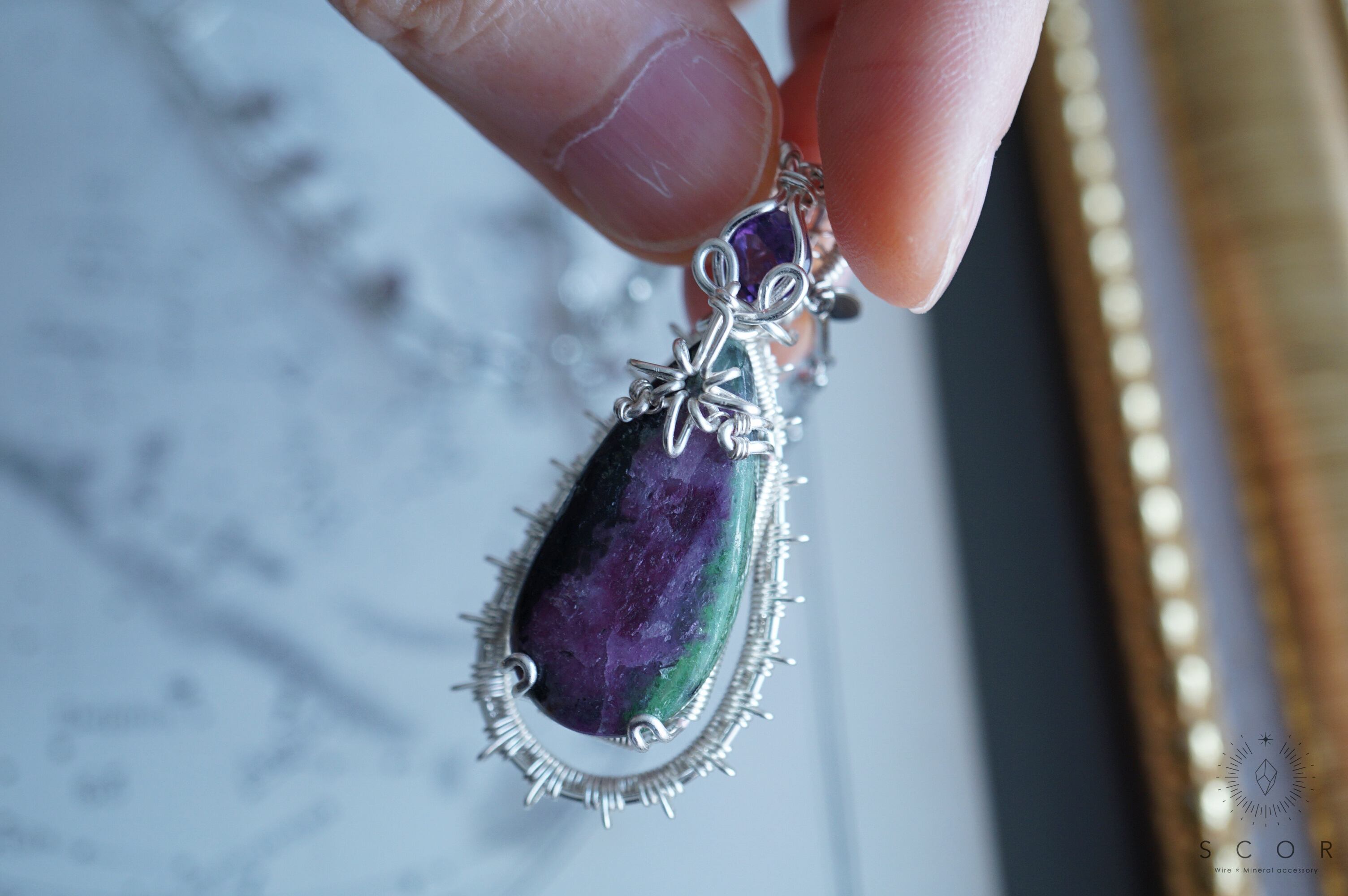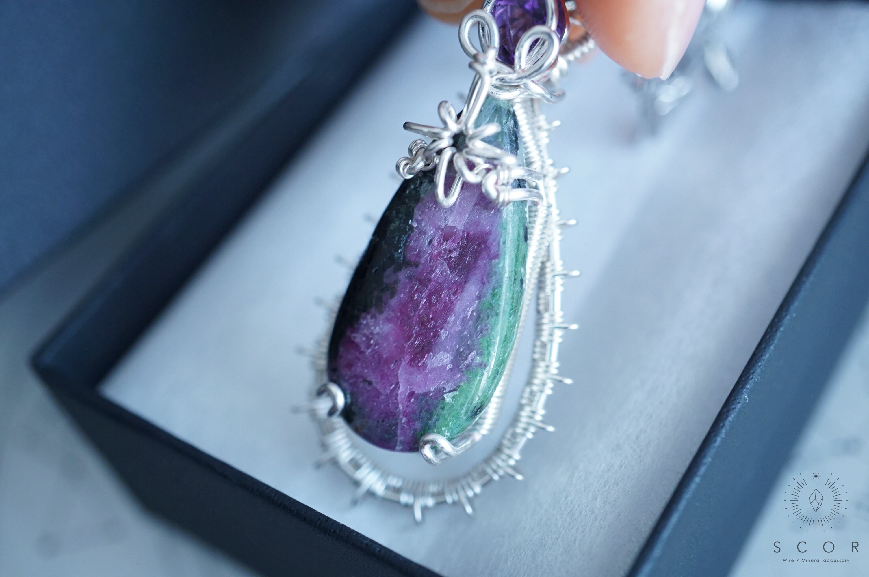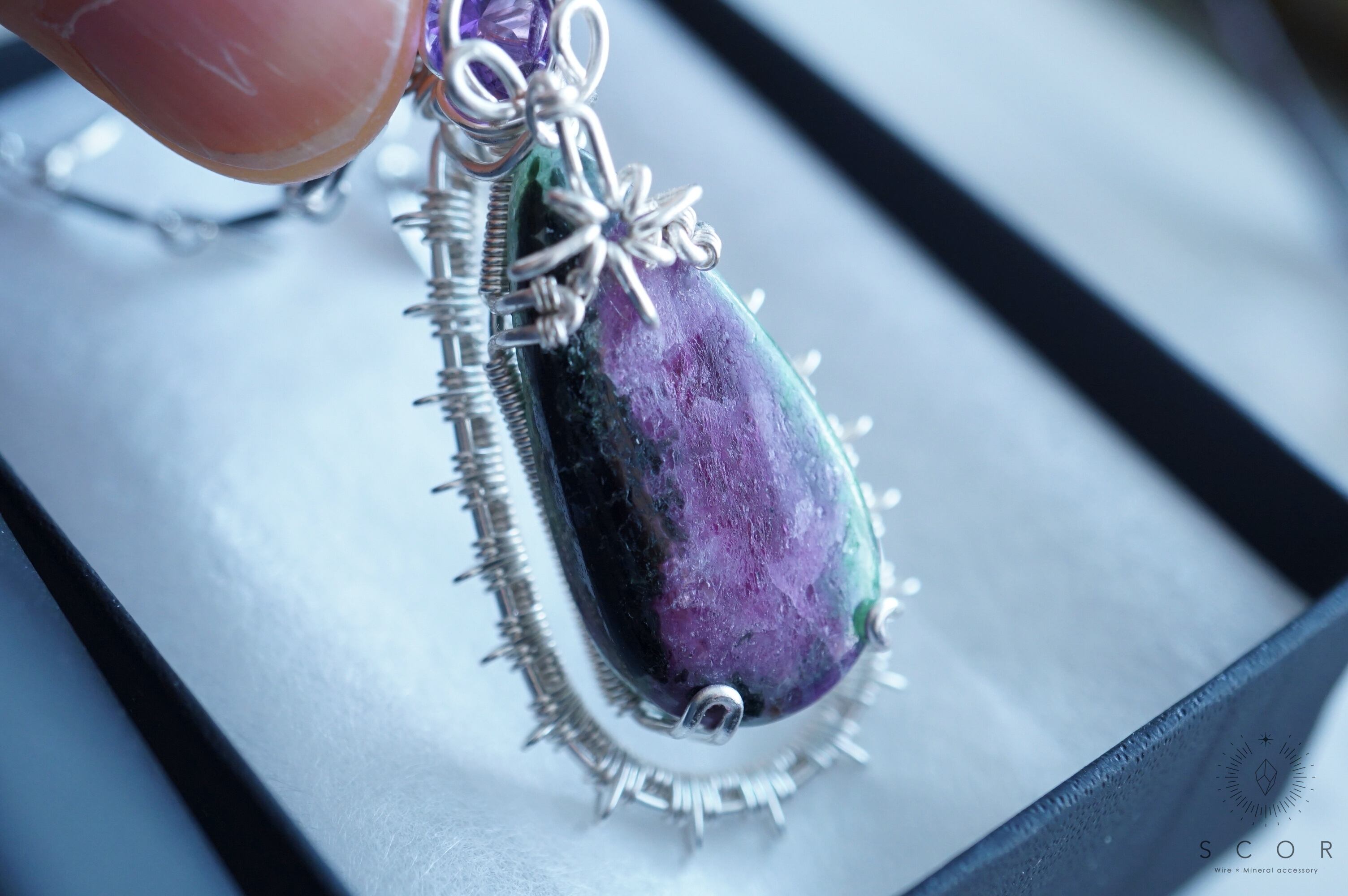 黒や濃い色の服と合わせると、ルビーインゾイサイトとアメジストの石色、ワイヤー装飾が際立ちます。
