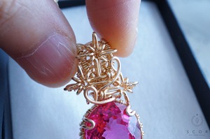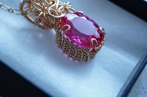 白や淡い色の服と合わせると、合成ピンクサファイアの石色がぱきっと際立ちます。