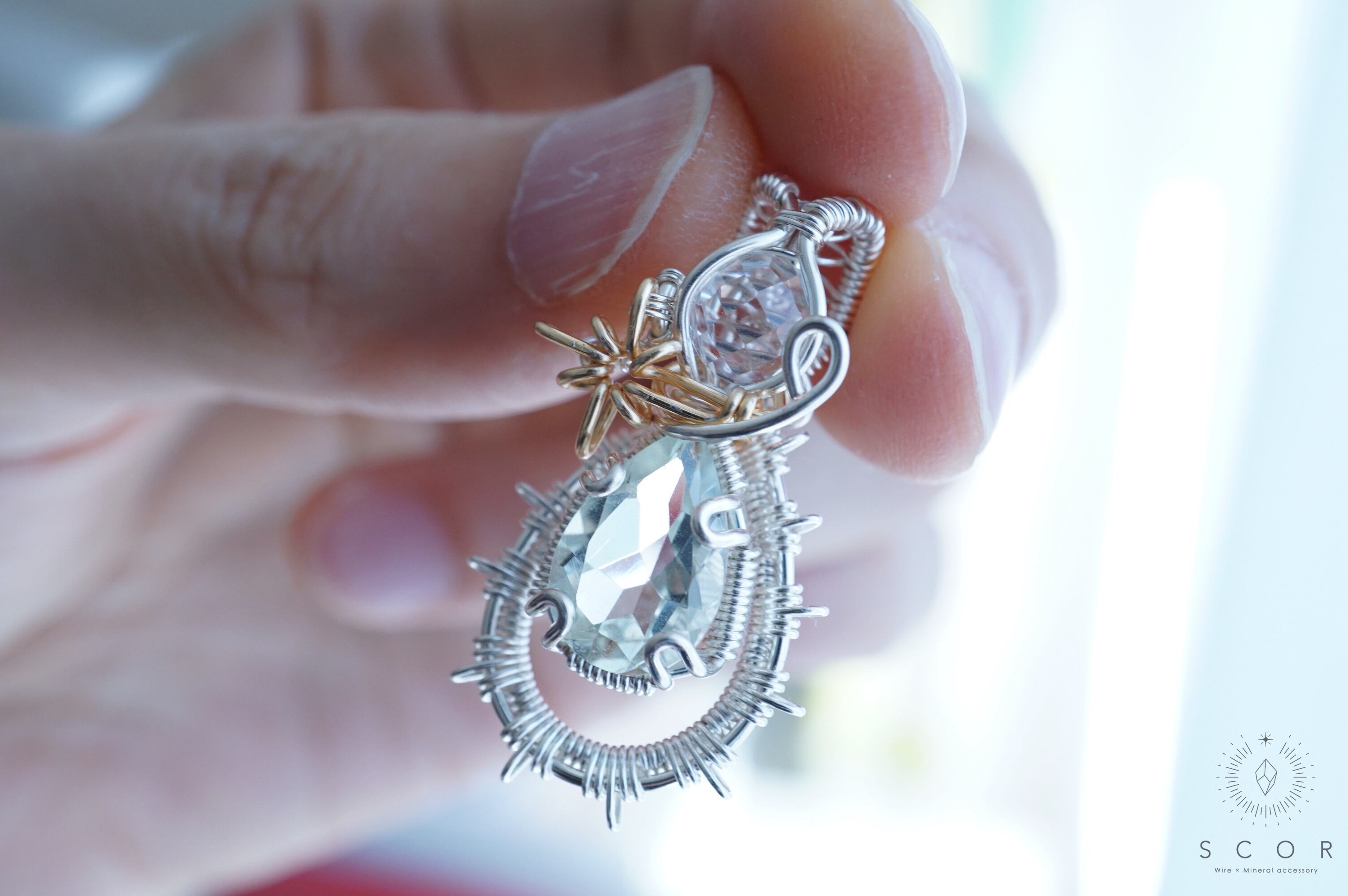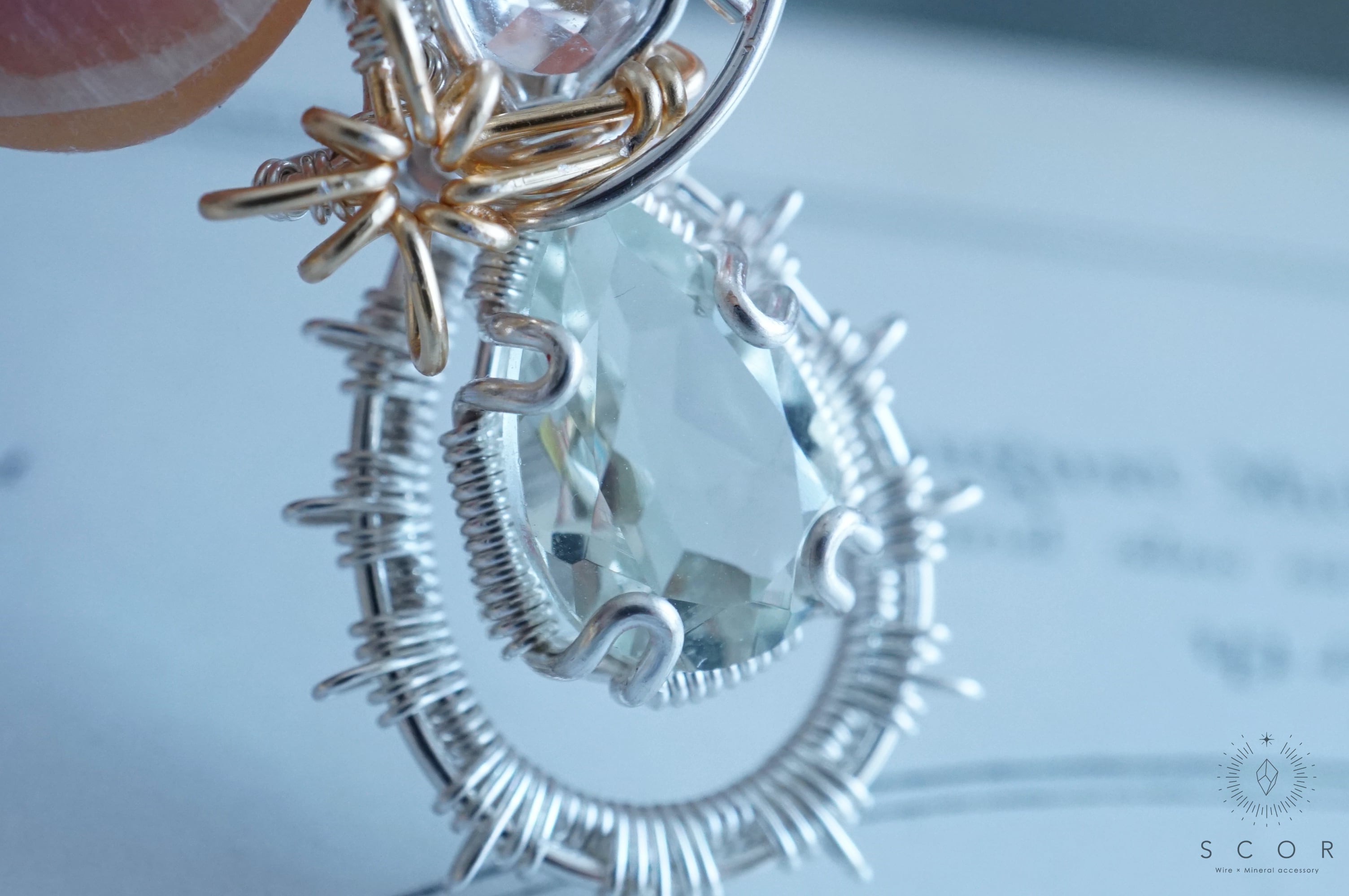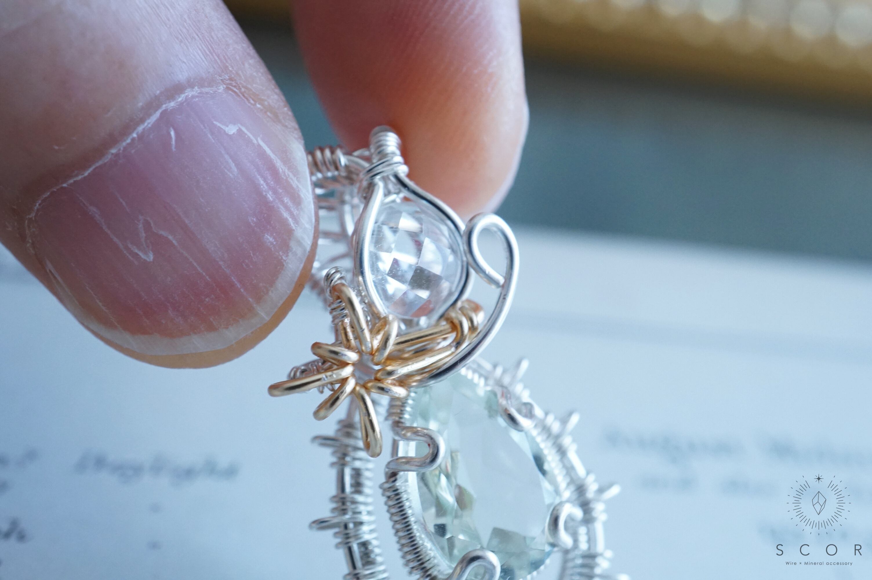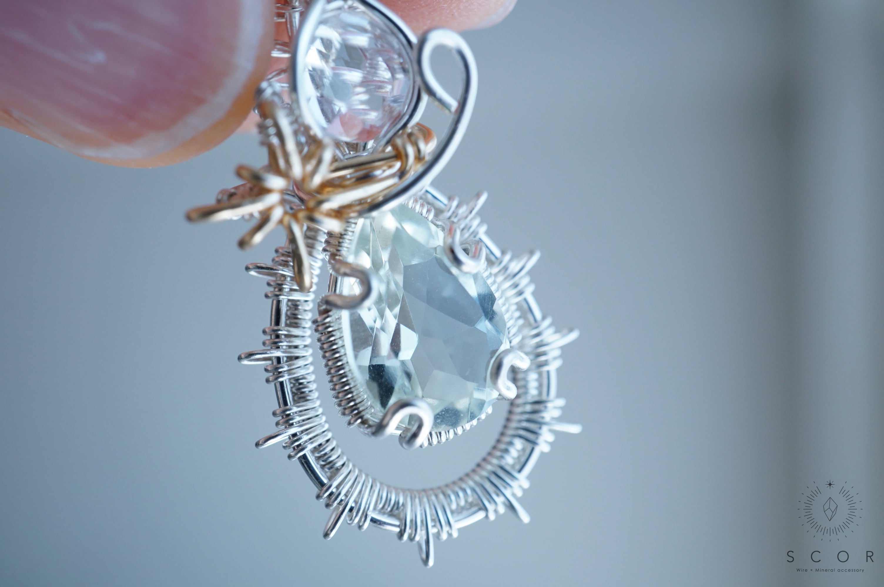 グリーンクオーツの間に配した流星を模した光芒型のワイヤーモチーフのみゴールド色のワイヤー仕立て。