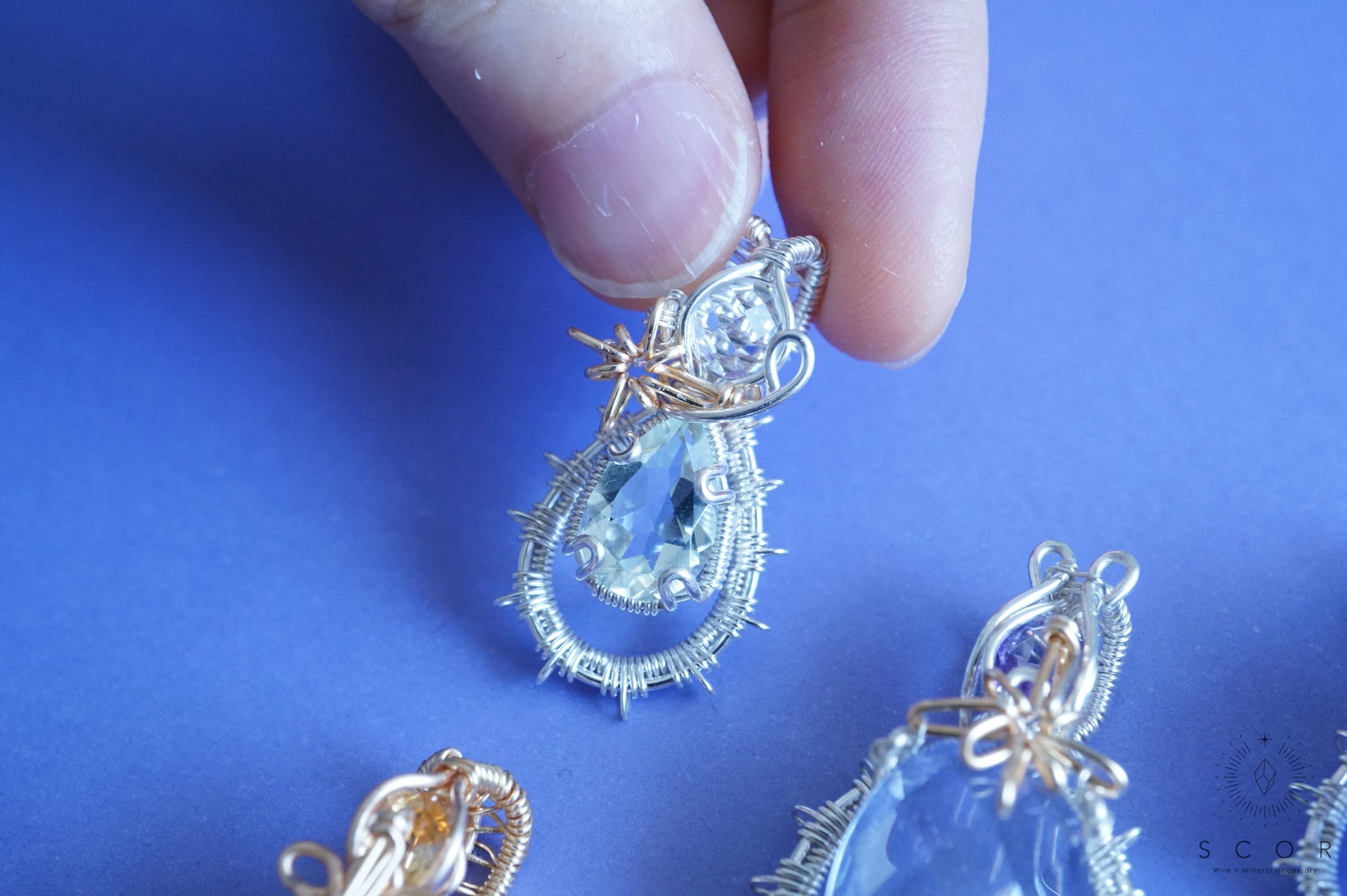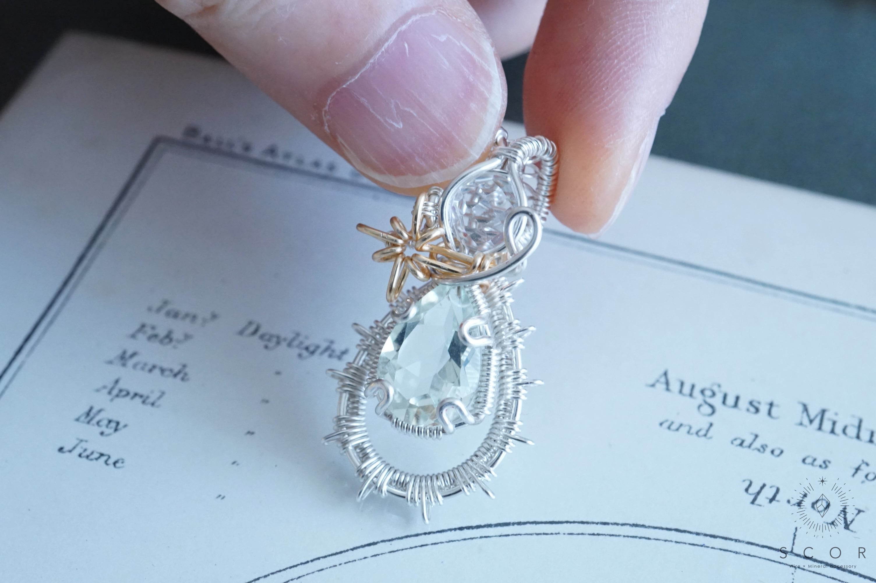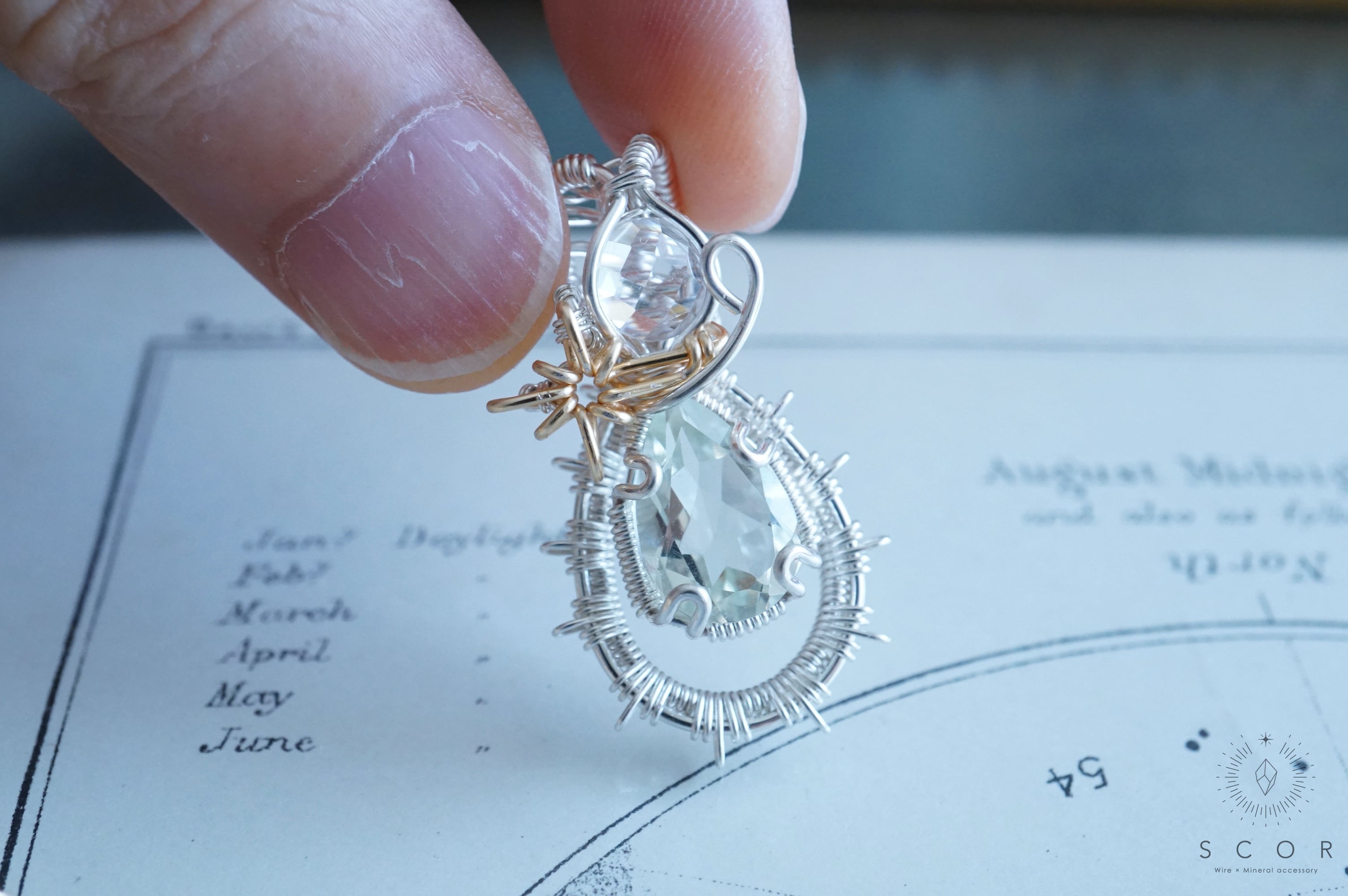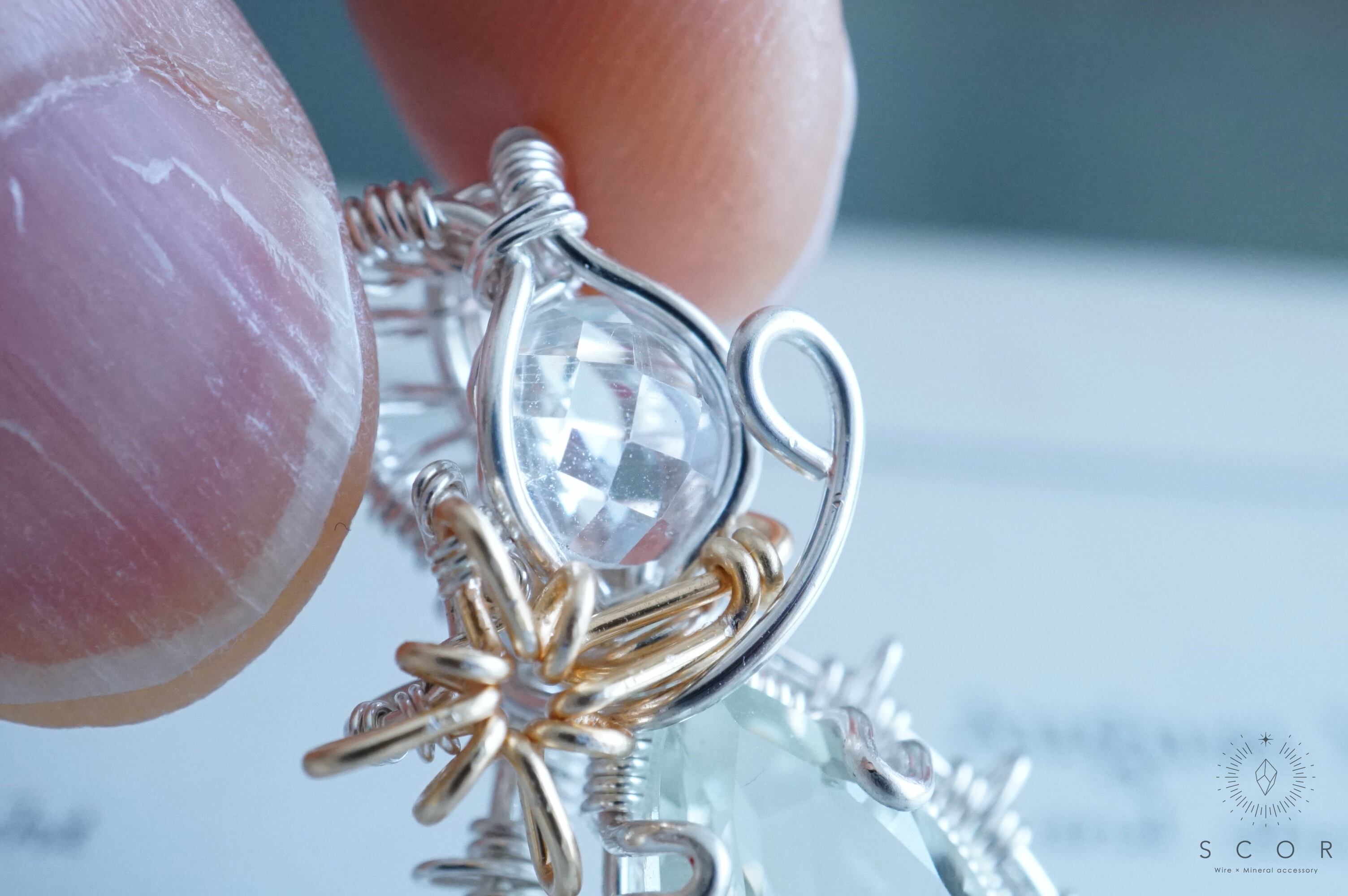 グリーンクオーツの間に配した流星を模した光芒型のワイヤーモチーフのみゴールド色のワイヤー仕立て。