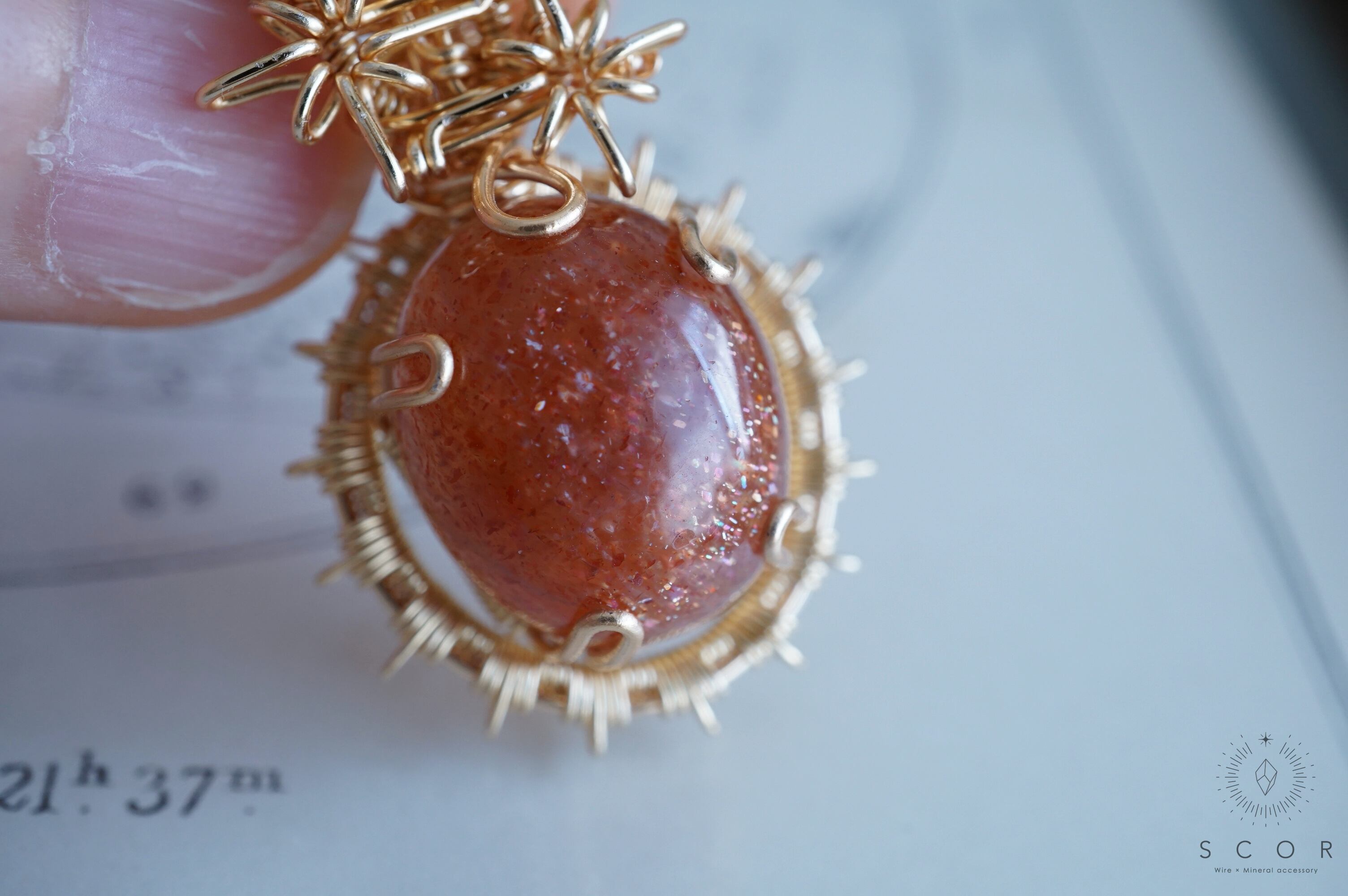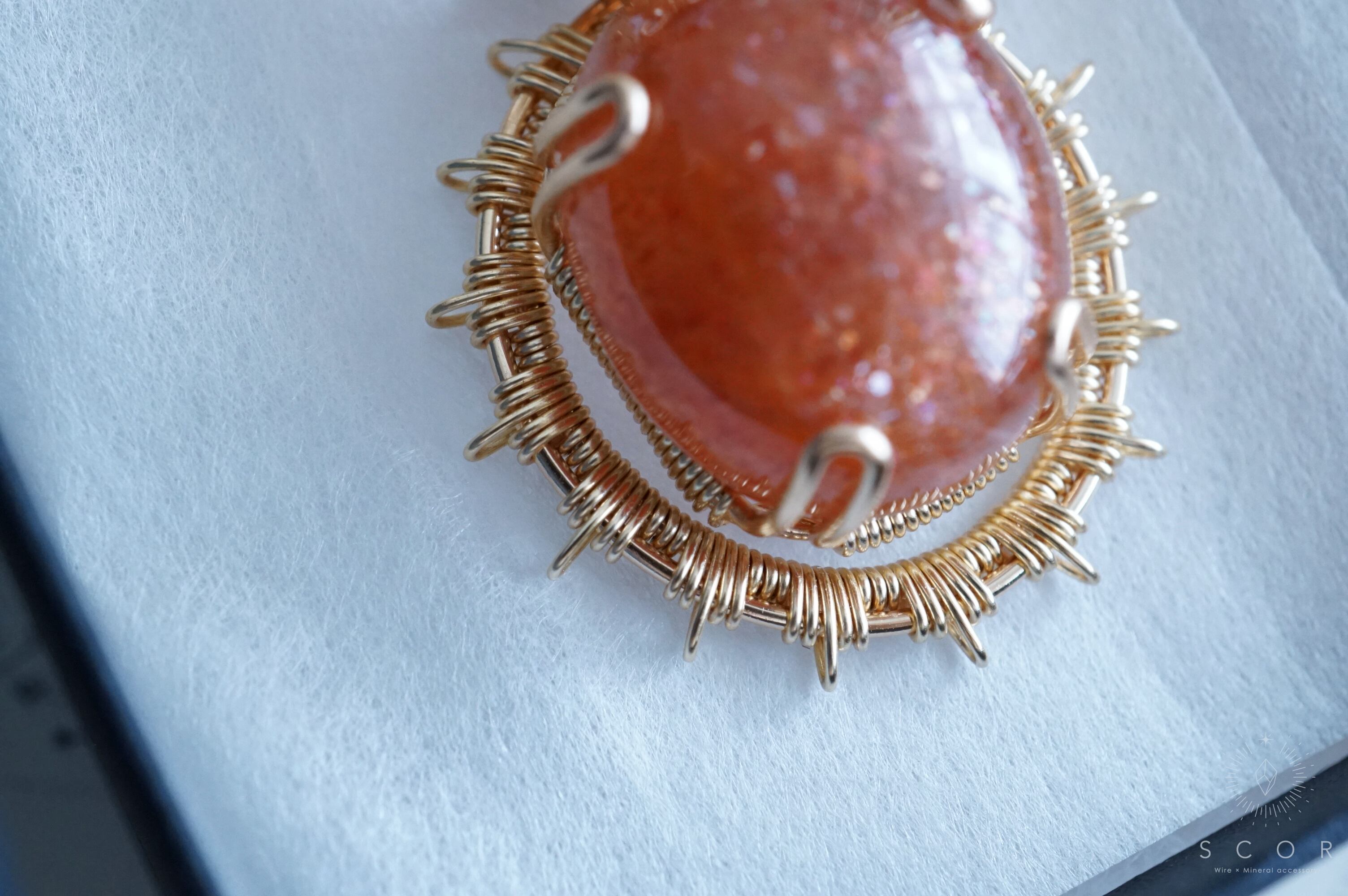 サンストーンは、厚みのある楕円形のカボションを使用。