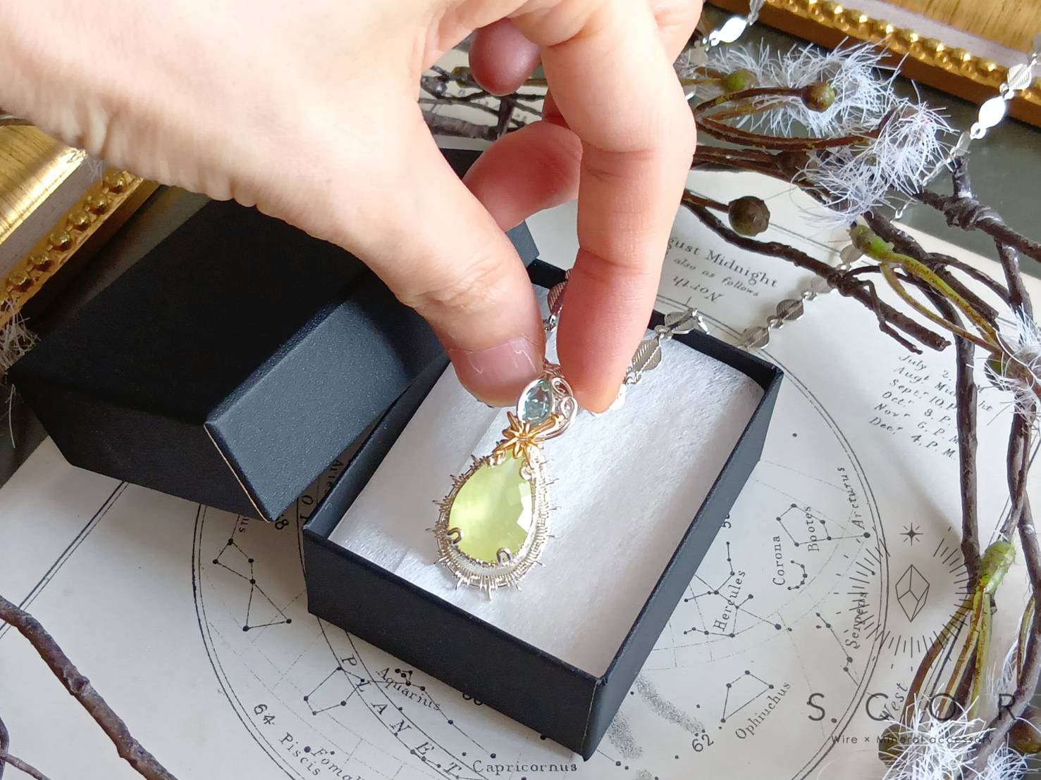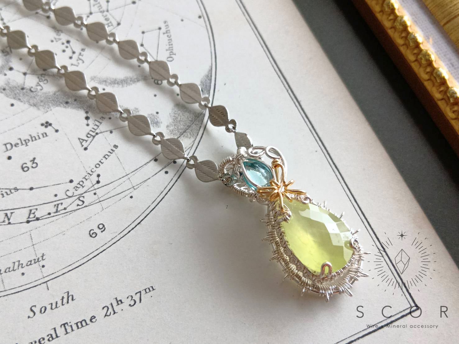シルバー色のネックレスチェーンと合わせると、ゴールド色の光芒モチーフとプレナイトの石色が際立ち、クールな雰囲気に。