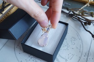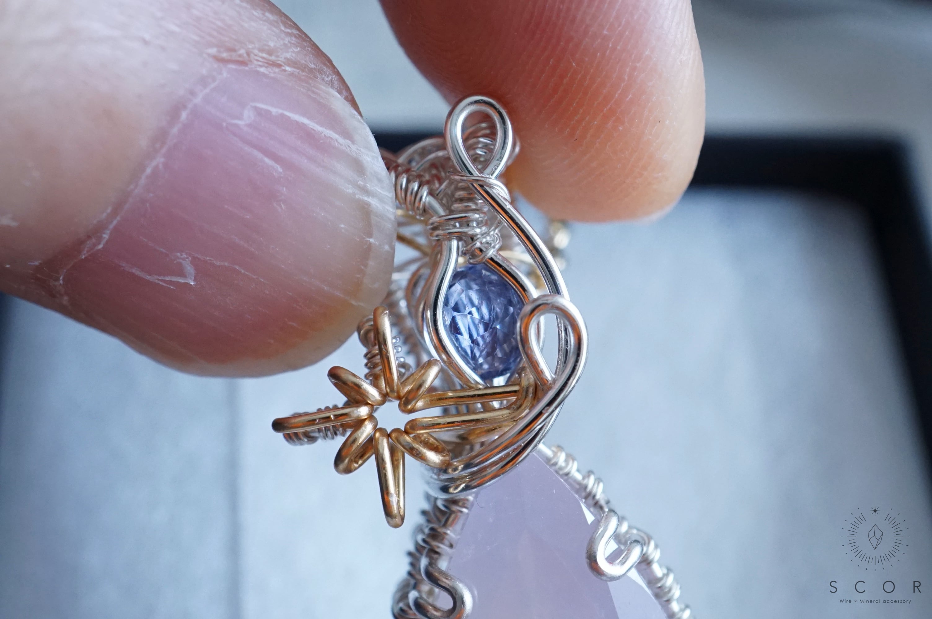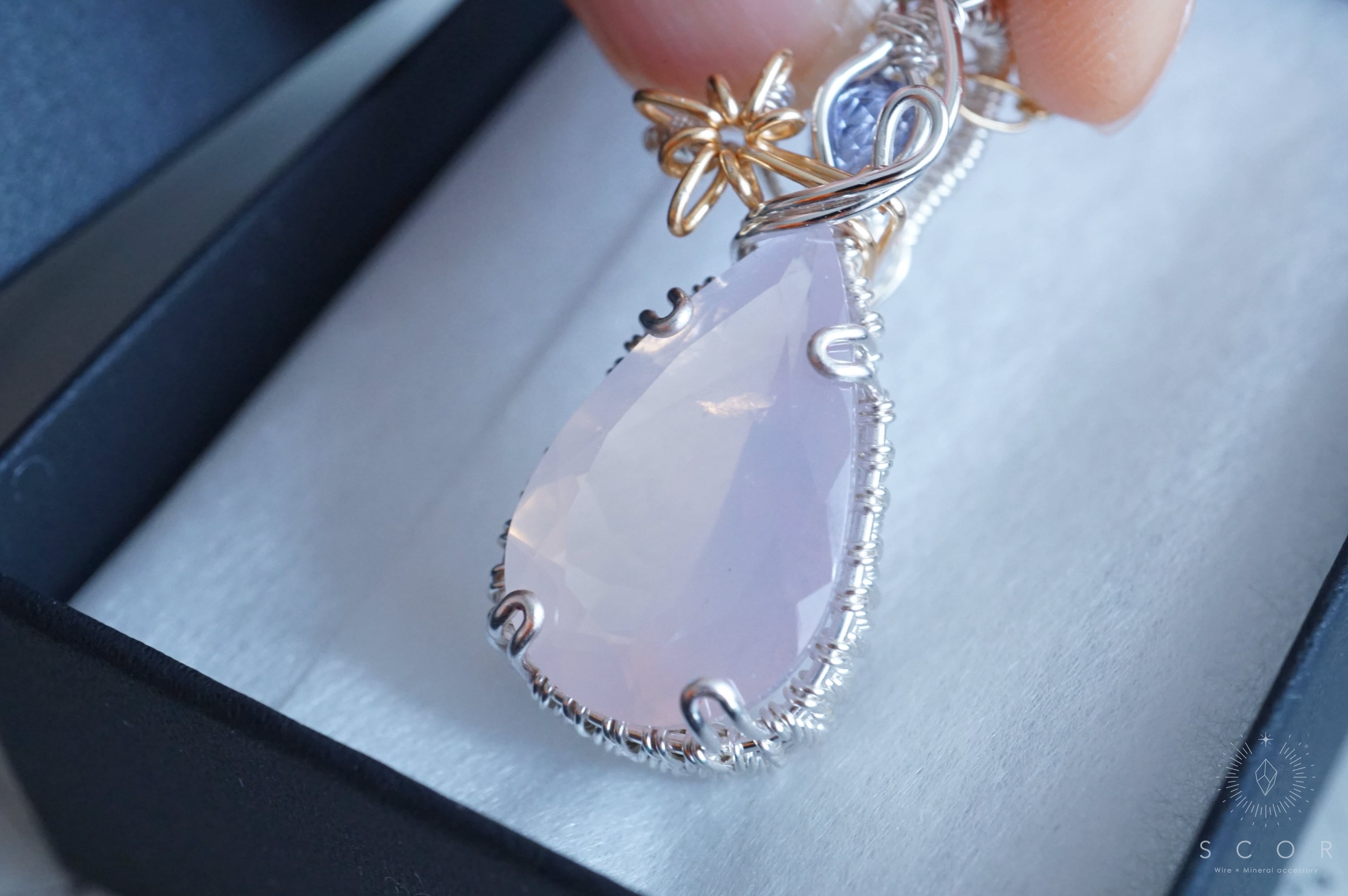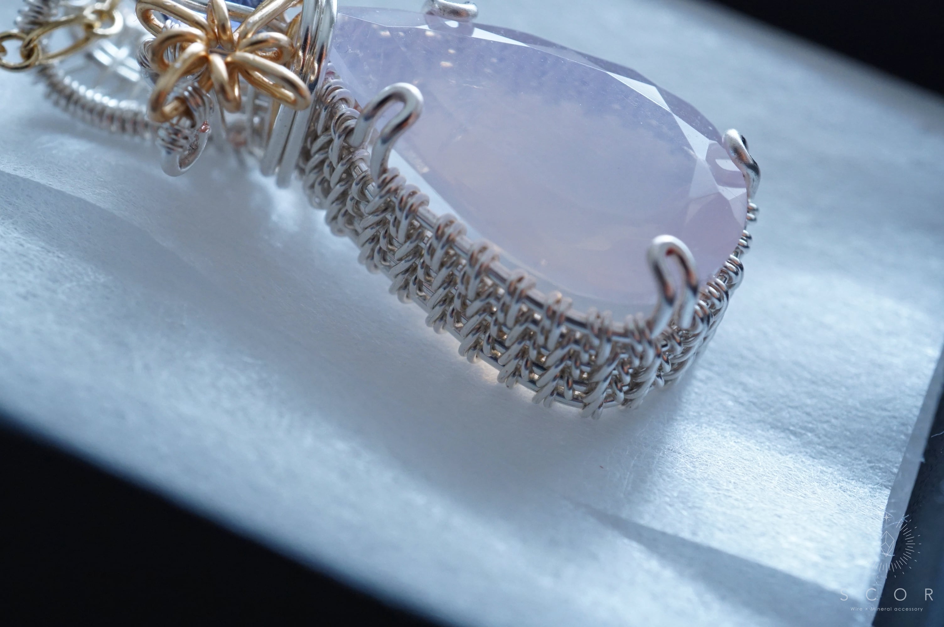 ラベンダーローズクオーツは、ペアシェイプのファセットカットのピースを使用。