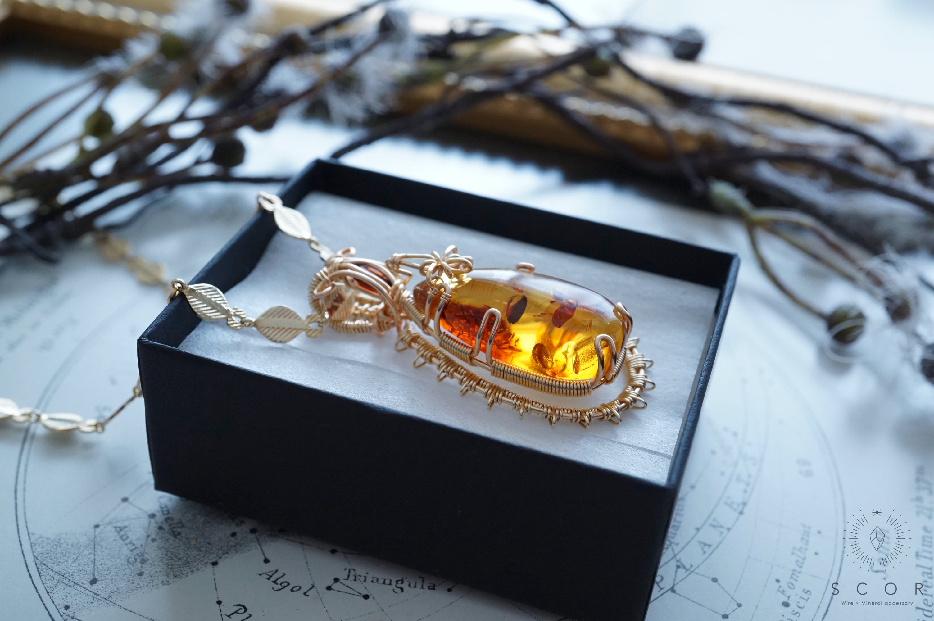 アンバーに重ねた光芒型のワイヤーモチーフは一等星を表現。