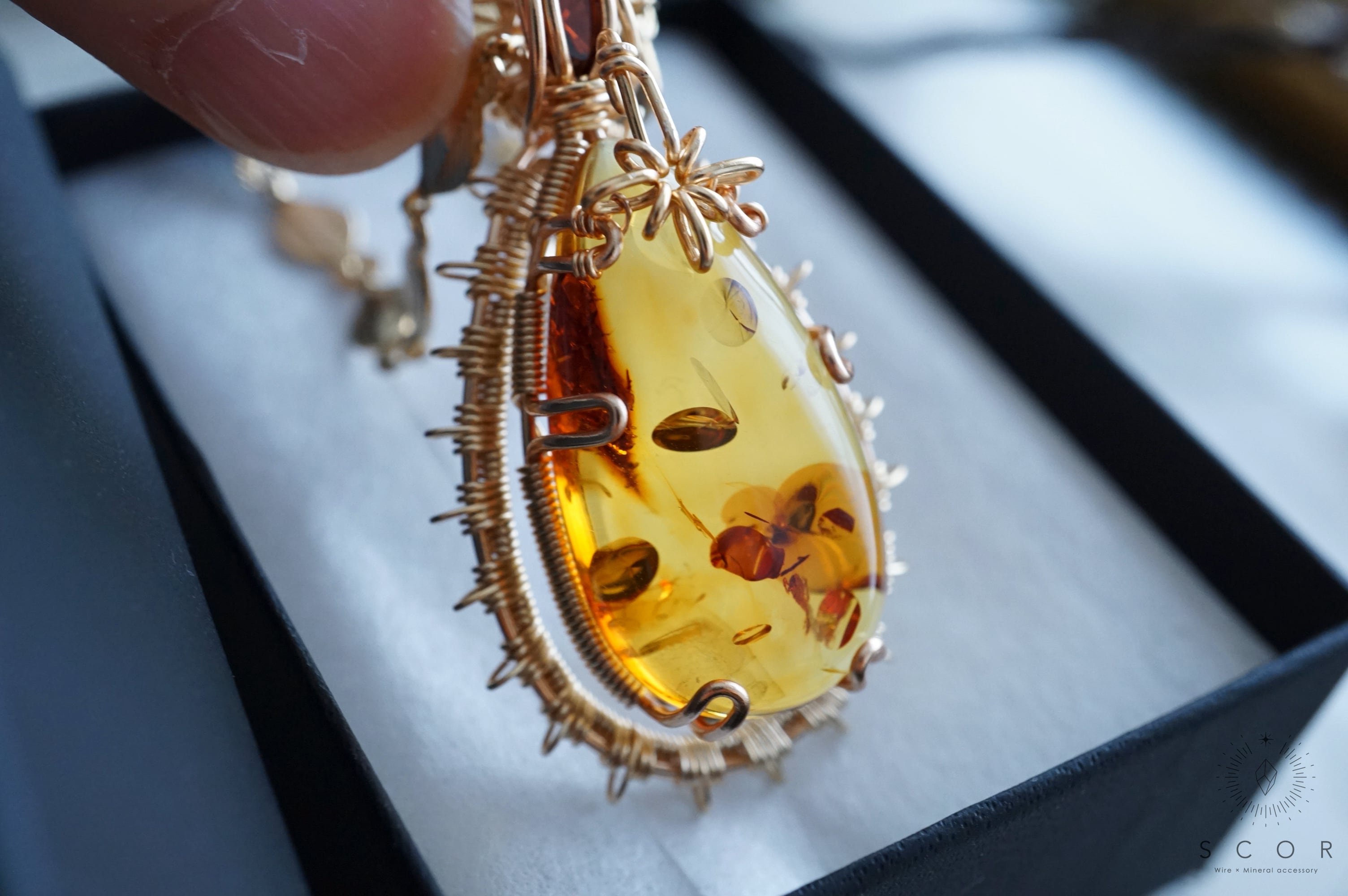 アンバーは、厚みのあるペアシェイプのカボションを使用。