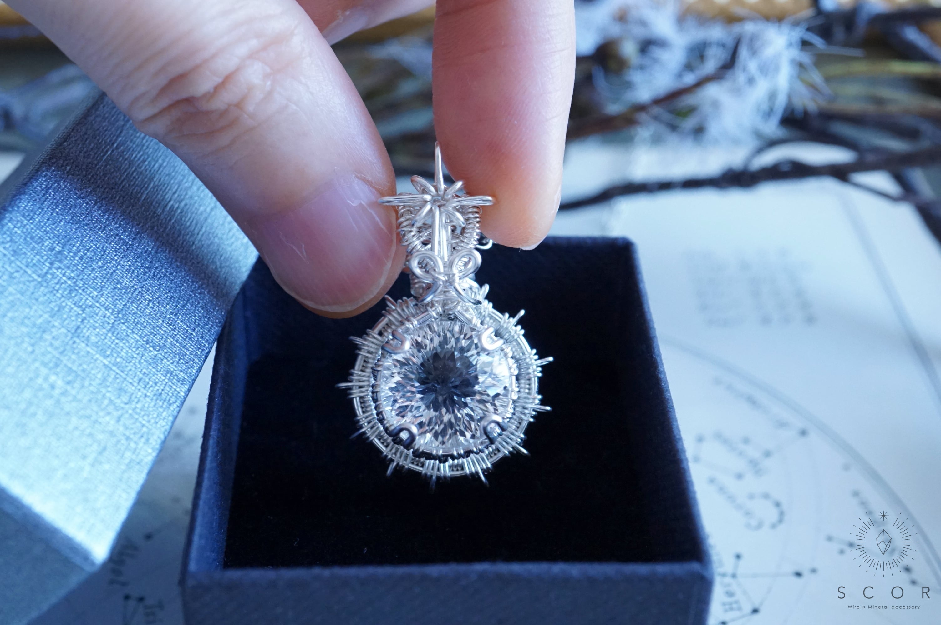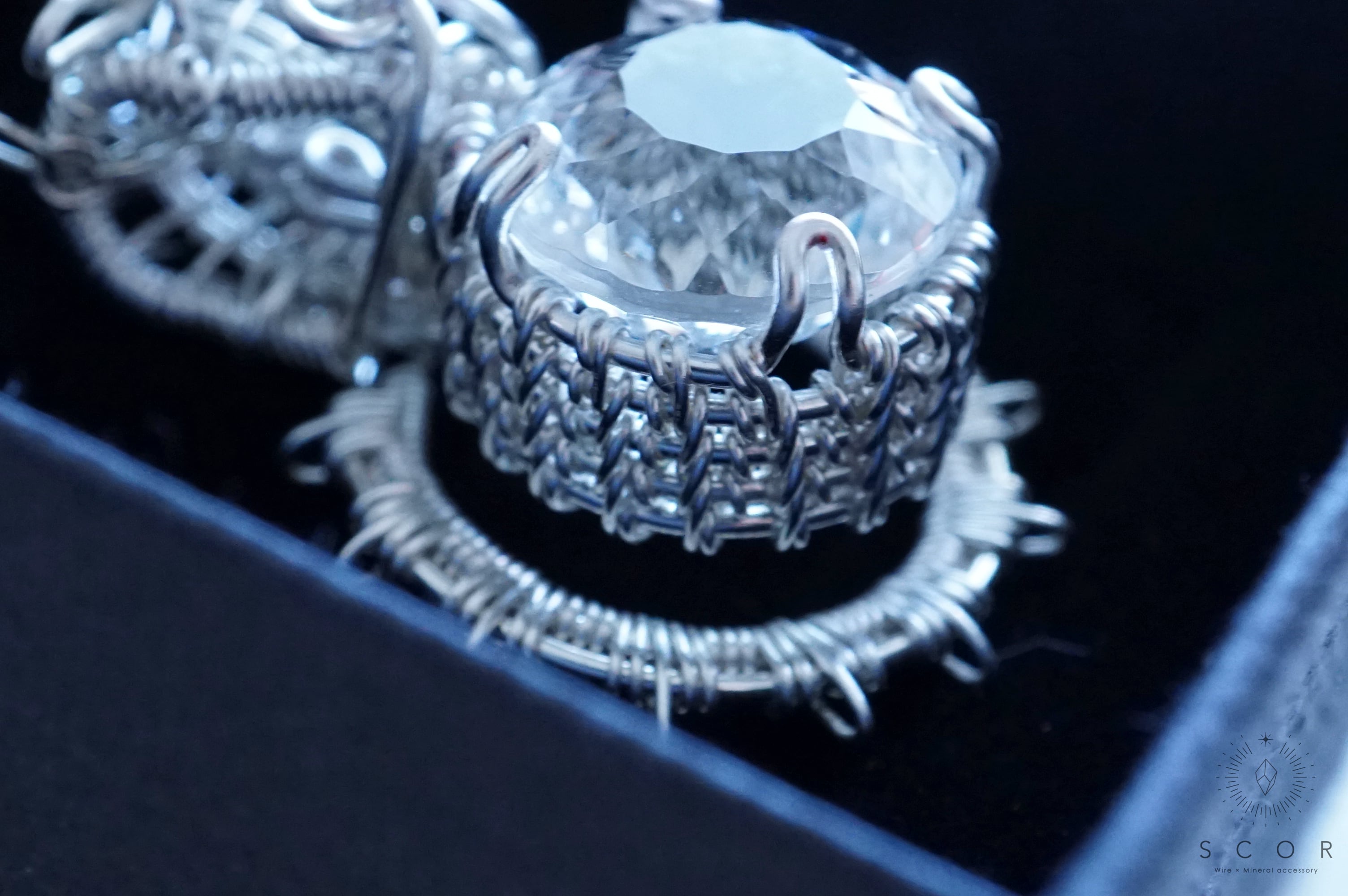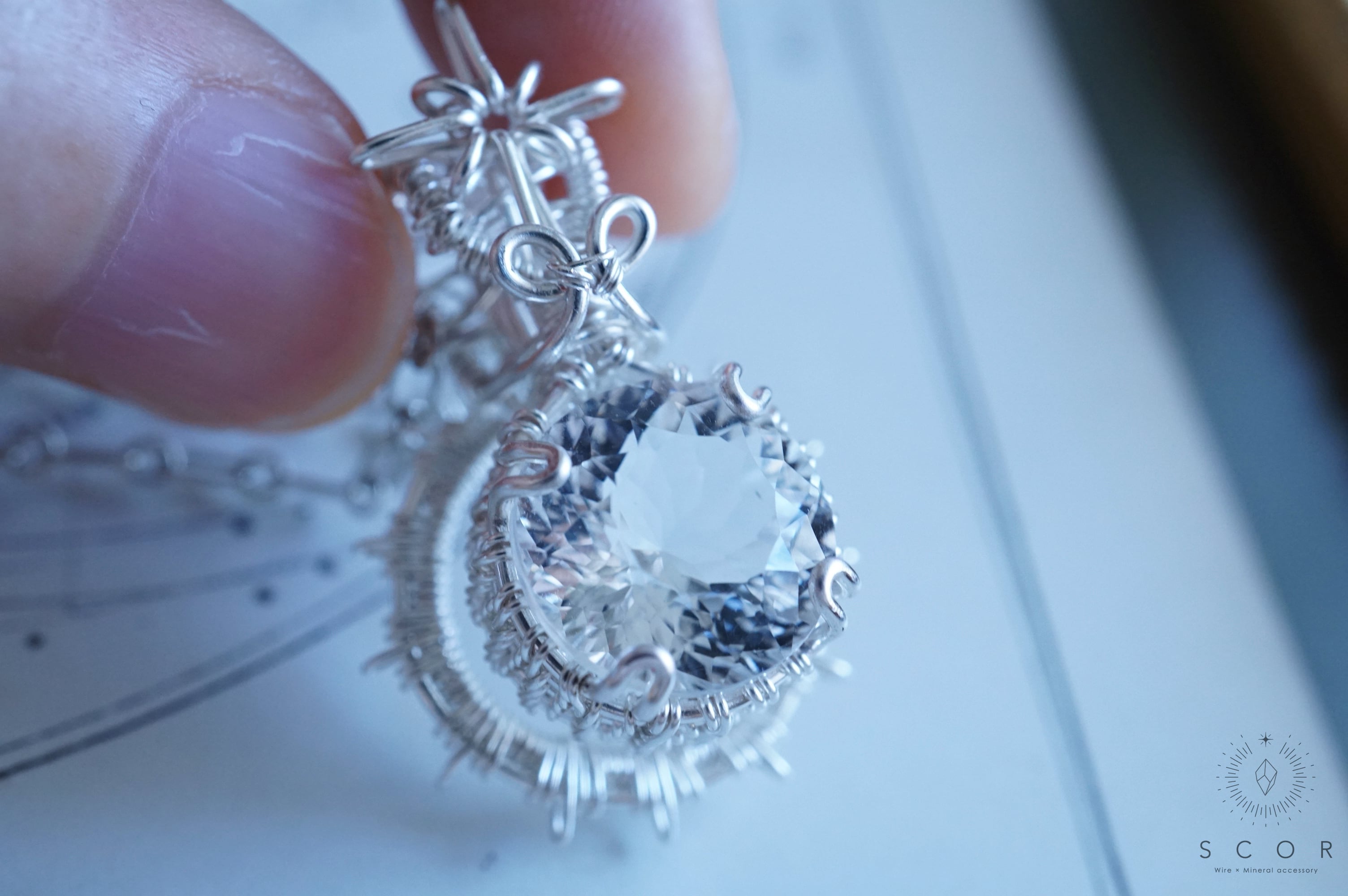 黒や濃い色の服と合わせると、水晶の透明感とファセットが描く模様が際立ちます。