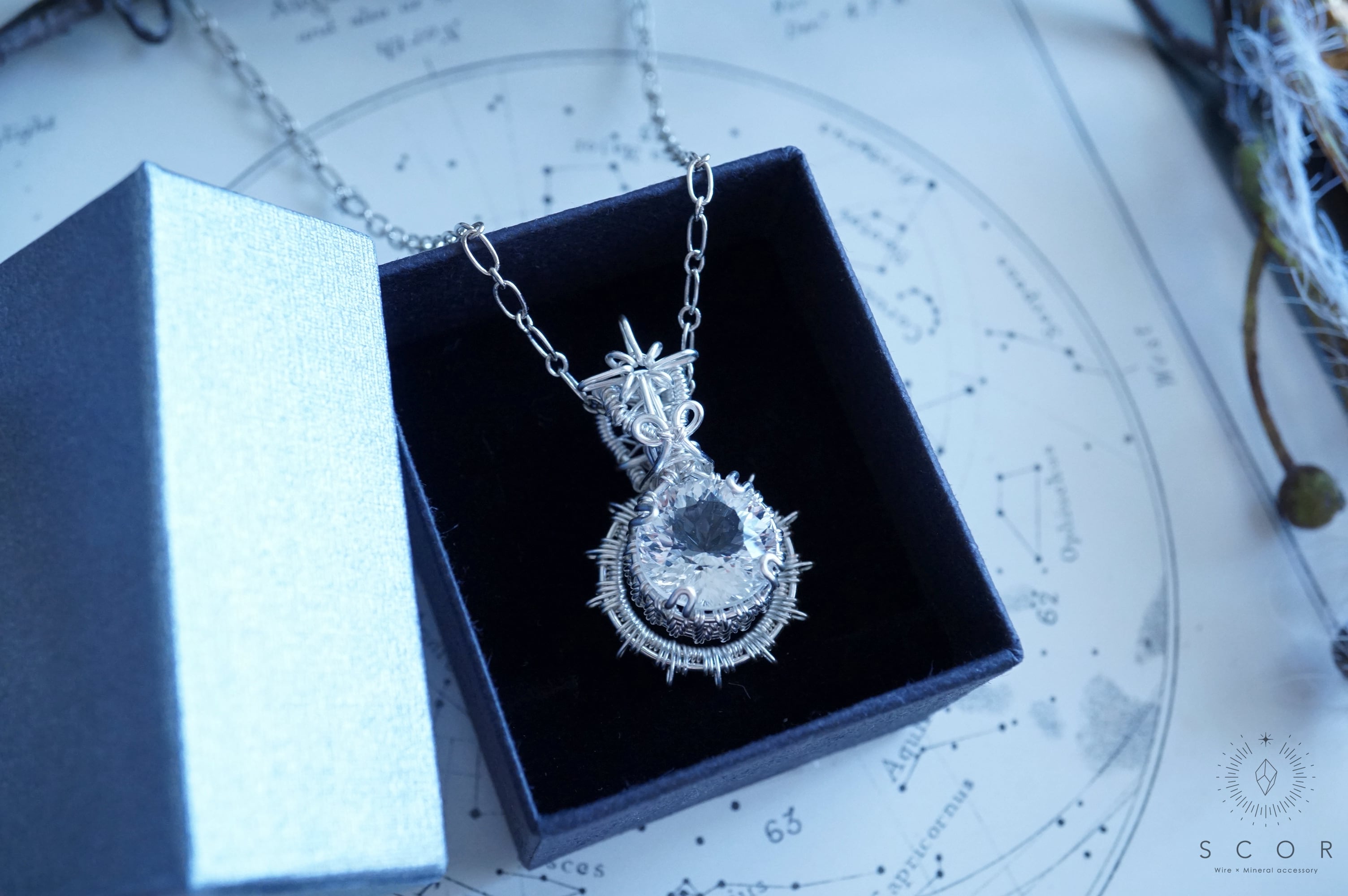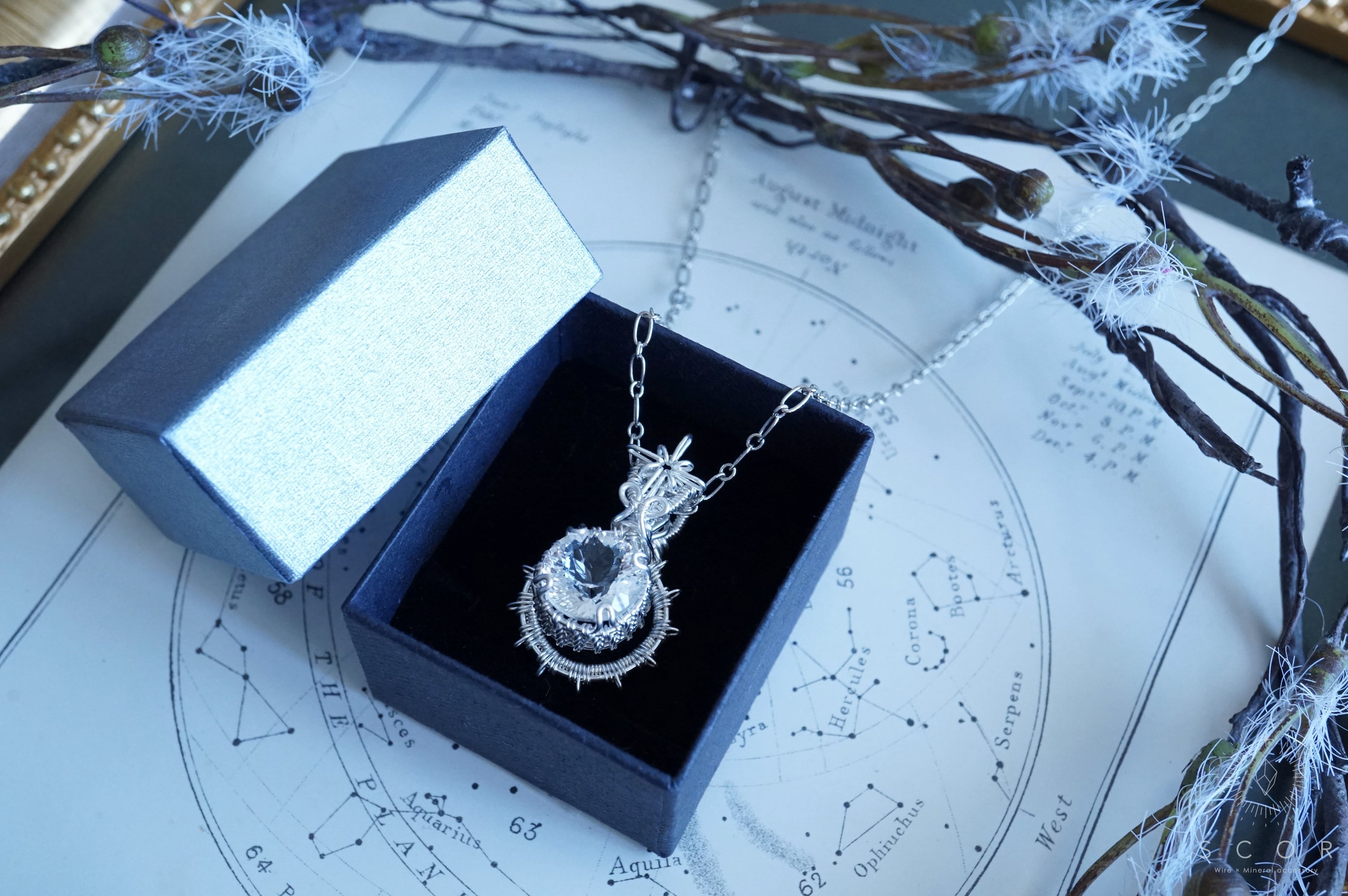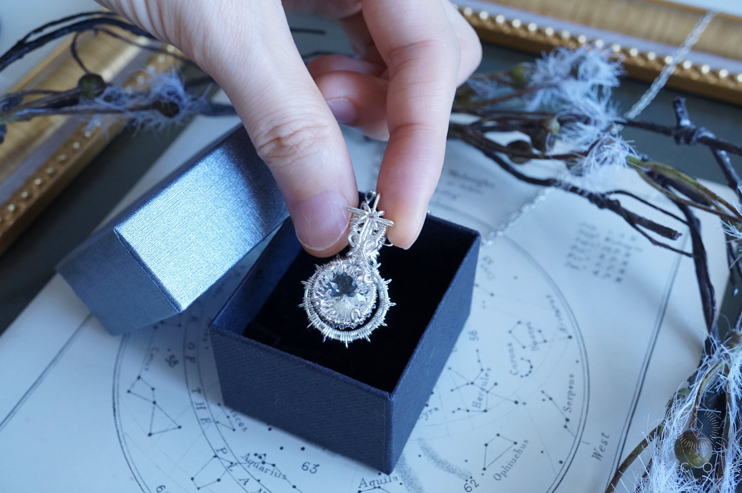 黒や濃い色の服と合わせると、水晶の透明感とファセットが描く模様が際立ちます。