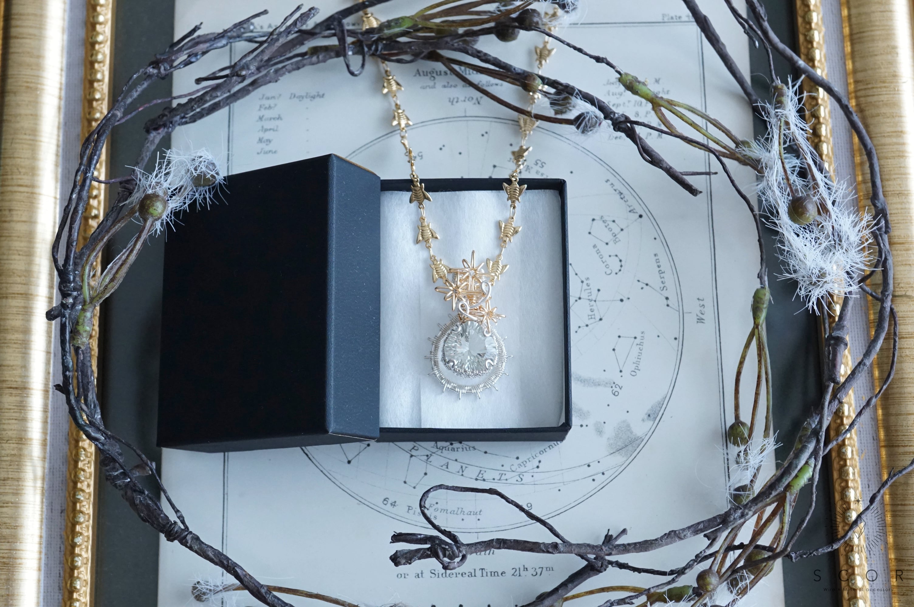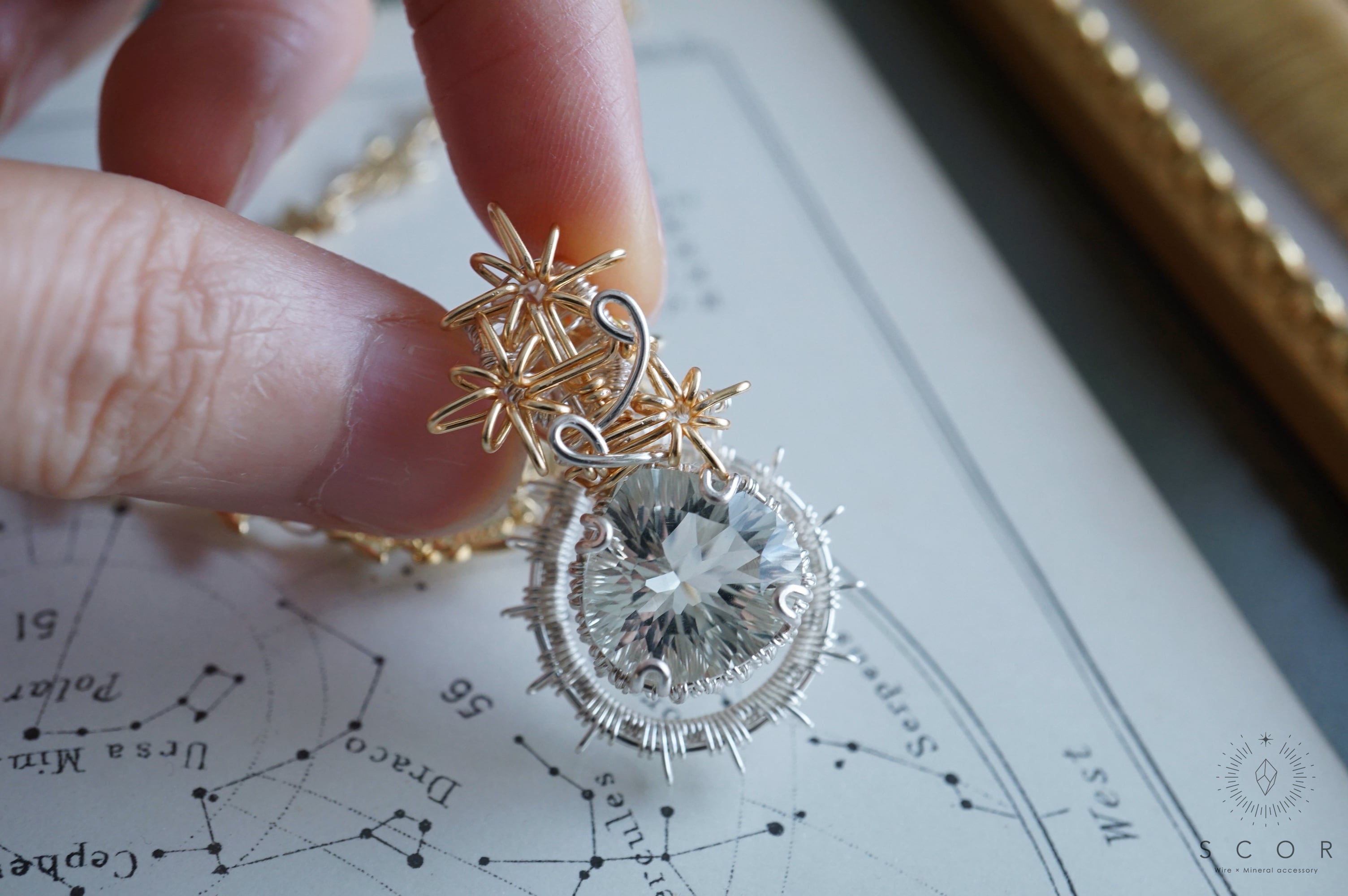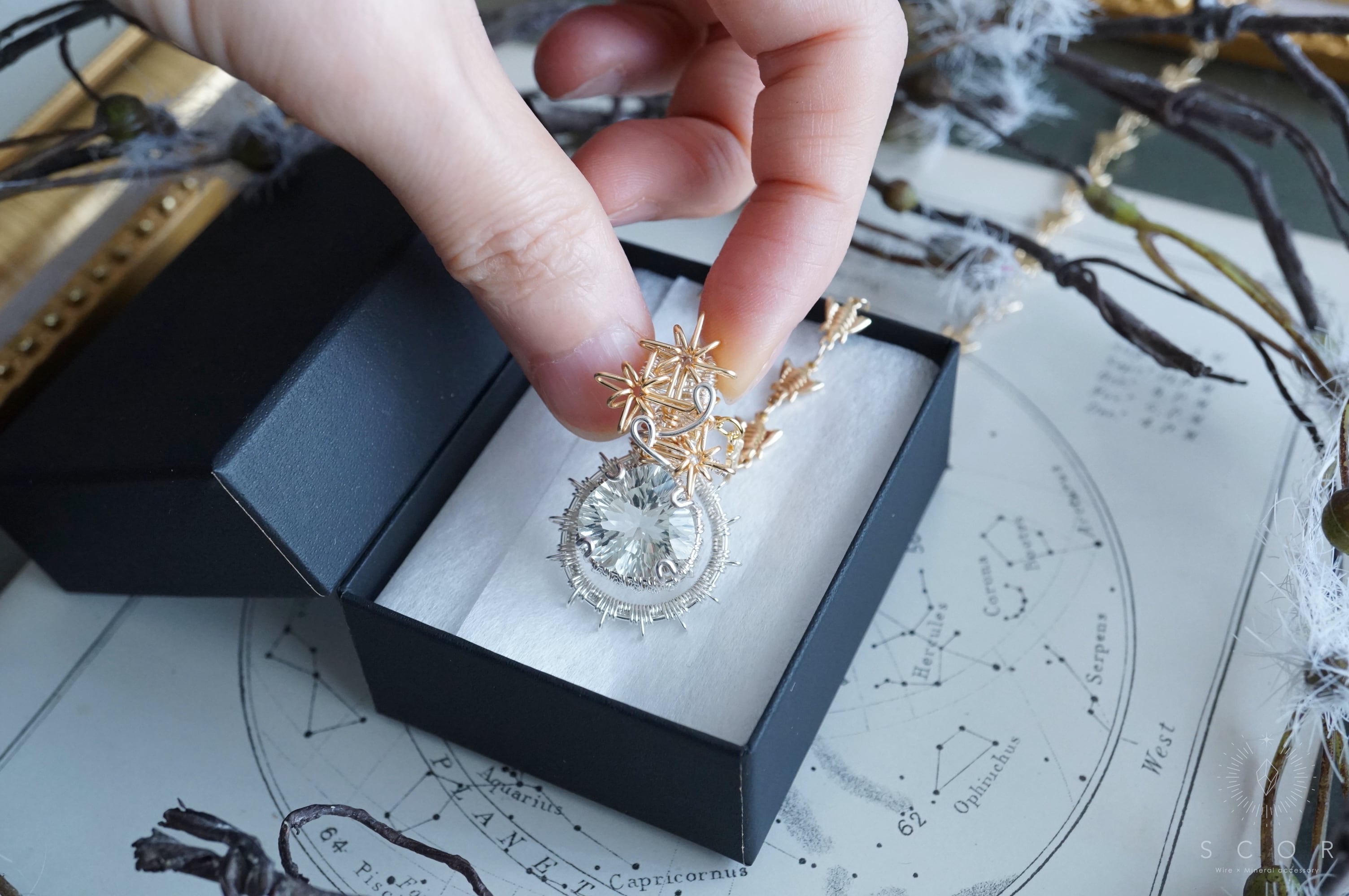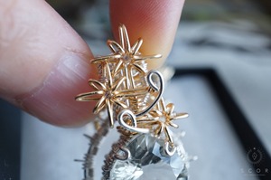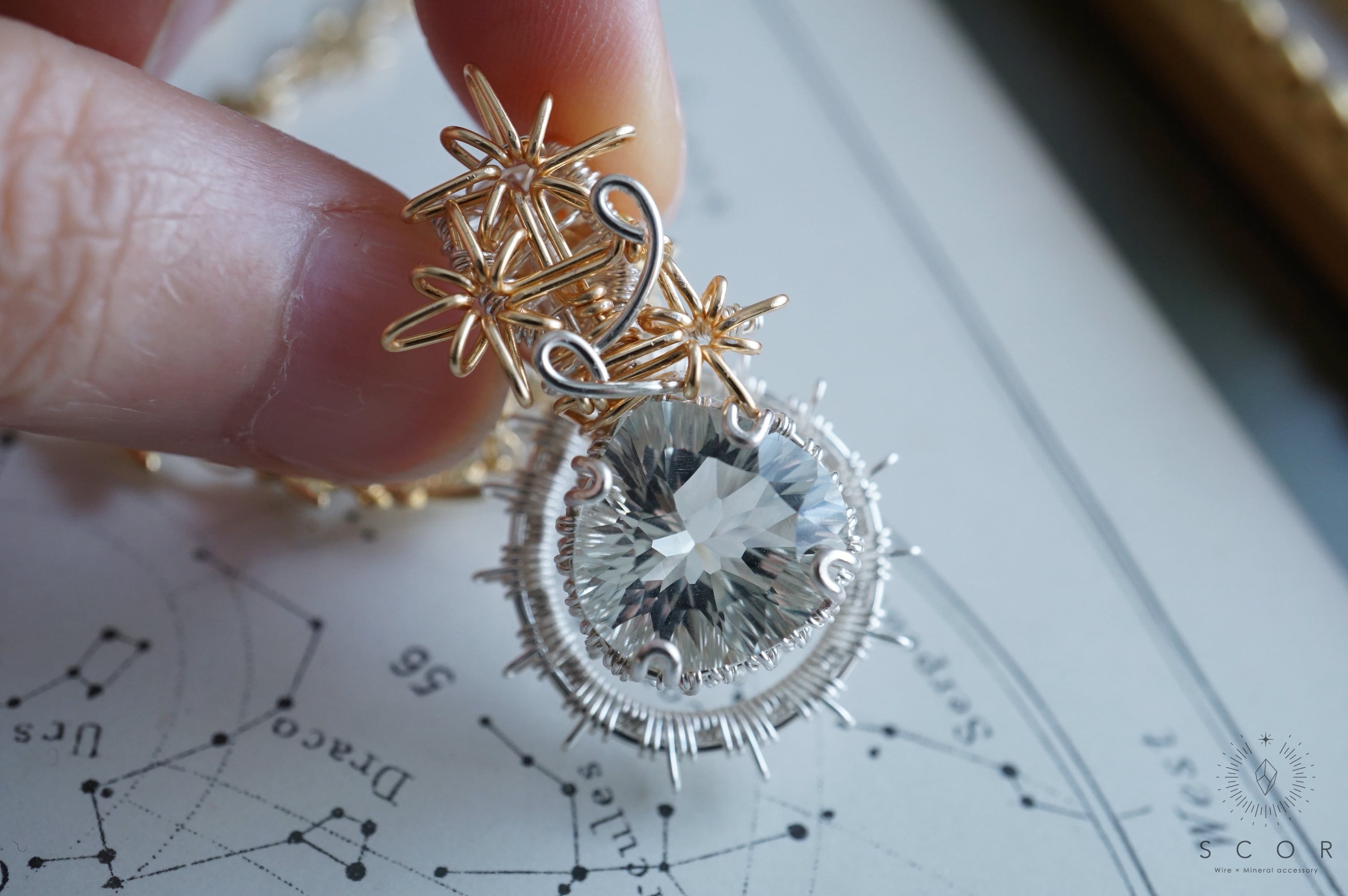 グリーンクオーツとルベライトの間に添えた光芒型のワイヤーモチーフは、流星のイメージ。
