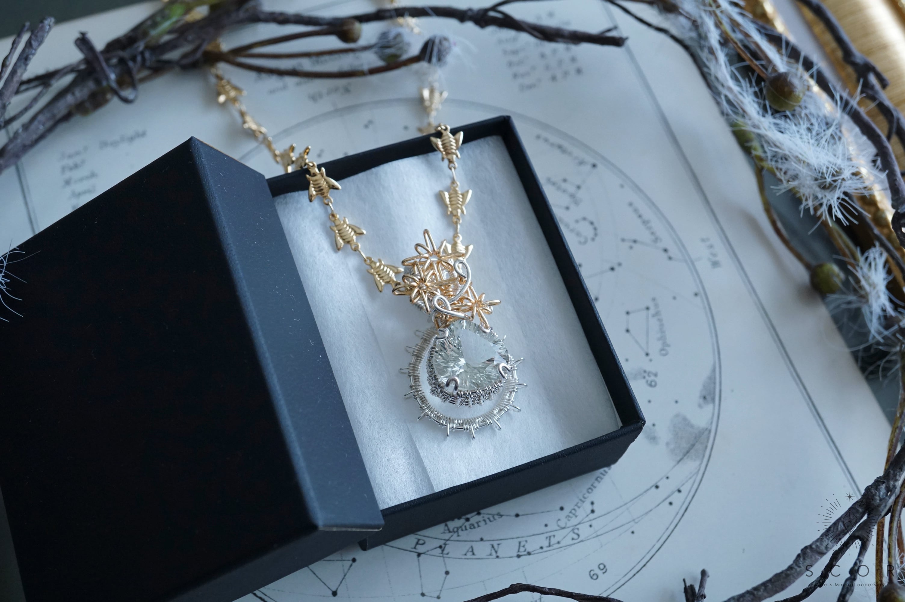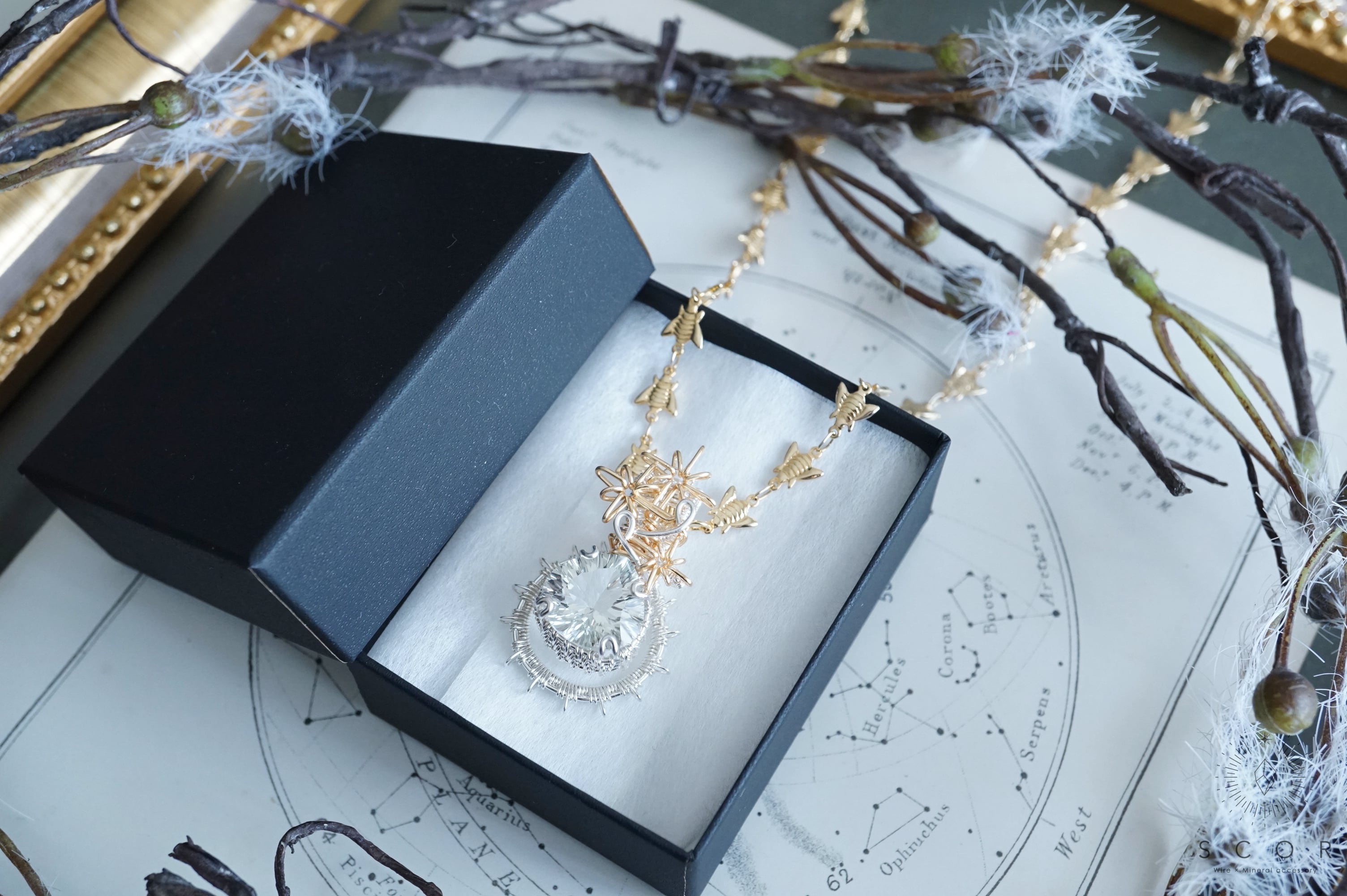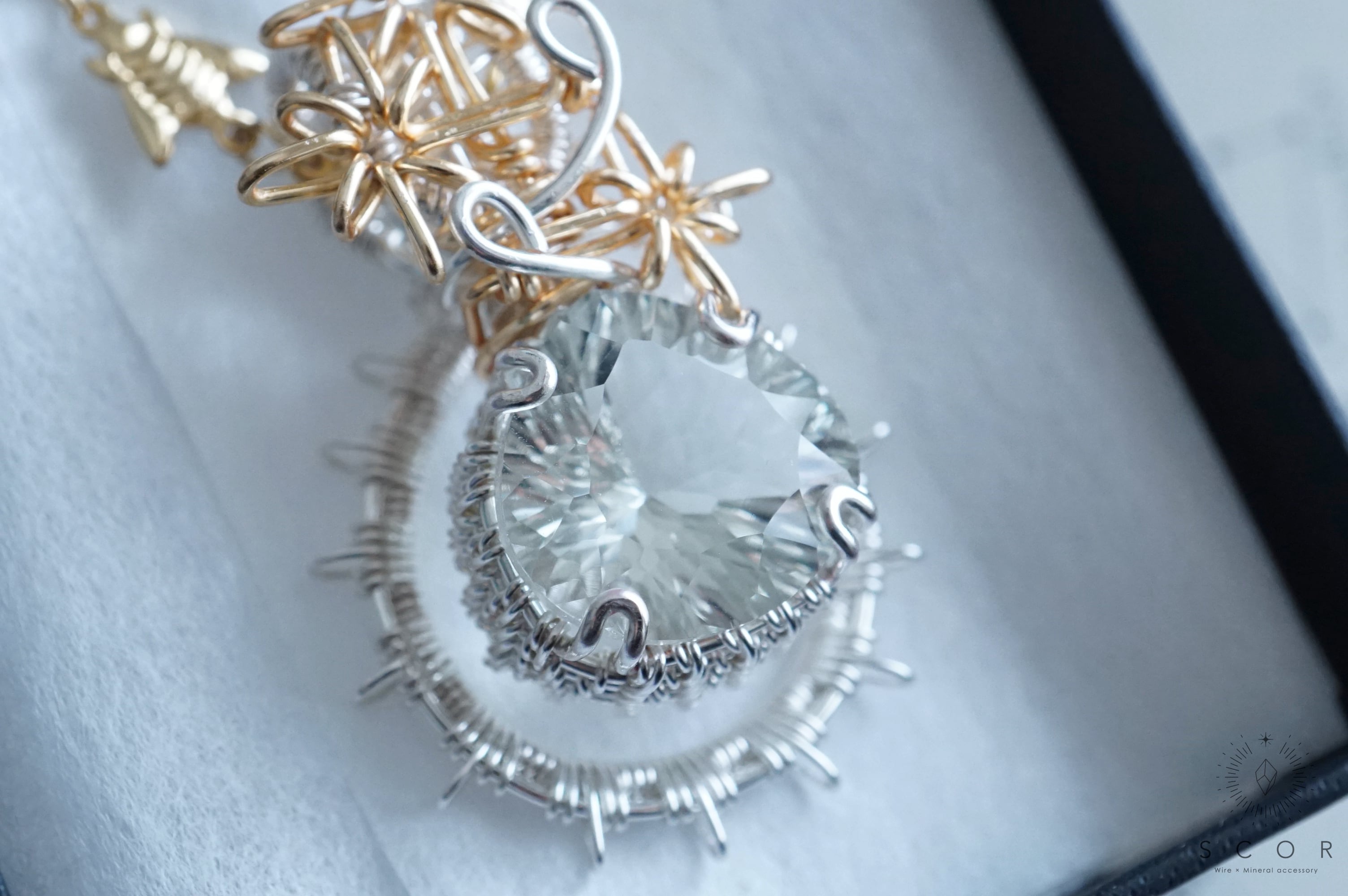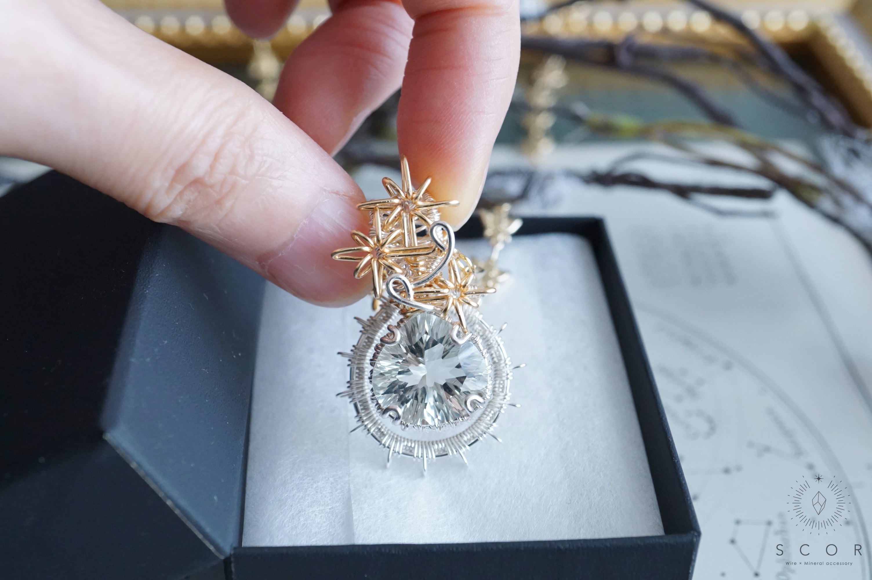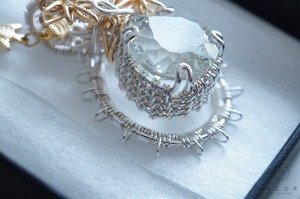 グリーンクオーツとルベライトの間に添えた光芒型のワイヤーモチーフは、流星のイメージ。