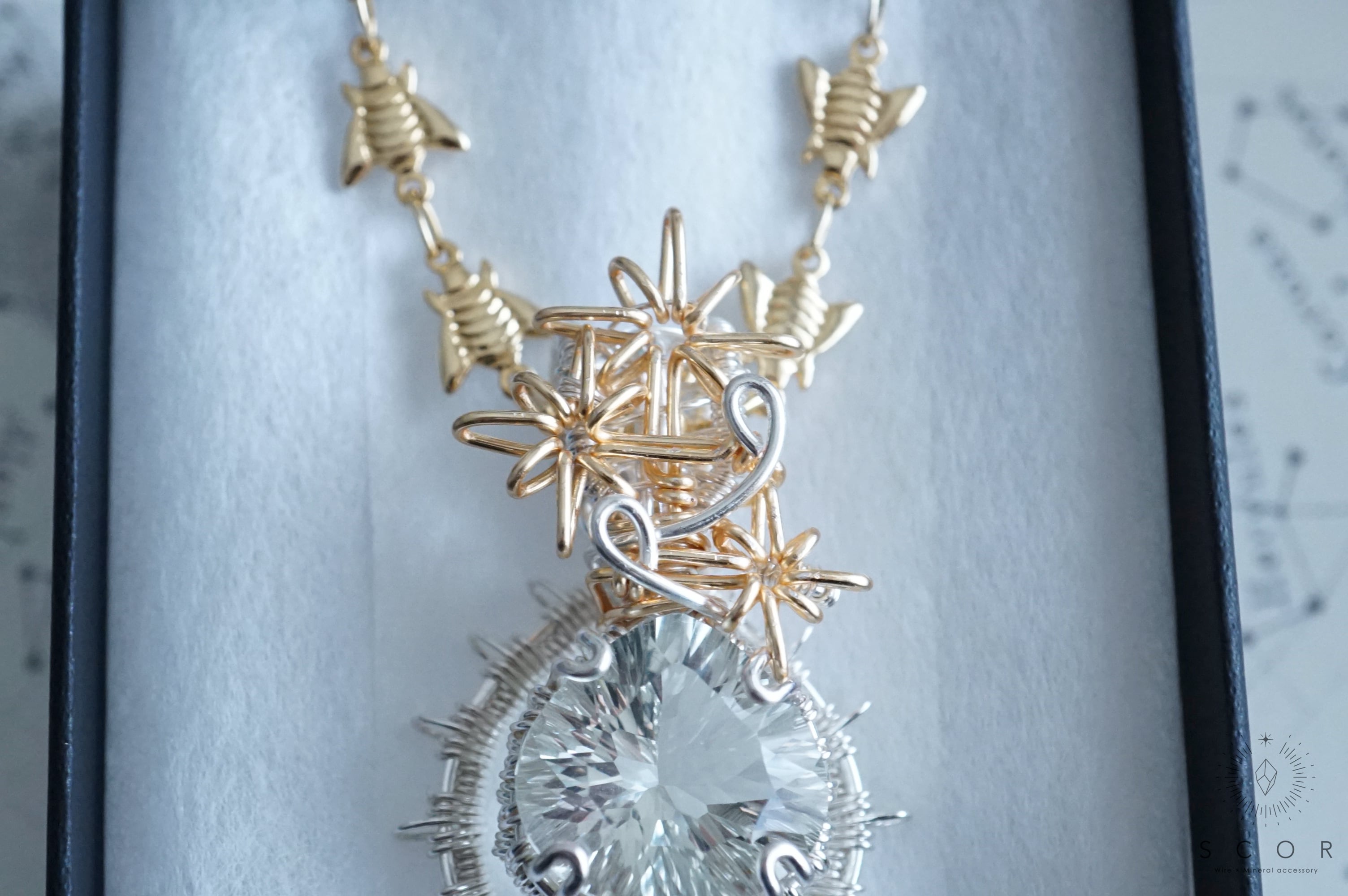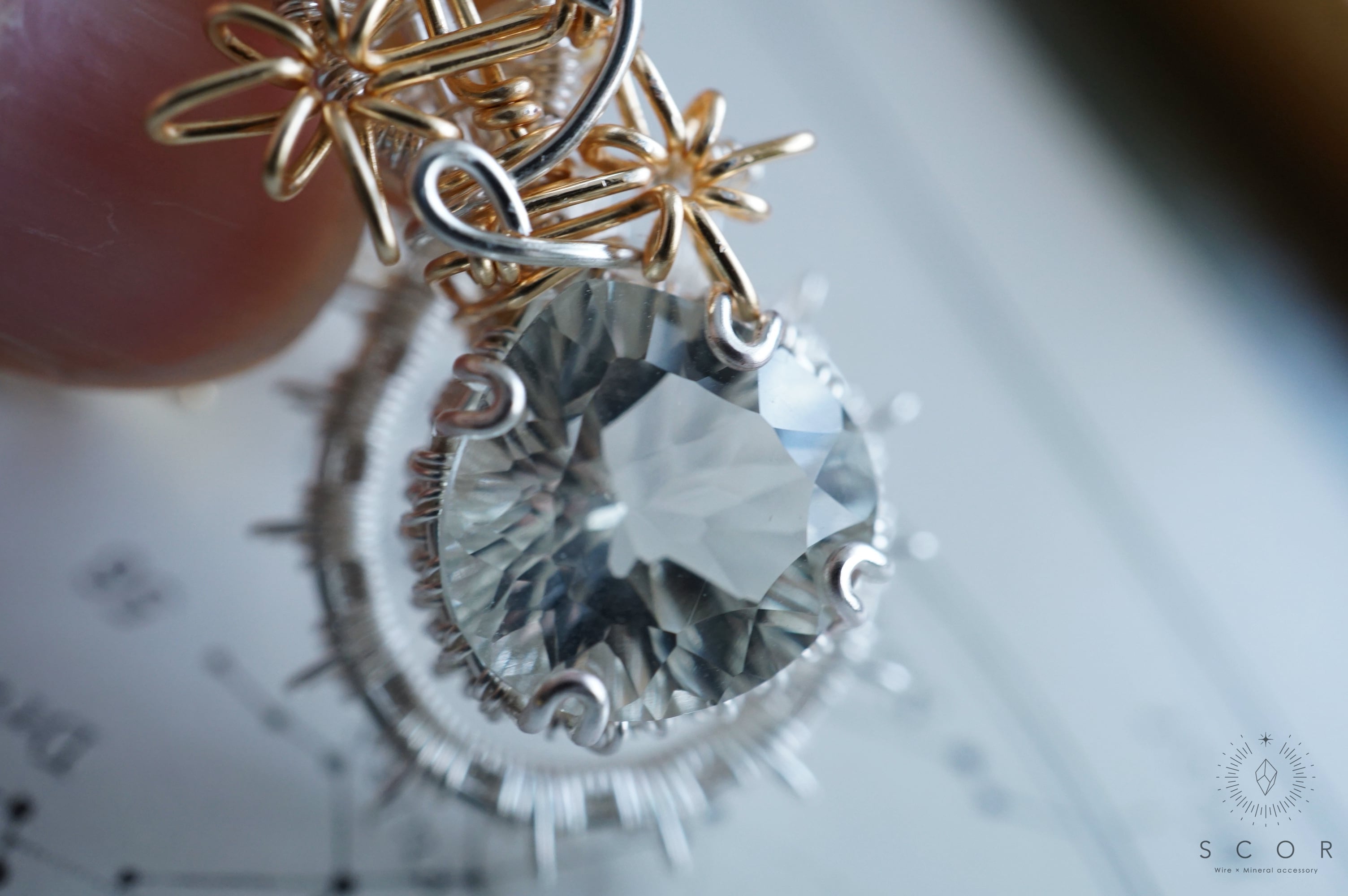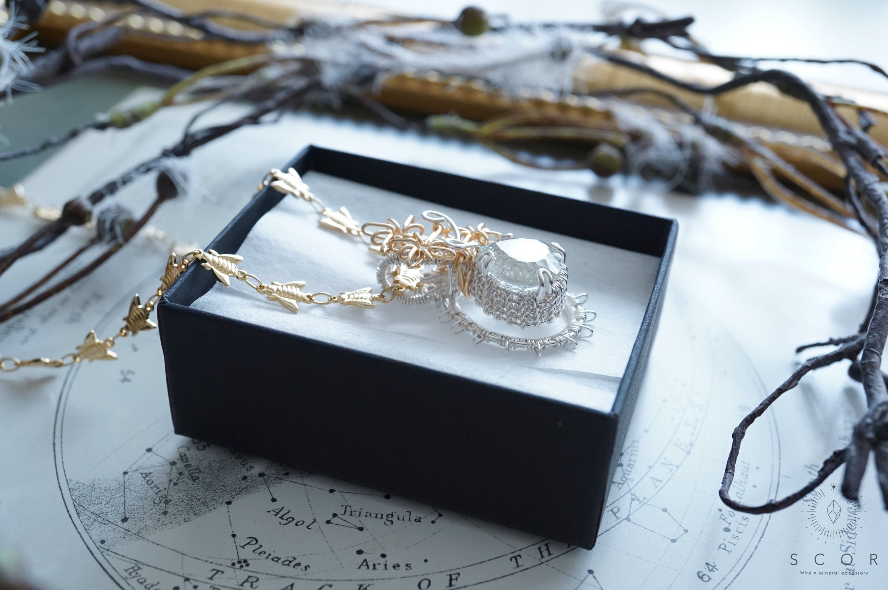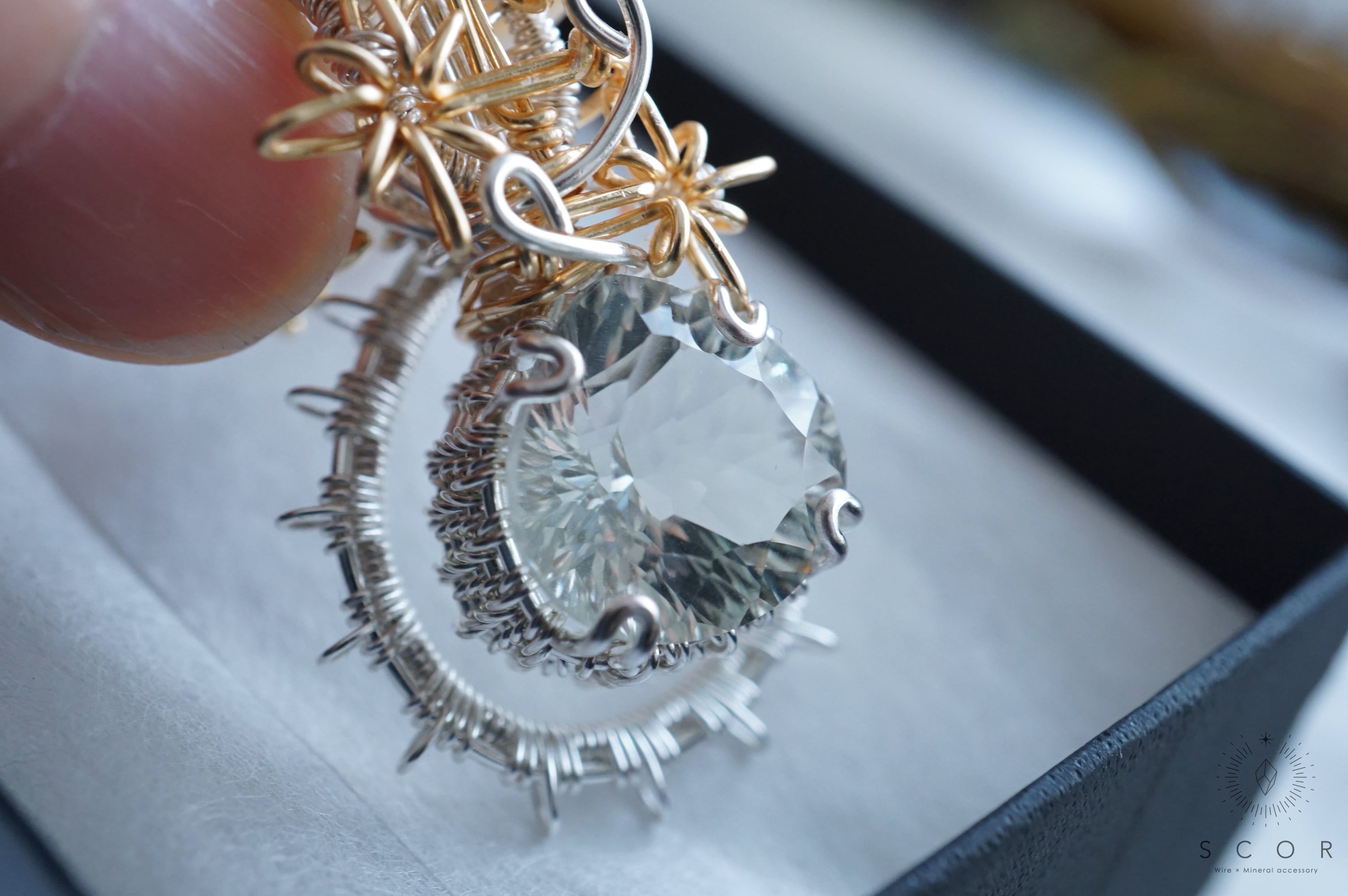 グリーンクオーツとルベライトの間に添えた光芒型のワイヤーモチーフは、流星のイメージ。