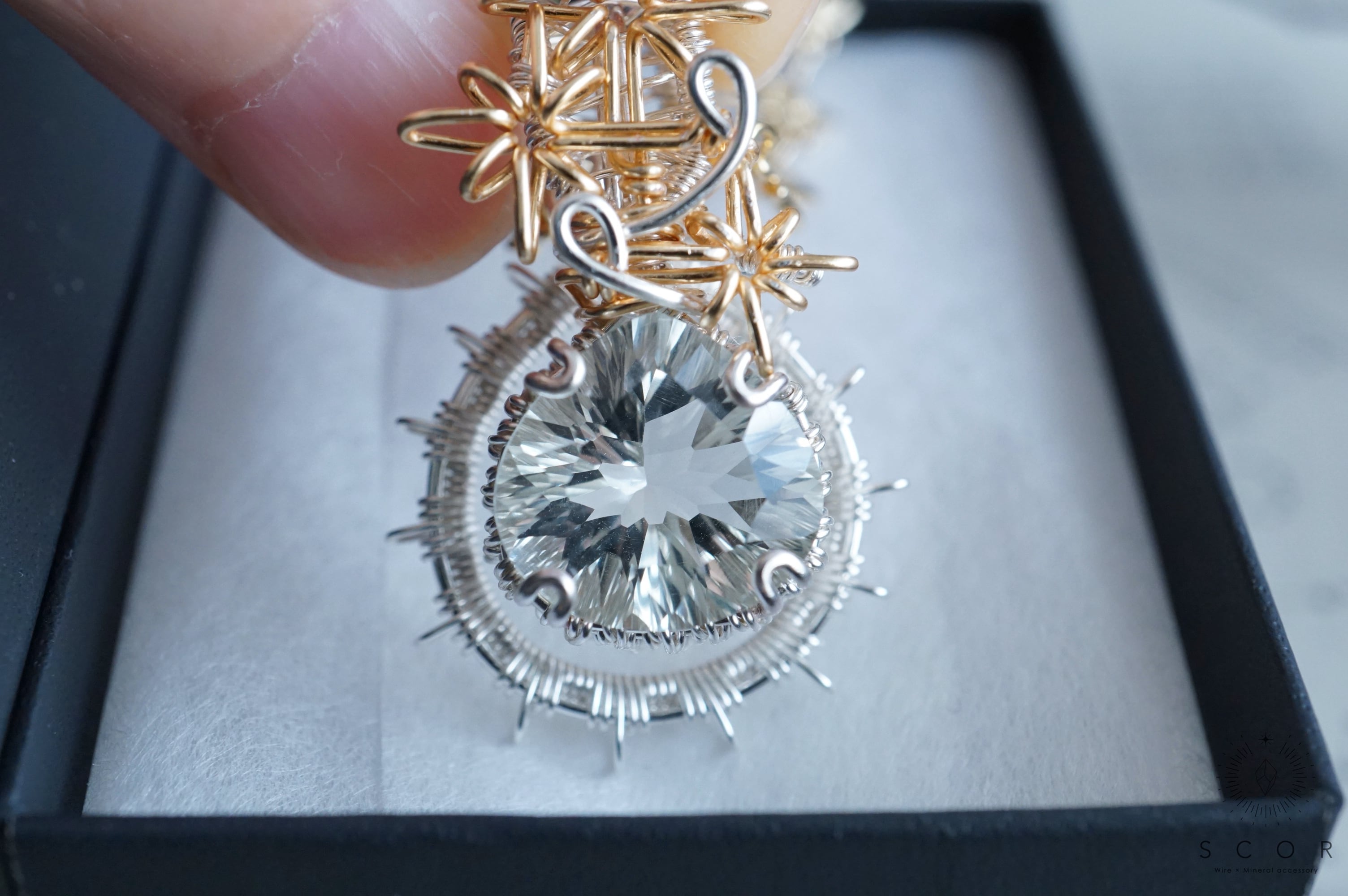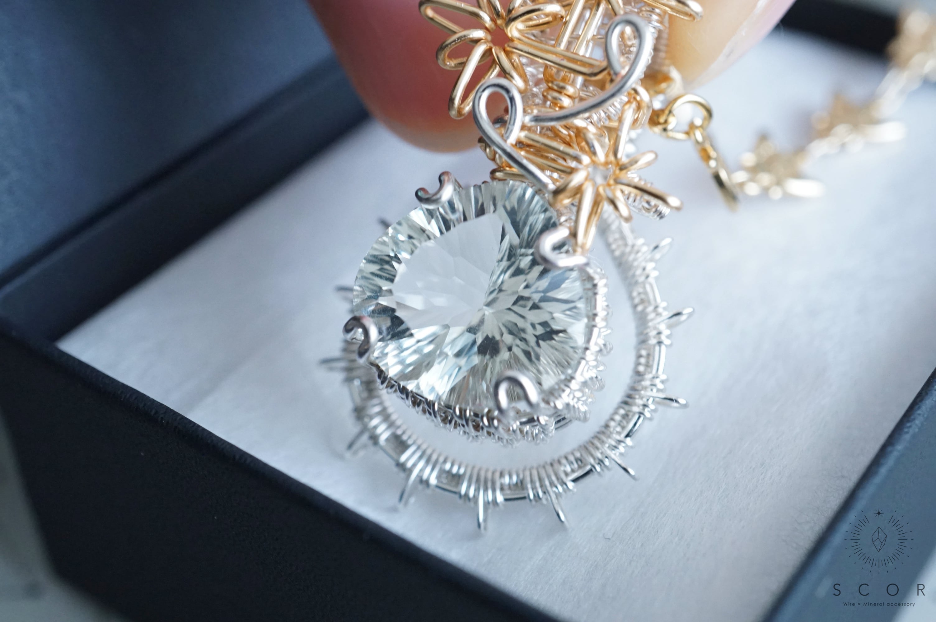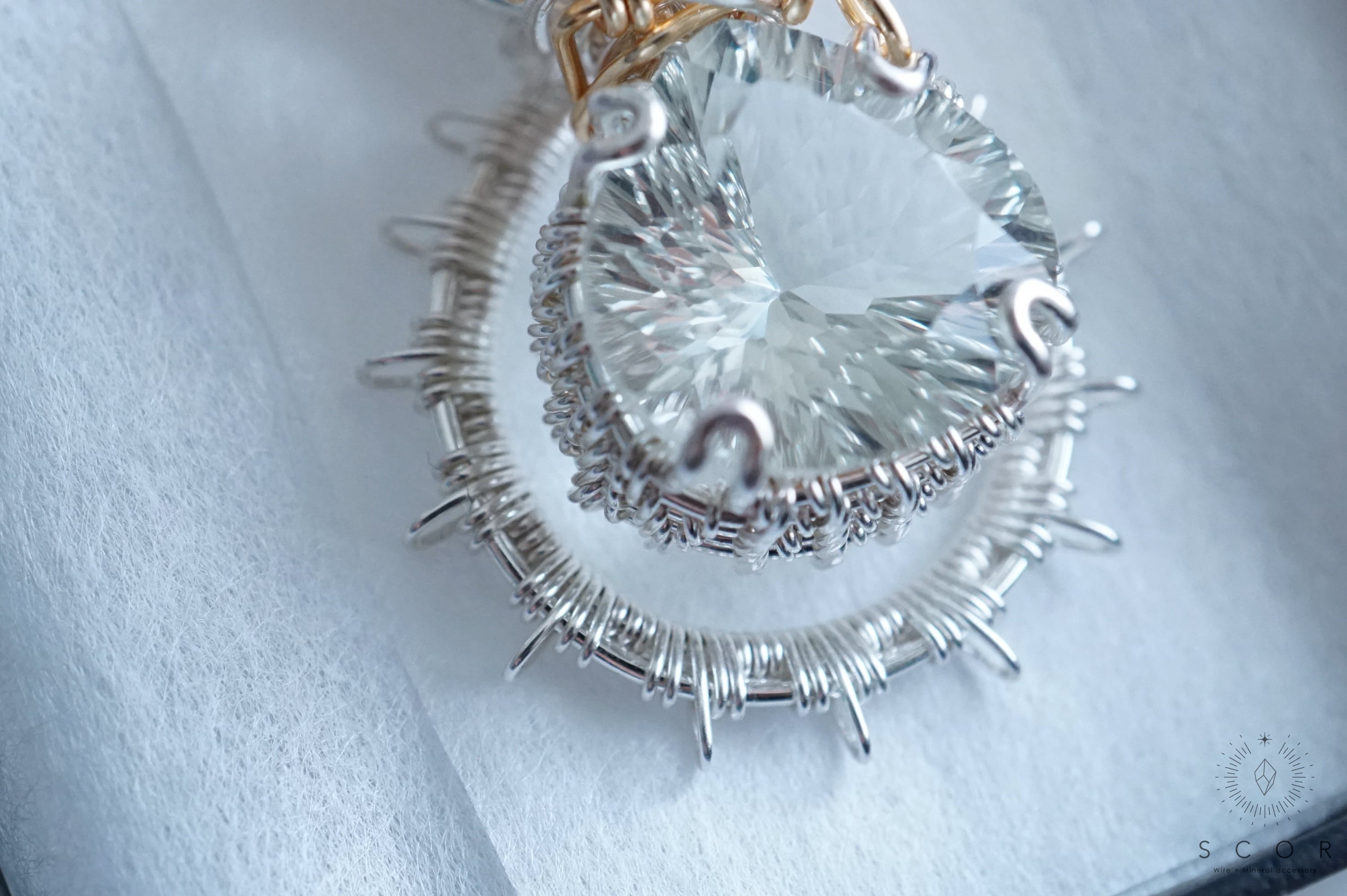 透明度が高く、裏面のファセット(小平面)カットによる、細かく、強い煌めきが印象的なピースです。
