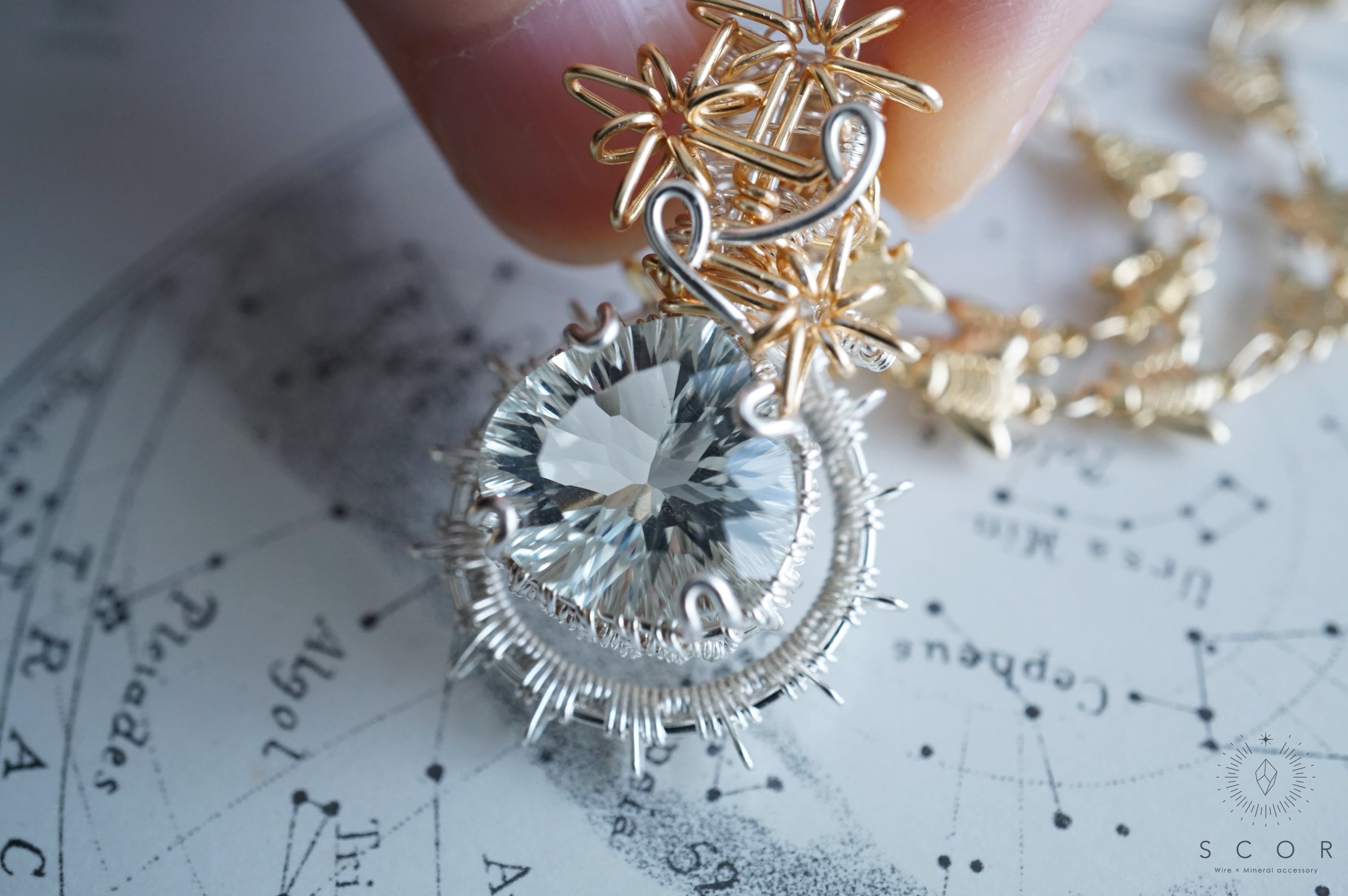 石を星に見立て、その放射光を細いワイヤー装飾(光背モチーフ)で表現したHaloシリーズ。