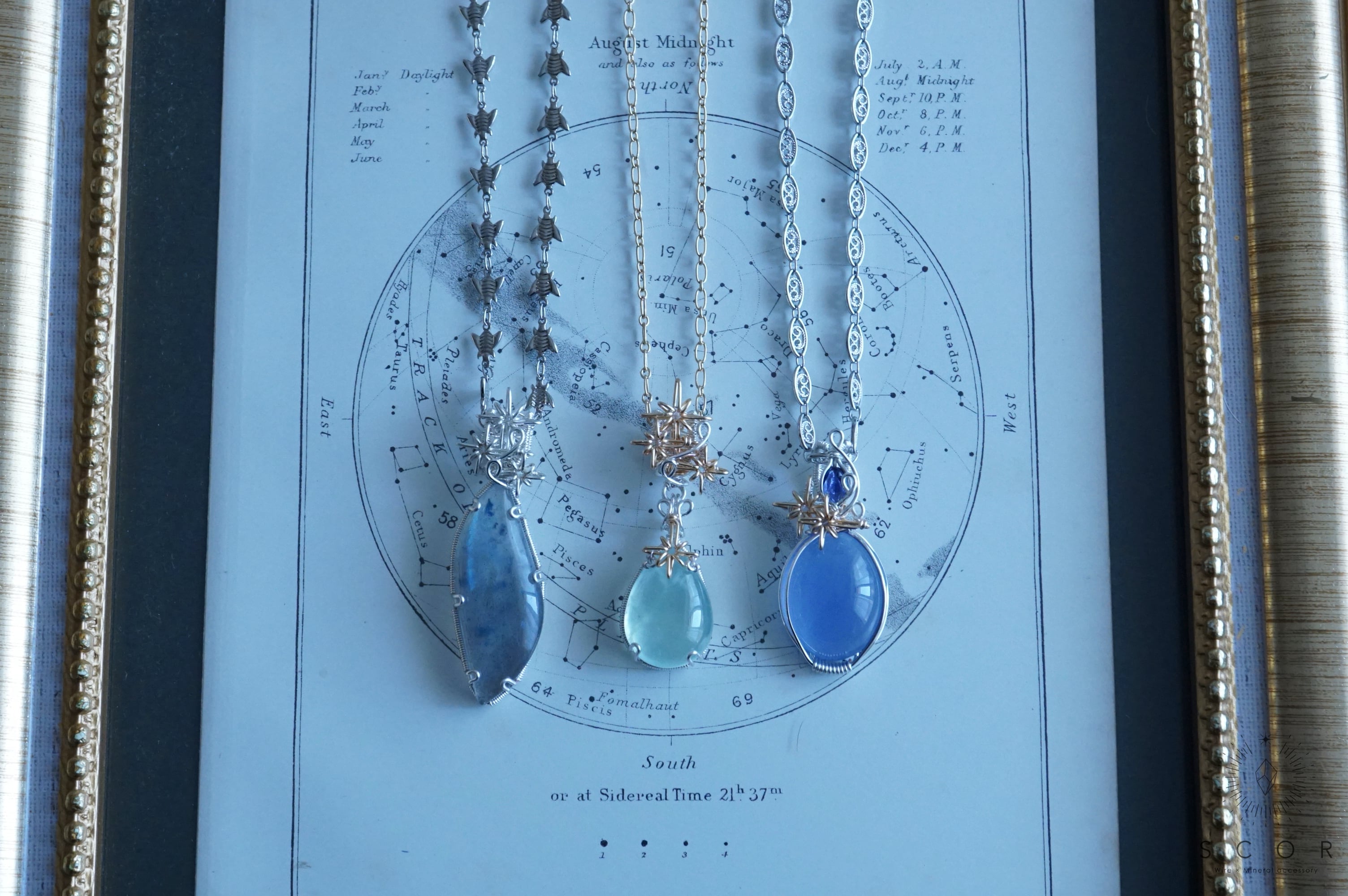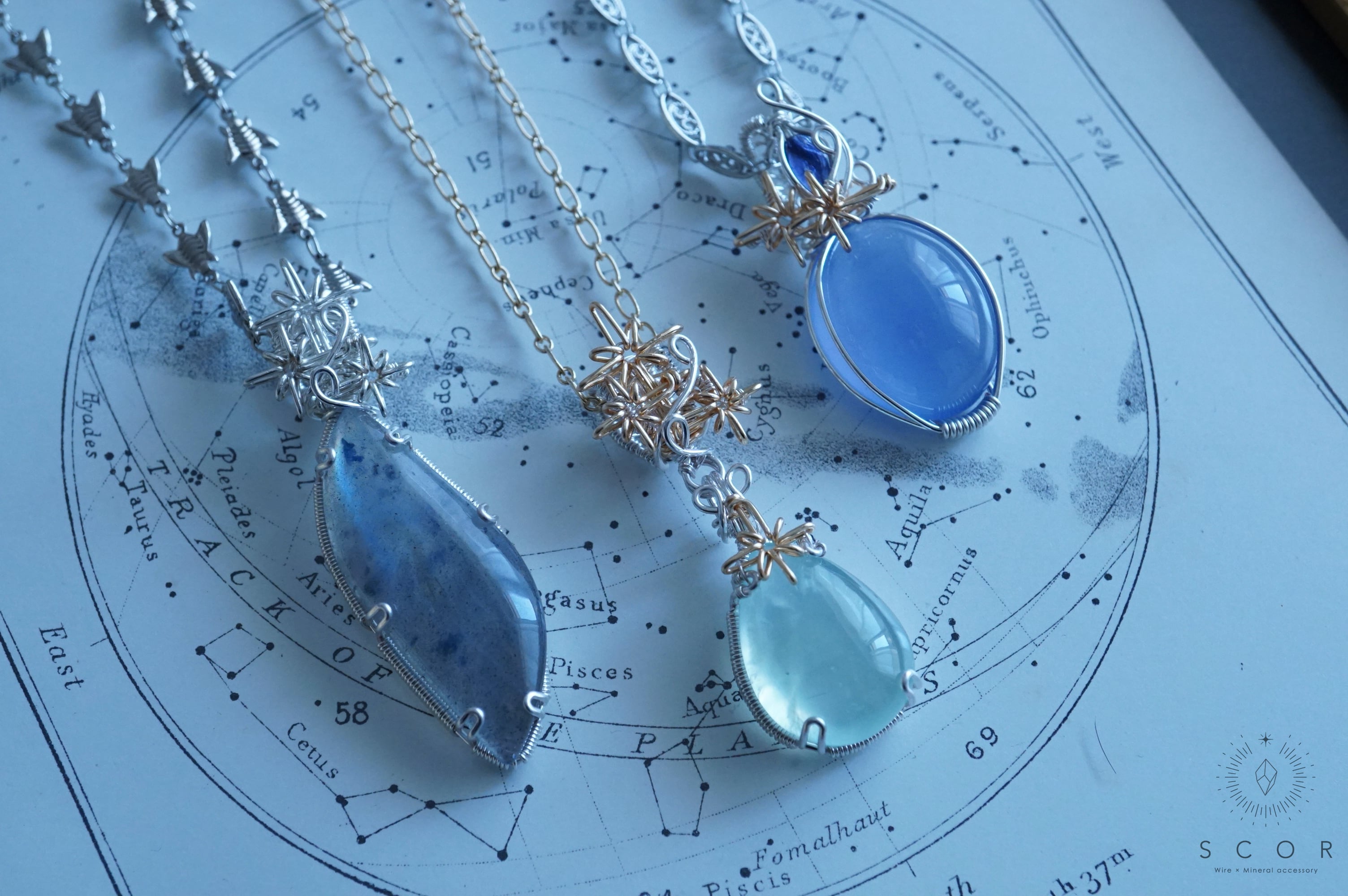 黒や濃い色の服と合わせると、カルセドニーとアイオライトの石色と透明度の違いが楽しめます。