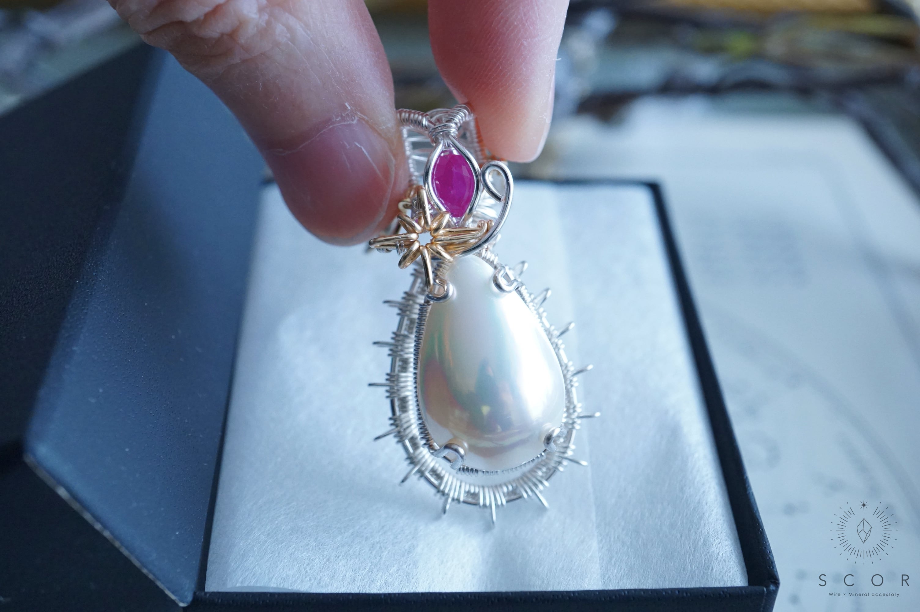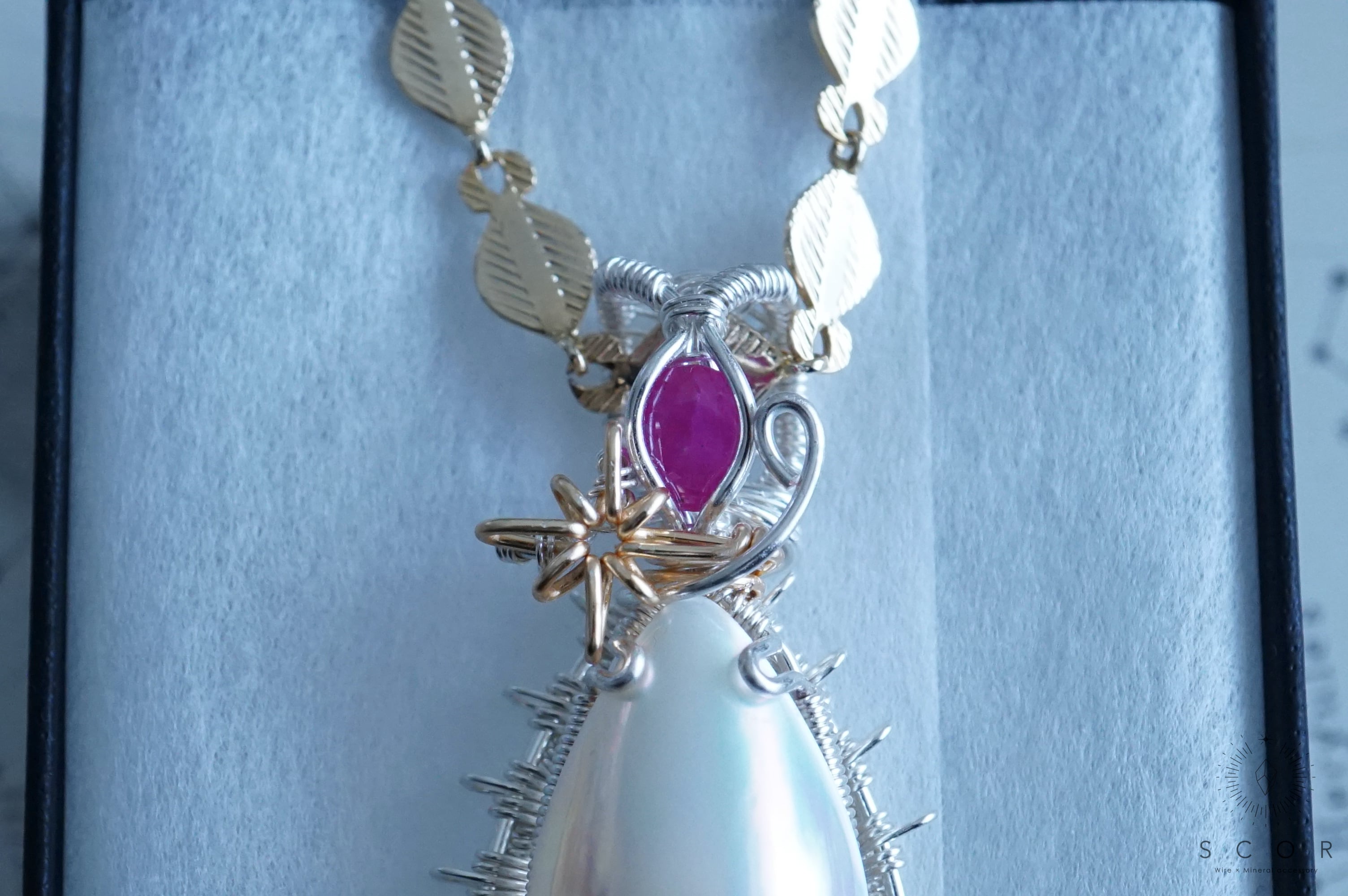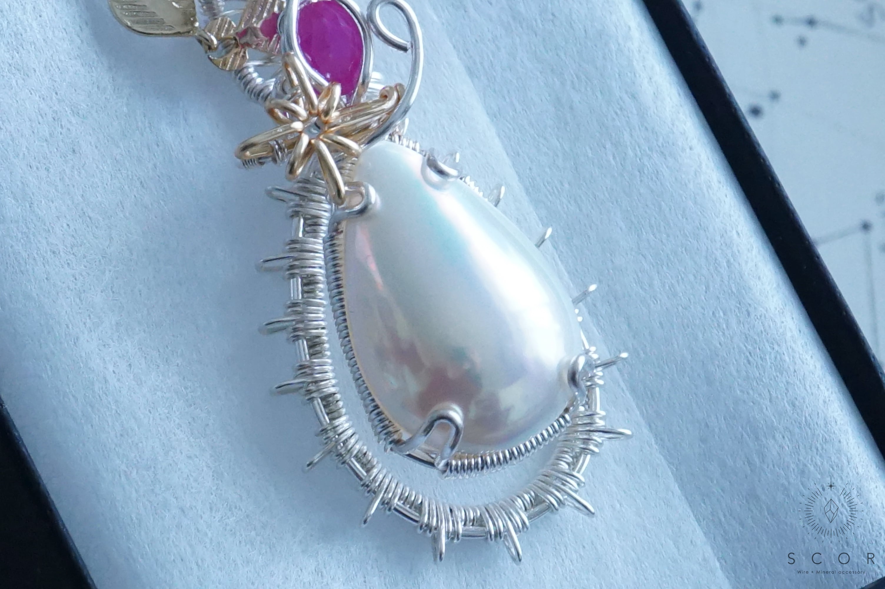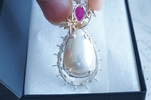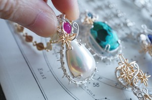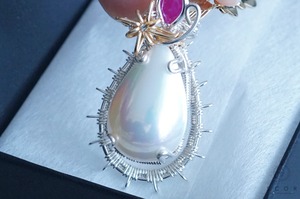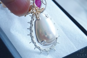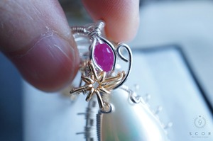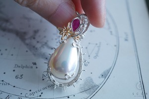 マベパールとルビーの間に添えた光芒型のワイヤーモチーフのみ金色ワイヤー仕立て。