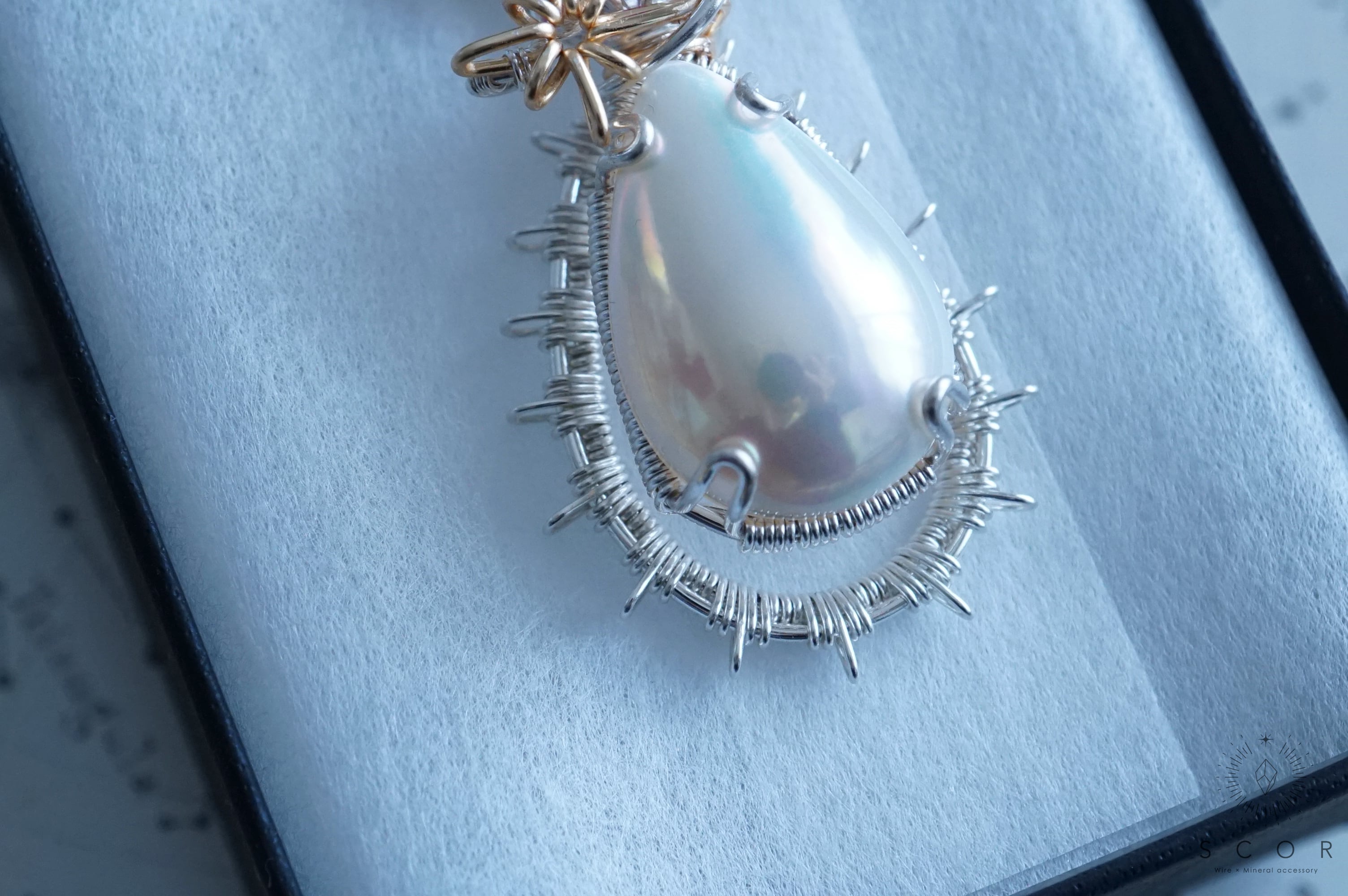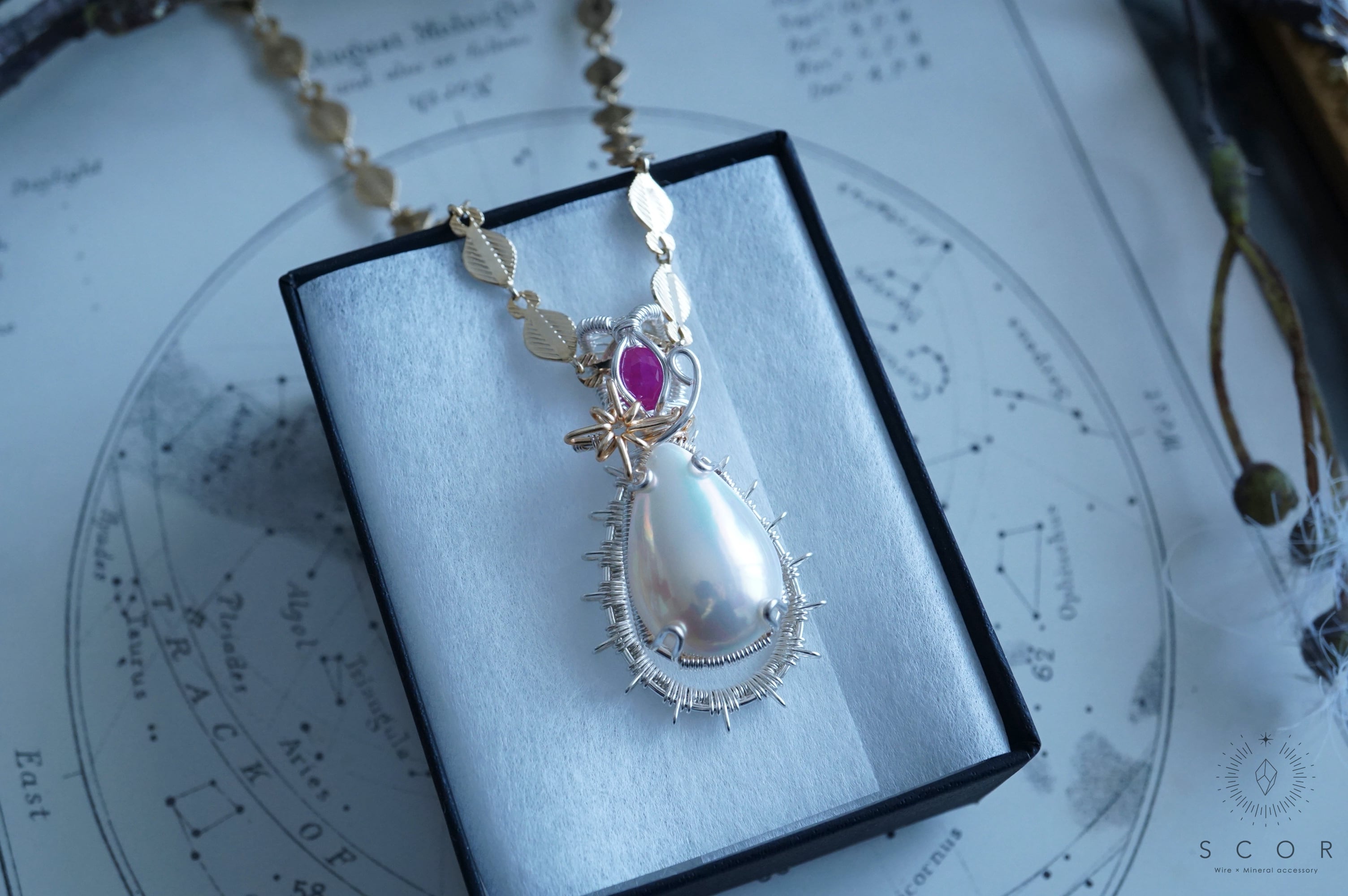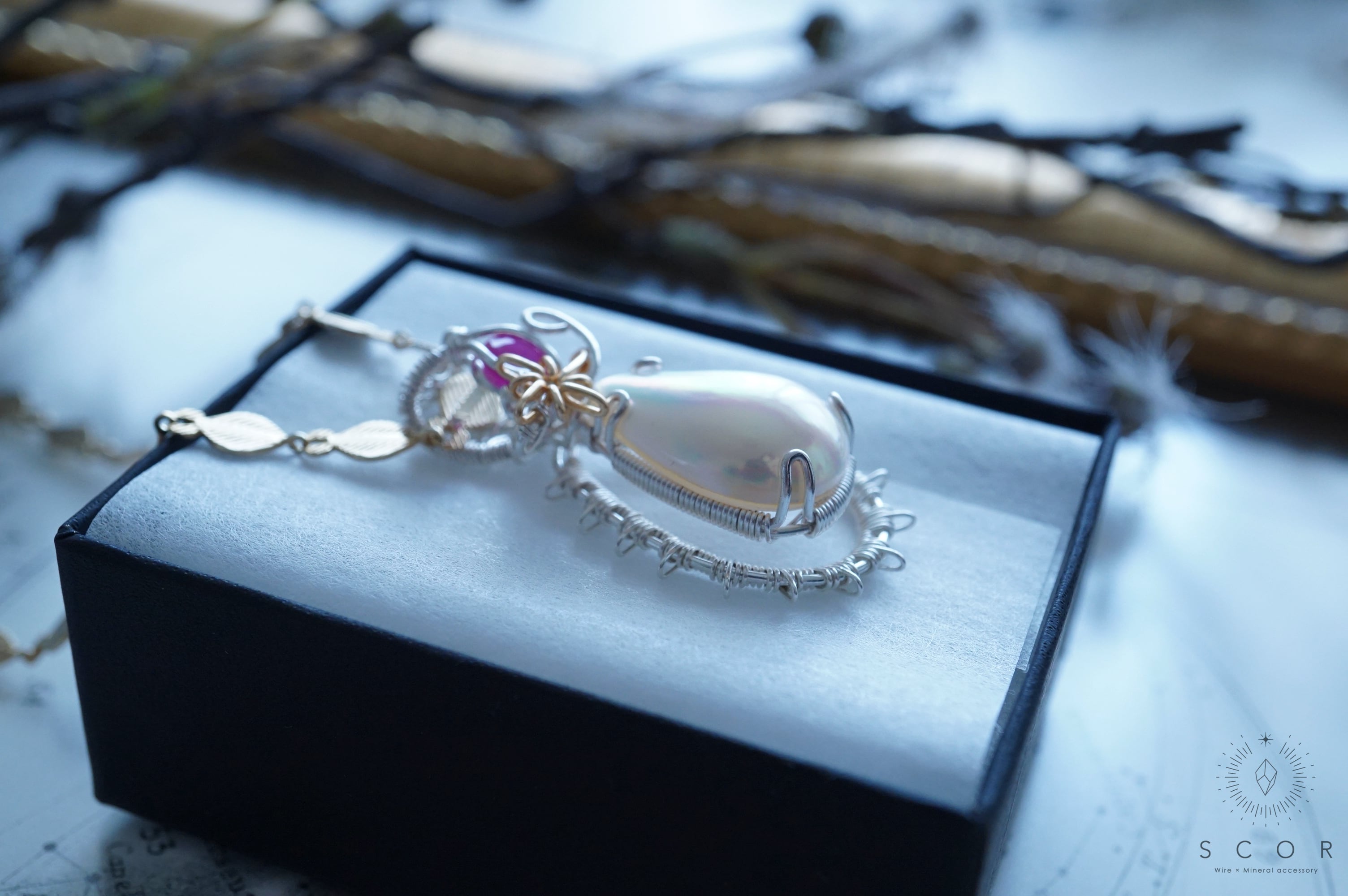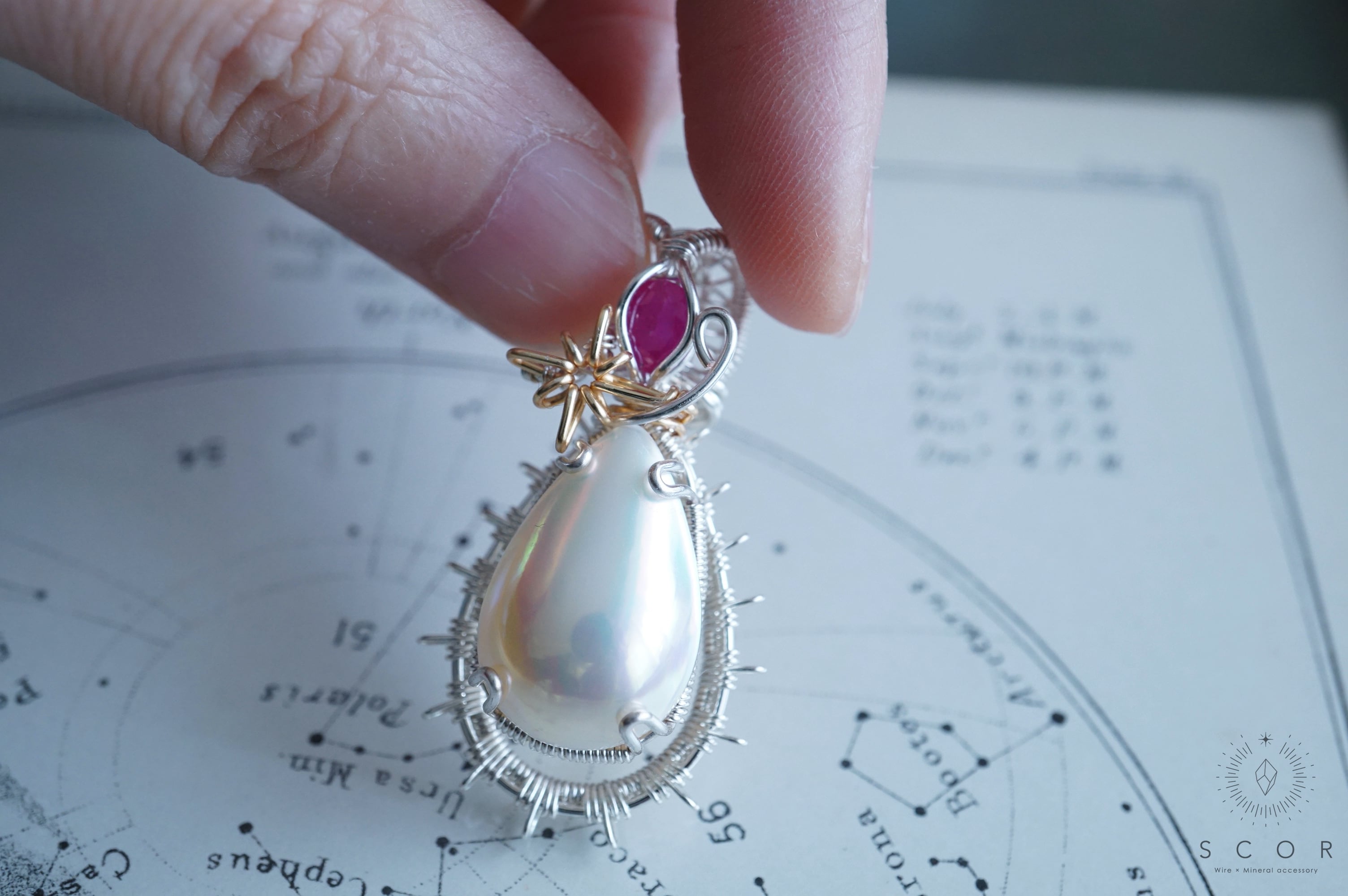 マベパールとルビーの間に添えた光芒型のワイヤーモチーフのみ金色ワイヤー仕立て。