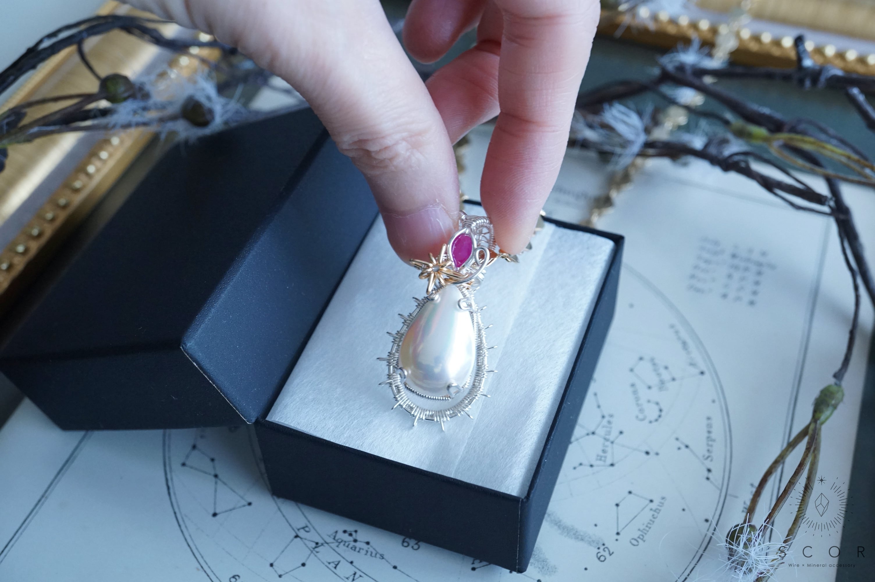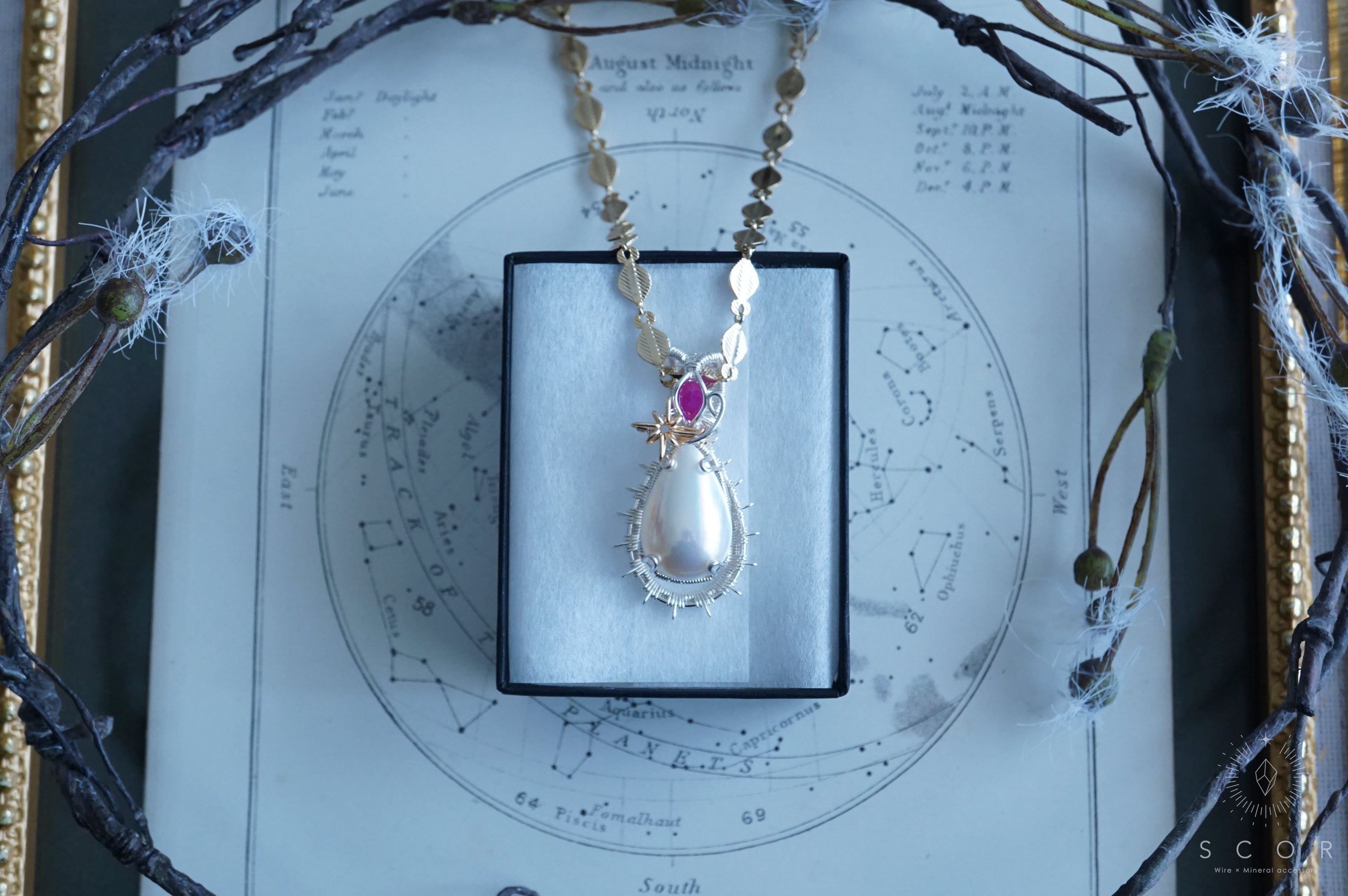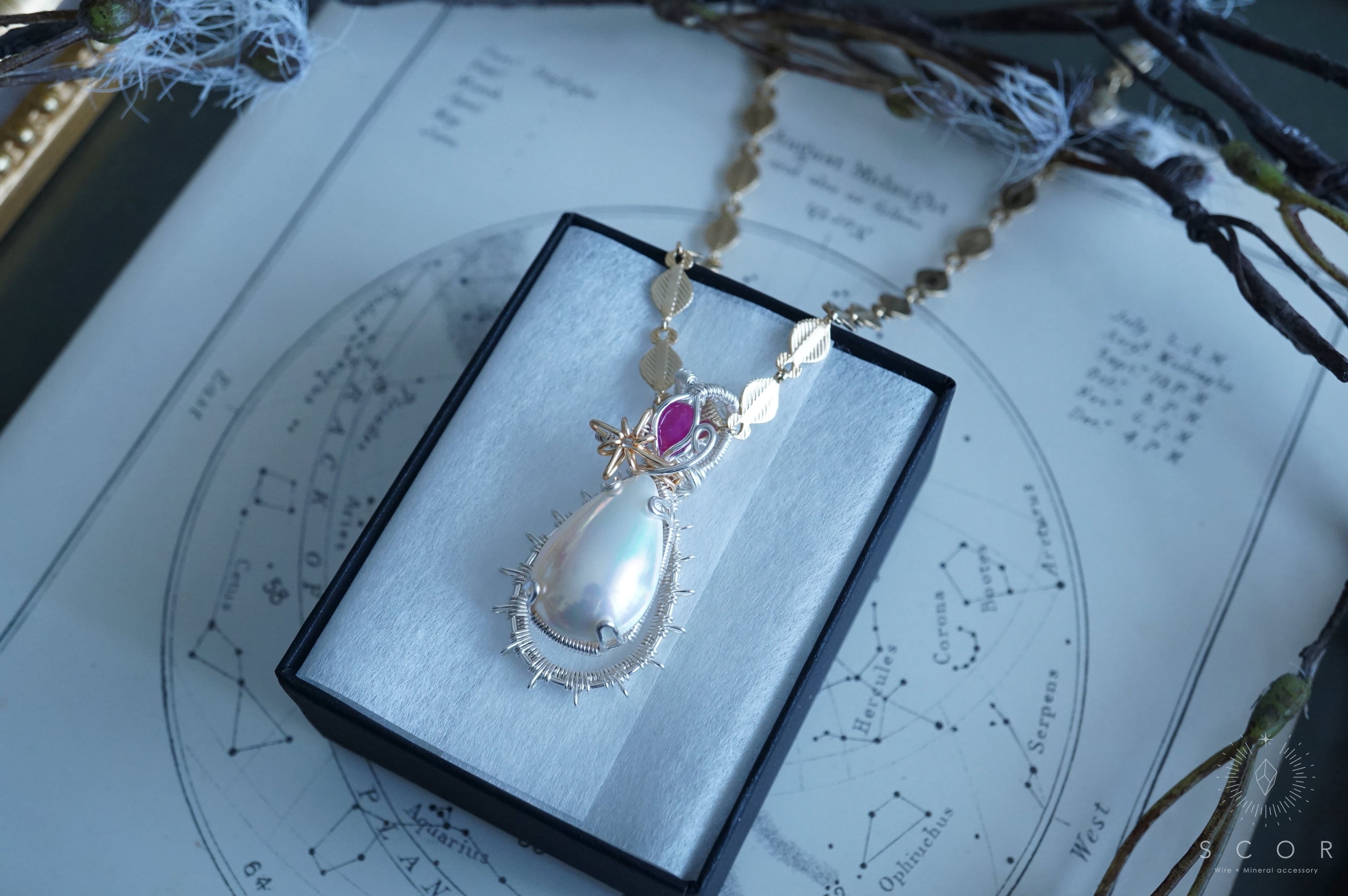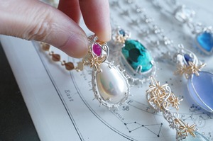 金色のネックレスと合わせると、光芒型のワイヤーモチーフとマベパールの干渉色のピンクとルビーの色合いが引き立ち華やかな雰囲気に。