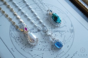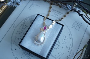 銀色のネックレスと合わせると、ルビーの色合い、マベパールの干渉色のブルーとクラシカルな雰囲気が際立ち、お好みに合わせて幅広いスタイリングが楽しめます。