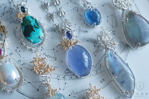 石を星に見立て、その放射光を細いワイヤー装飾(光背モチーフ)で表現したHaloシリーズ。