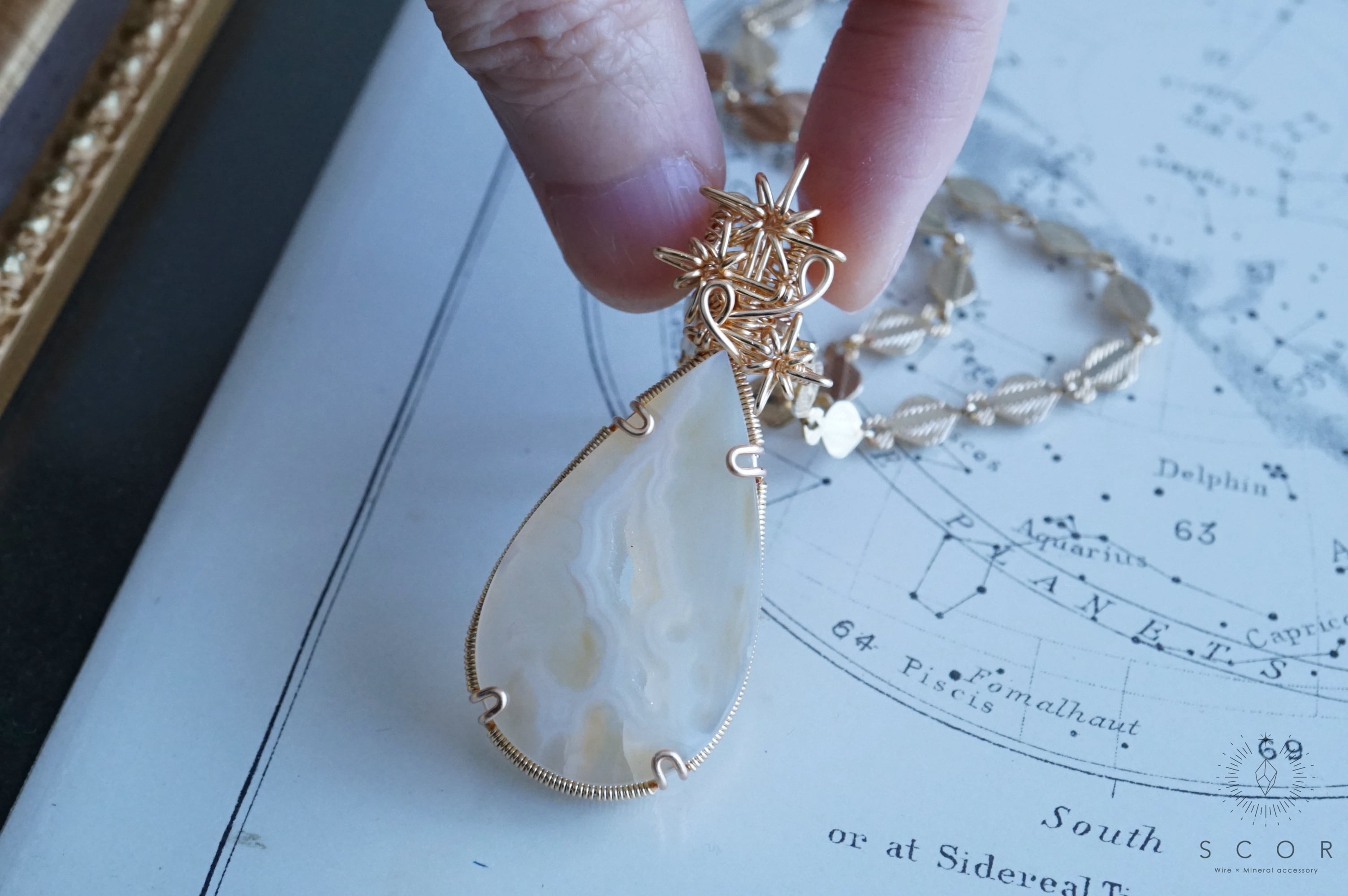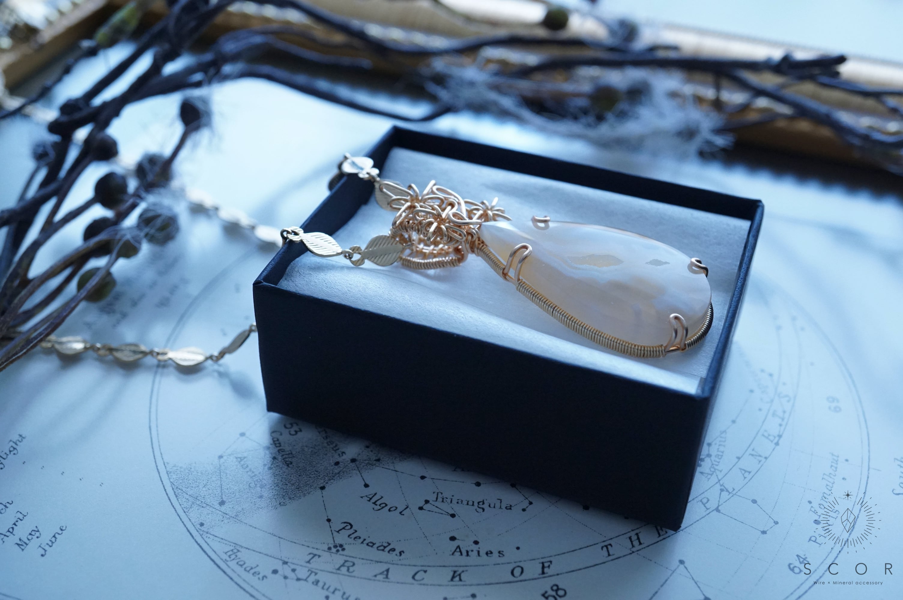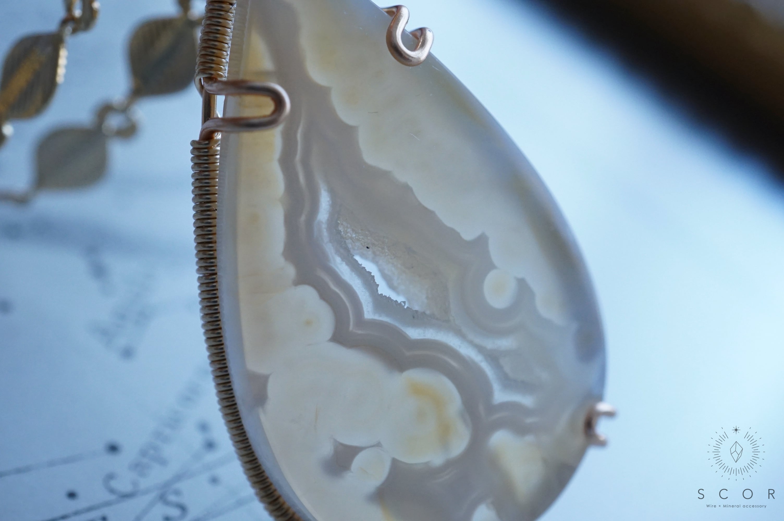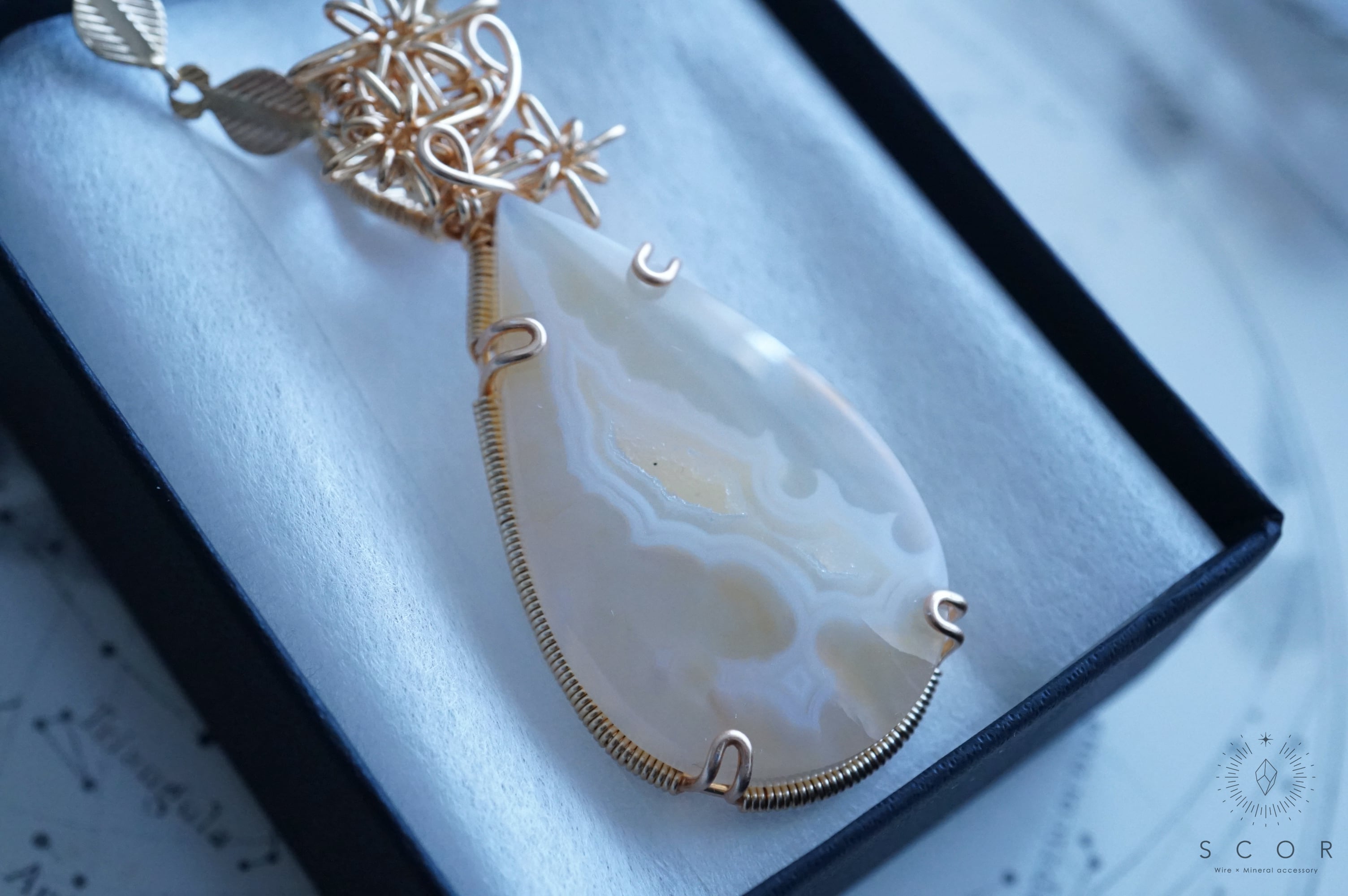 パイプアゲートは、ペアシェイプのカボションを使用。