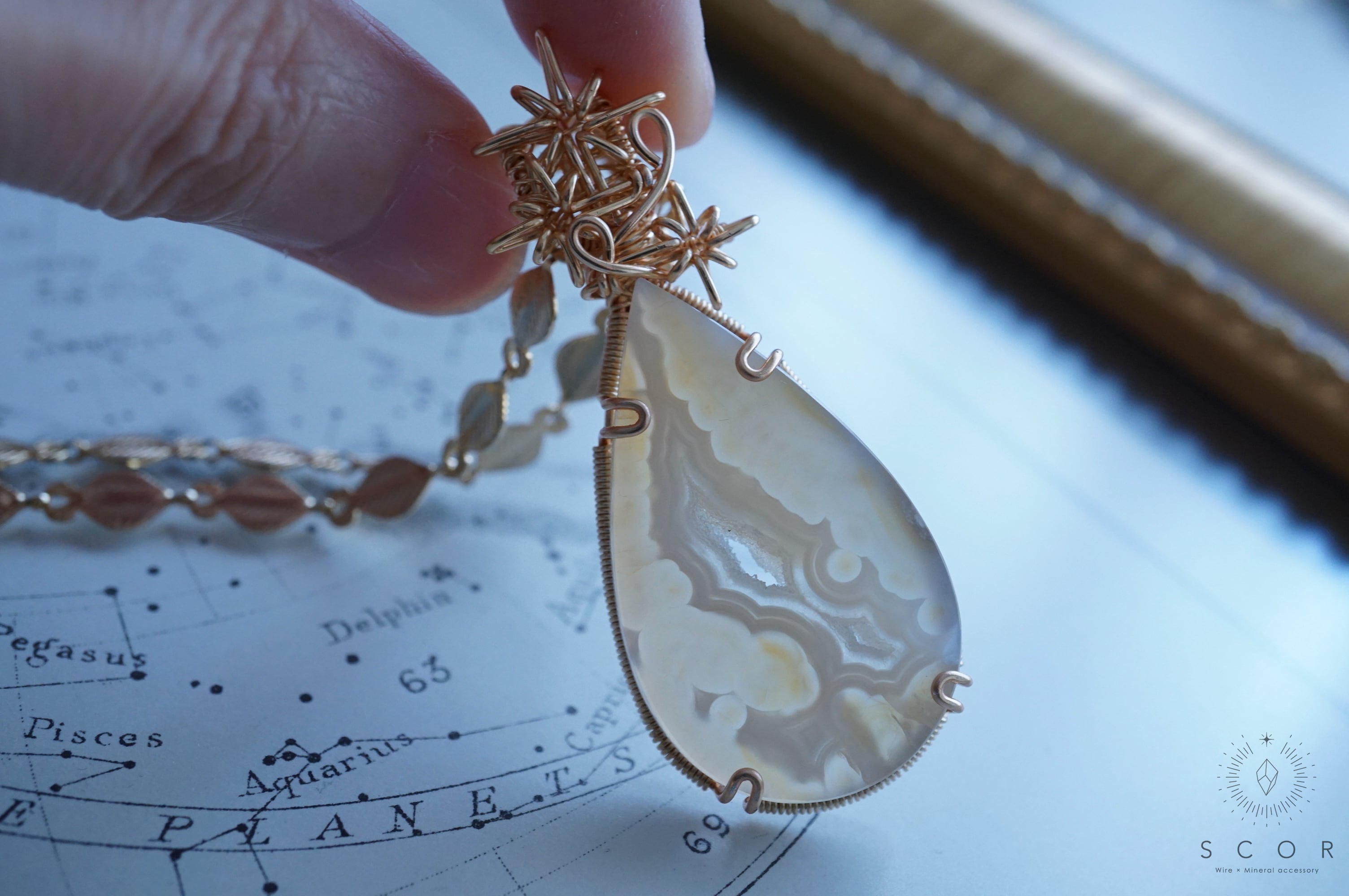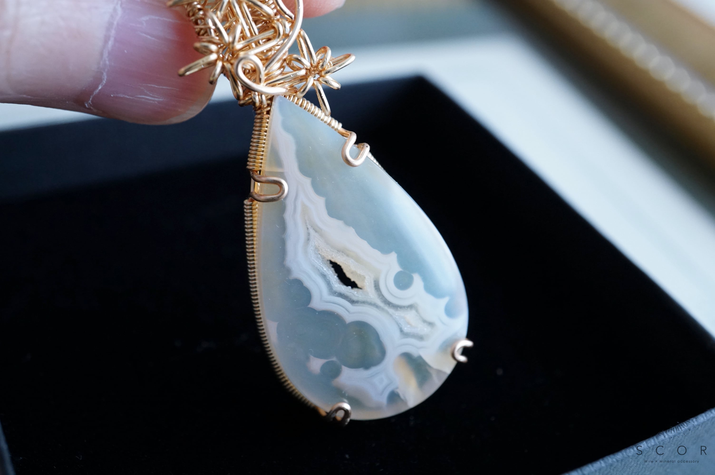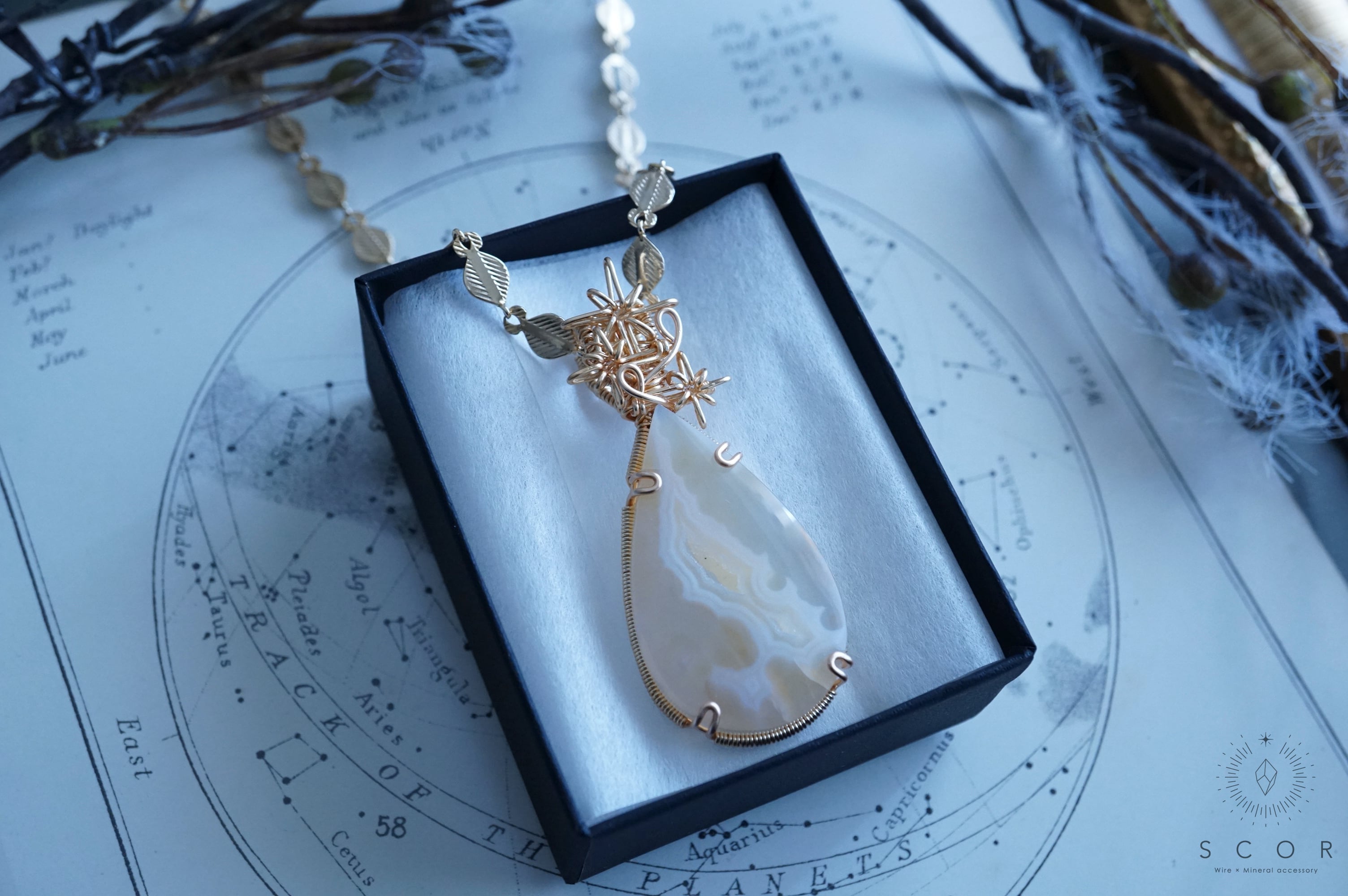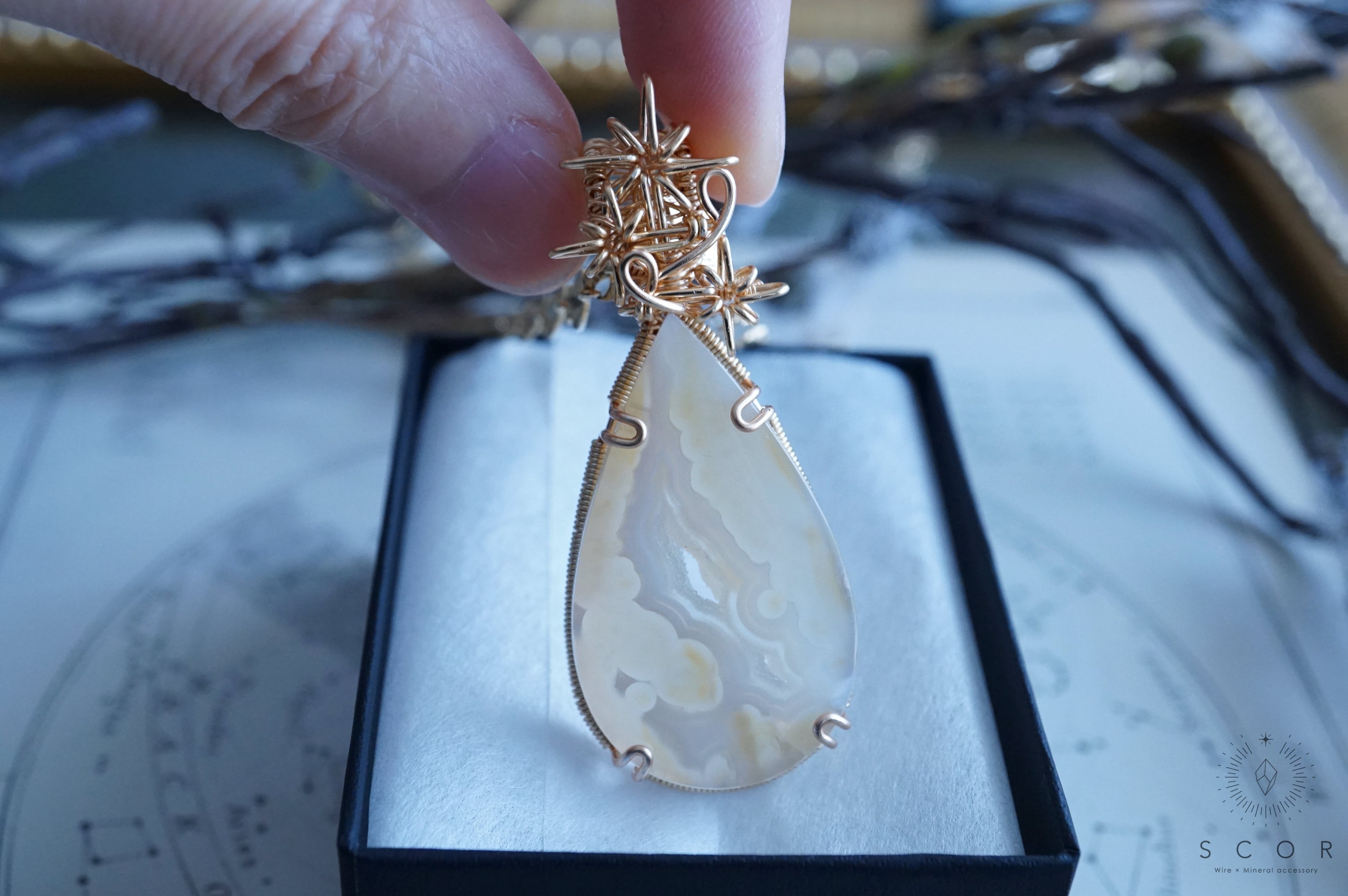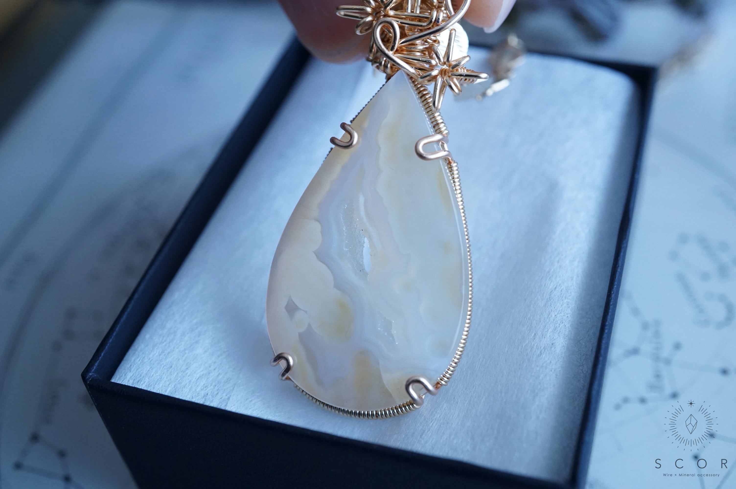 パイプアゲートは、ペアシェイプのカボションを使用。