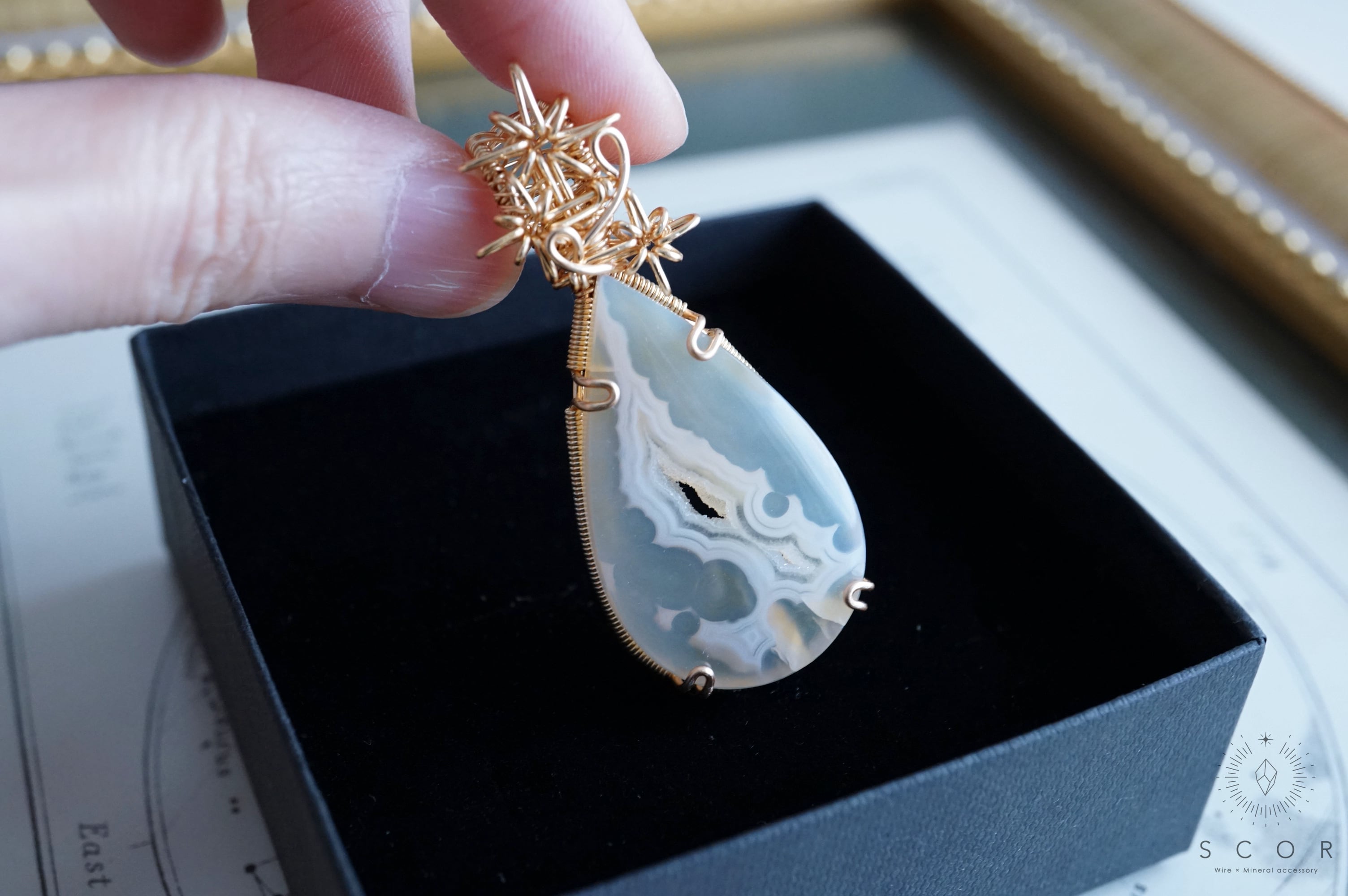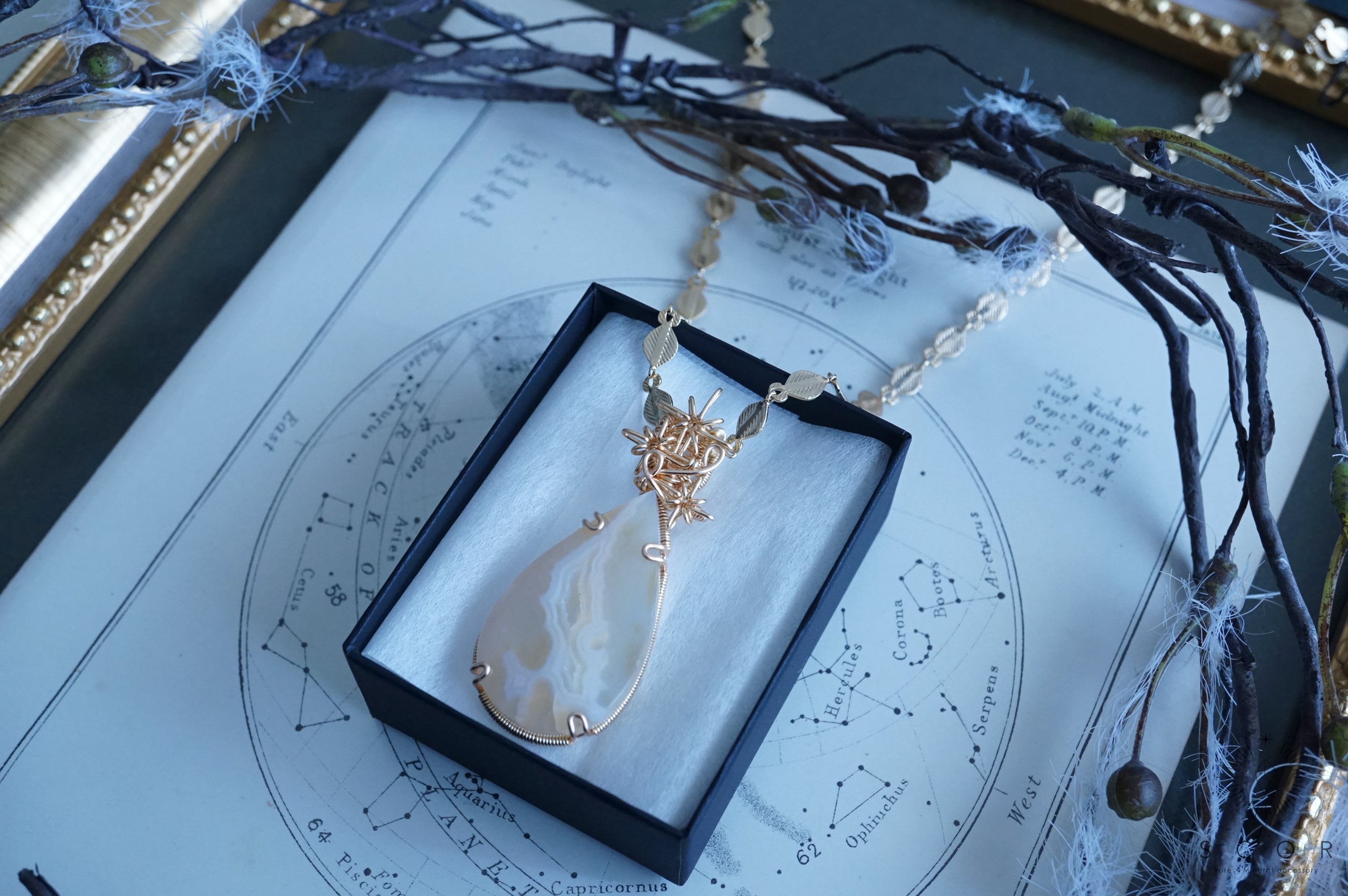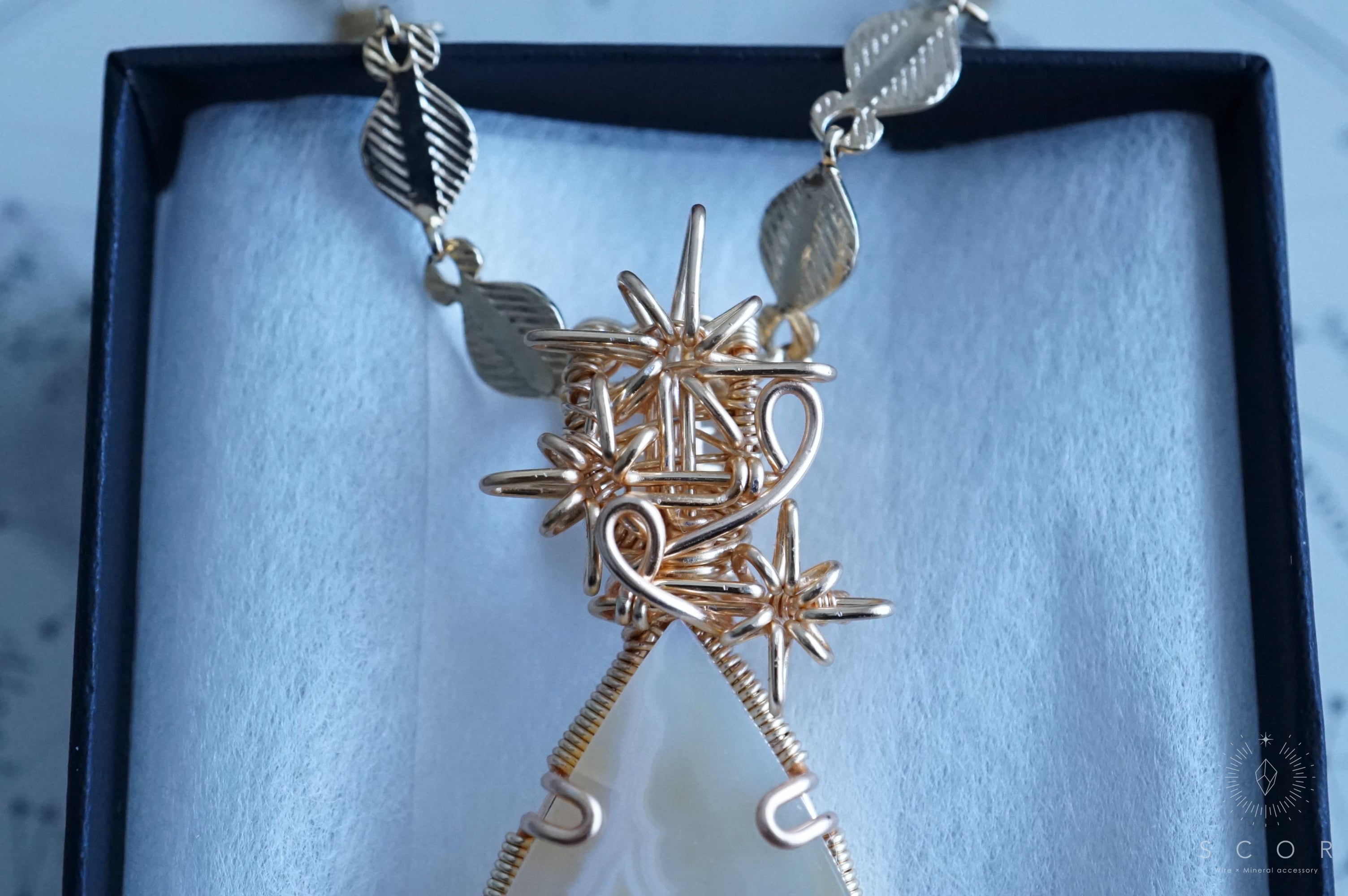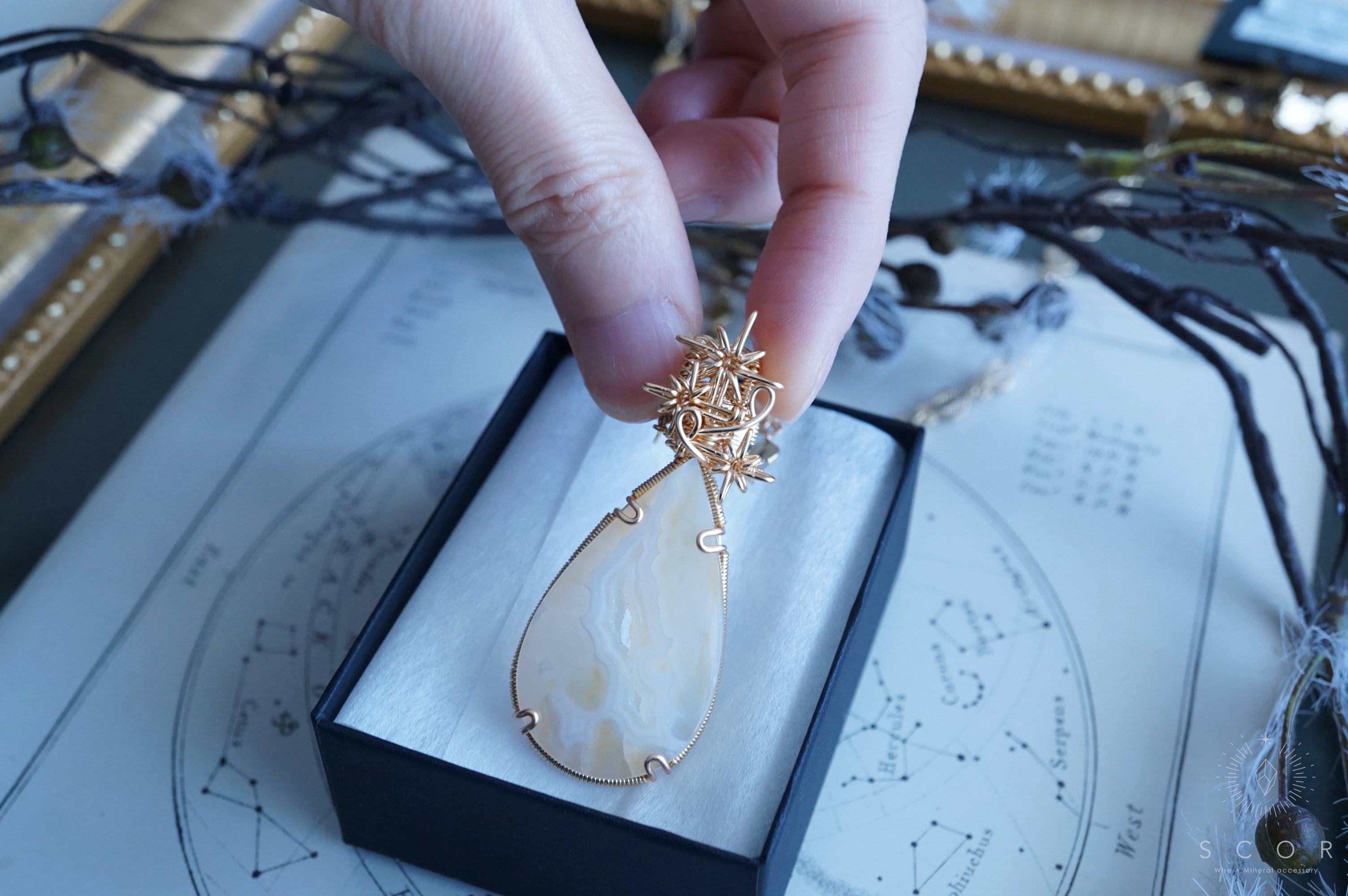パイプアゲートは、ペアシェイプのカボションを使用。