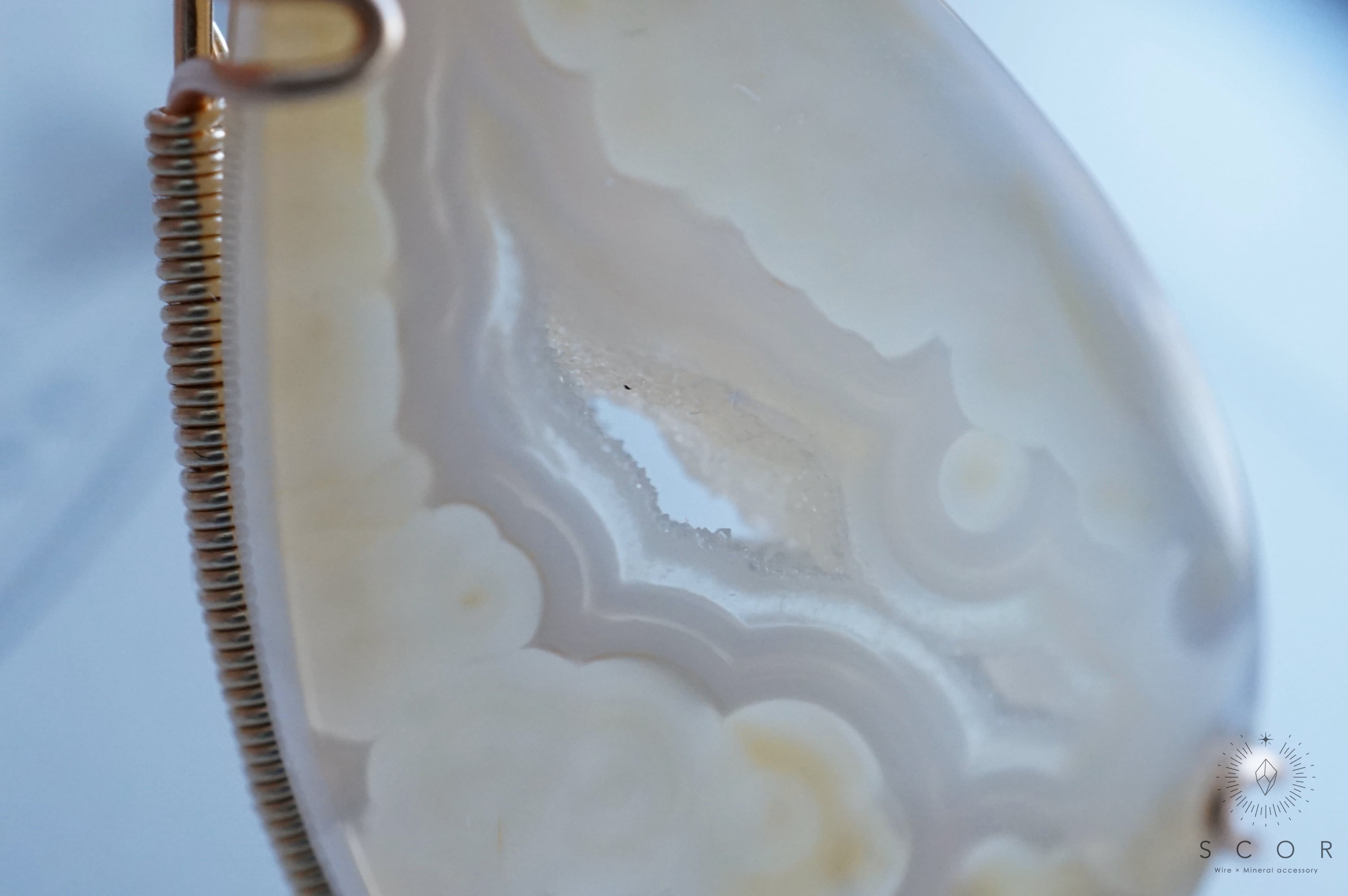 真ん中に穴があいており(アゲートの原石ができあがる過程で空いた穴です)、その縁にはざらめのような結晶が極小の煌めきを放ちます。