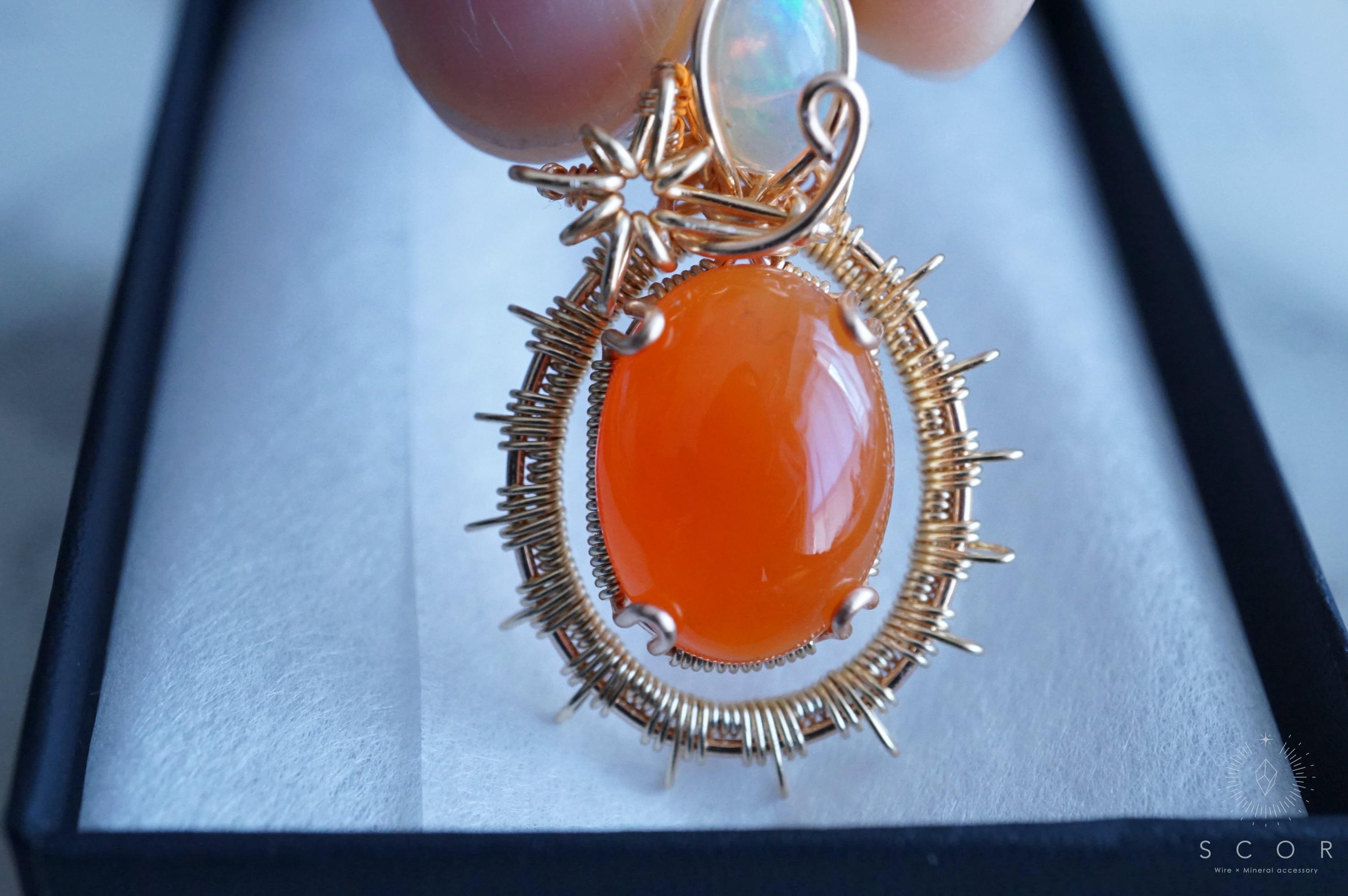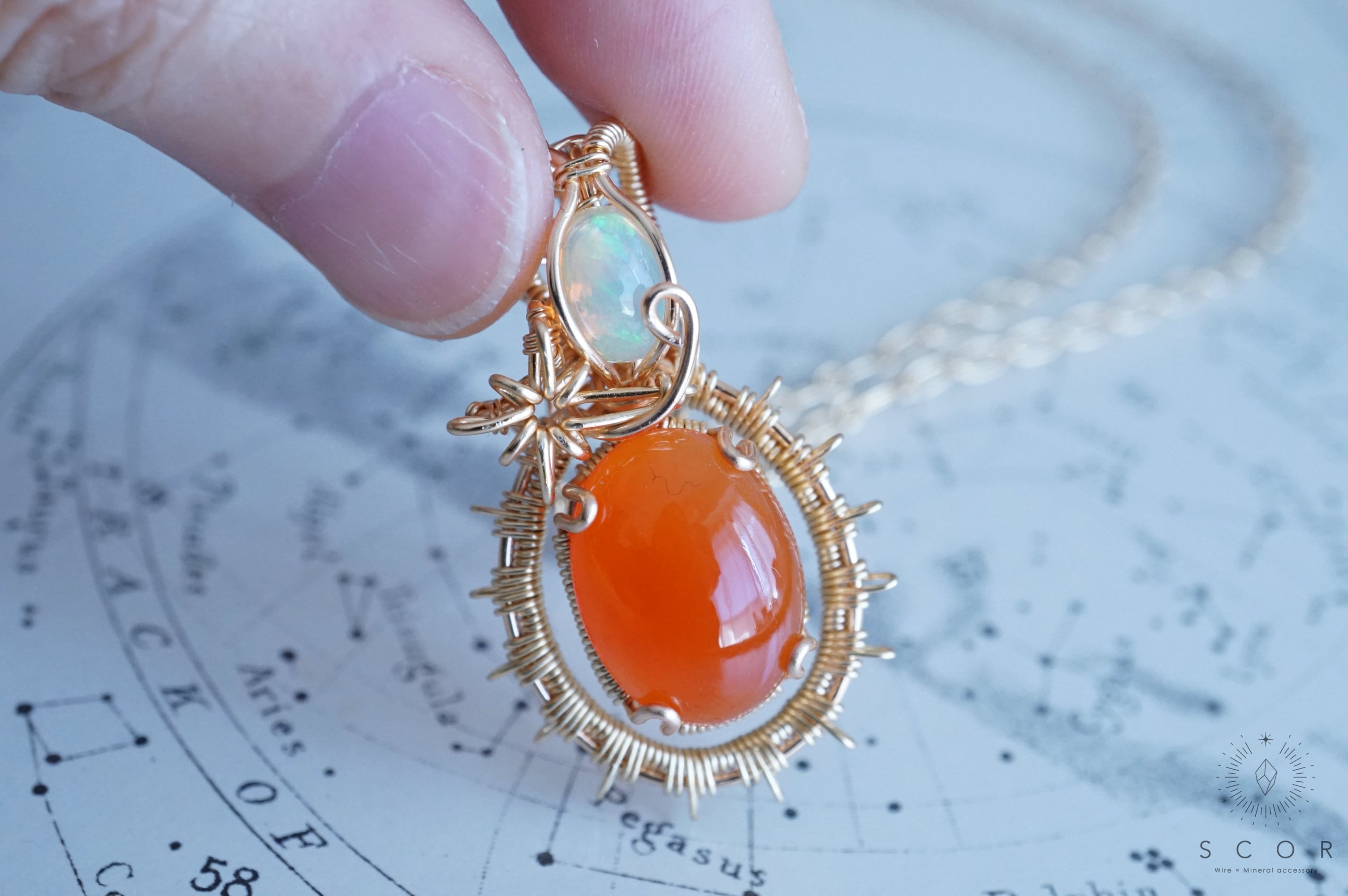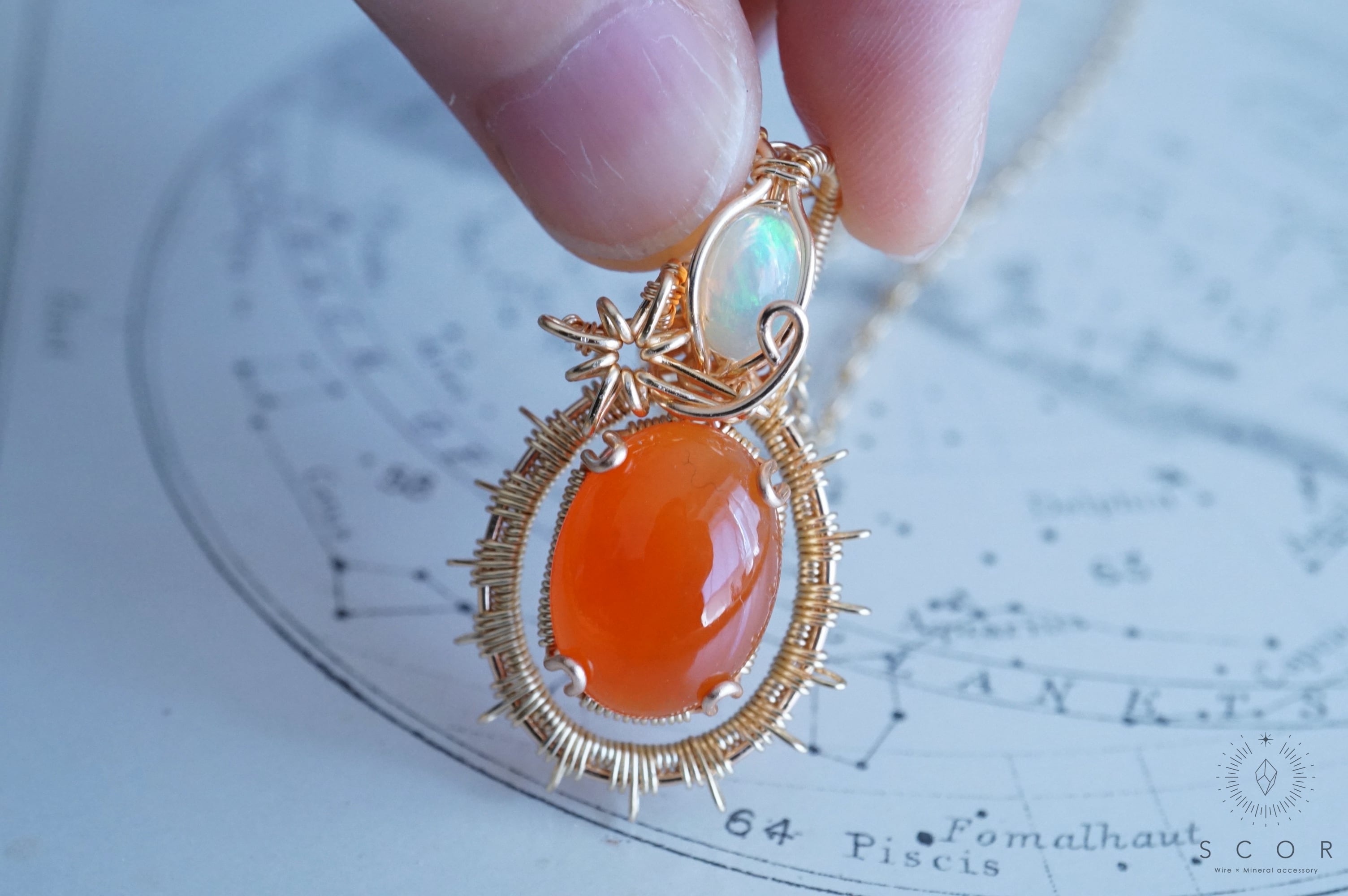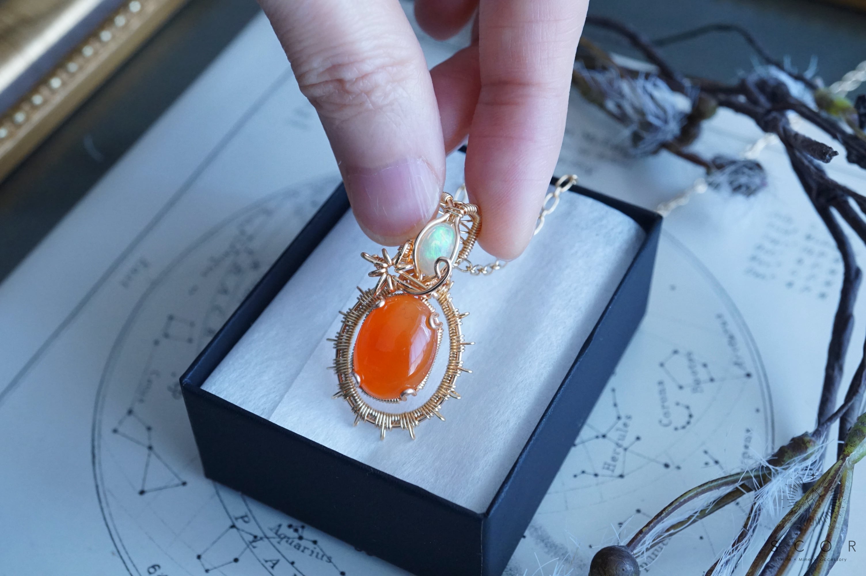 カーネリアンとオパールの間に添えた光芒型のワイヤーモチーフは、小さな流星を表現。