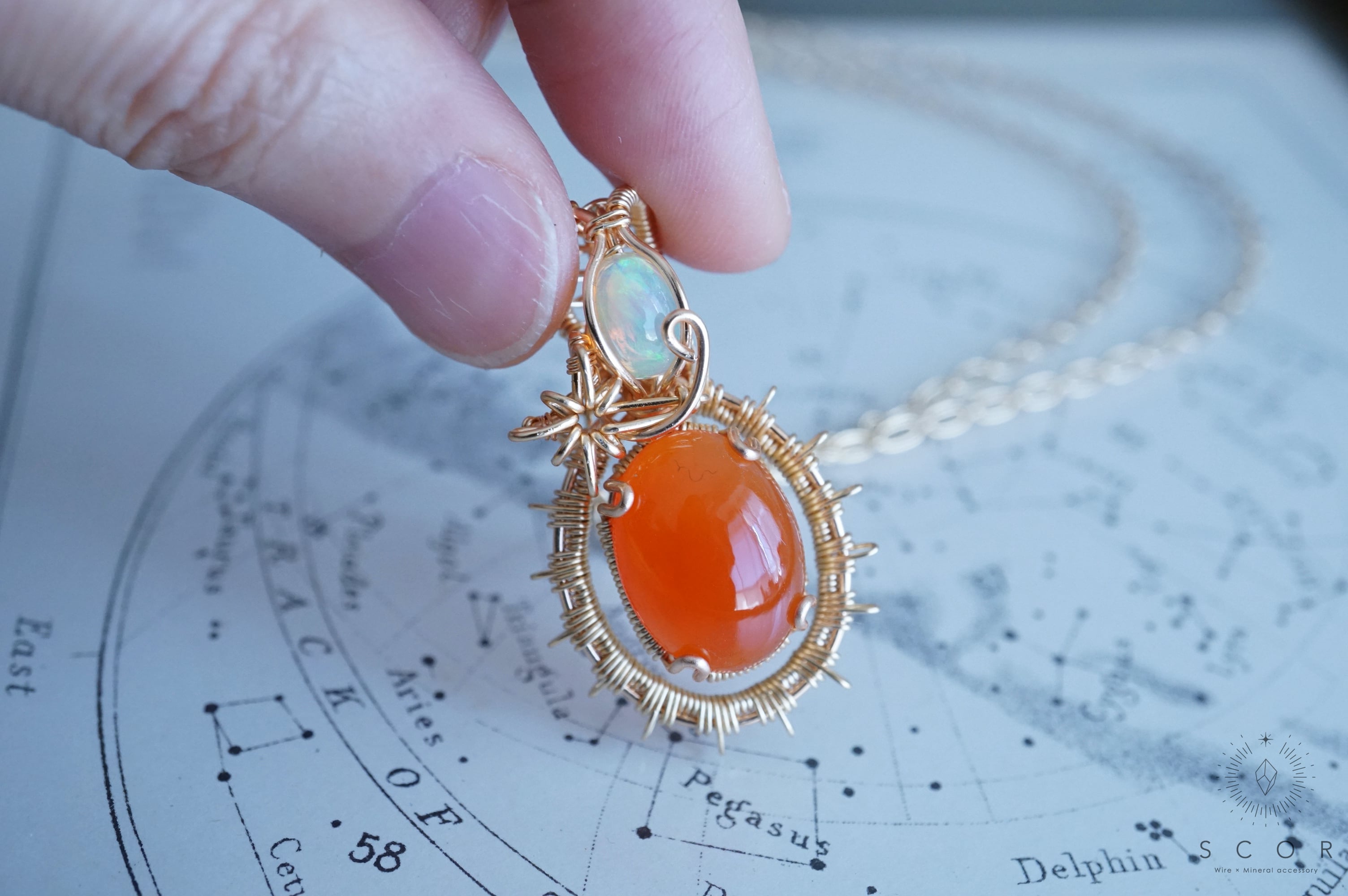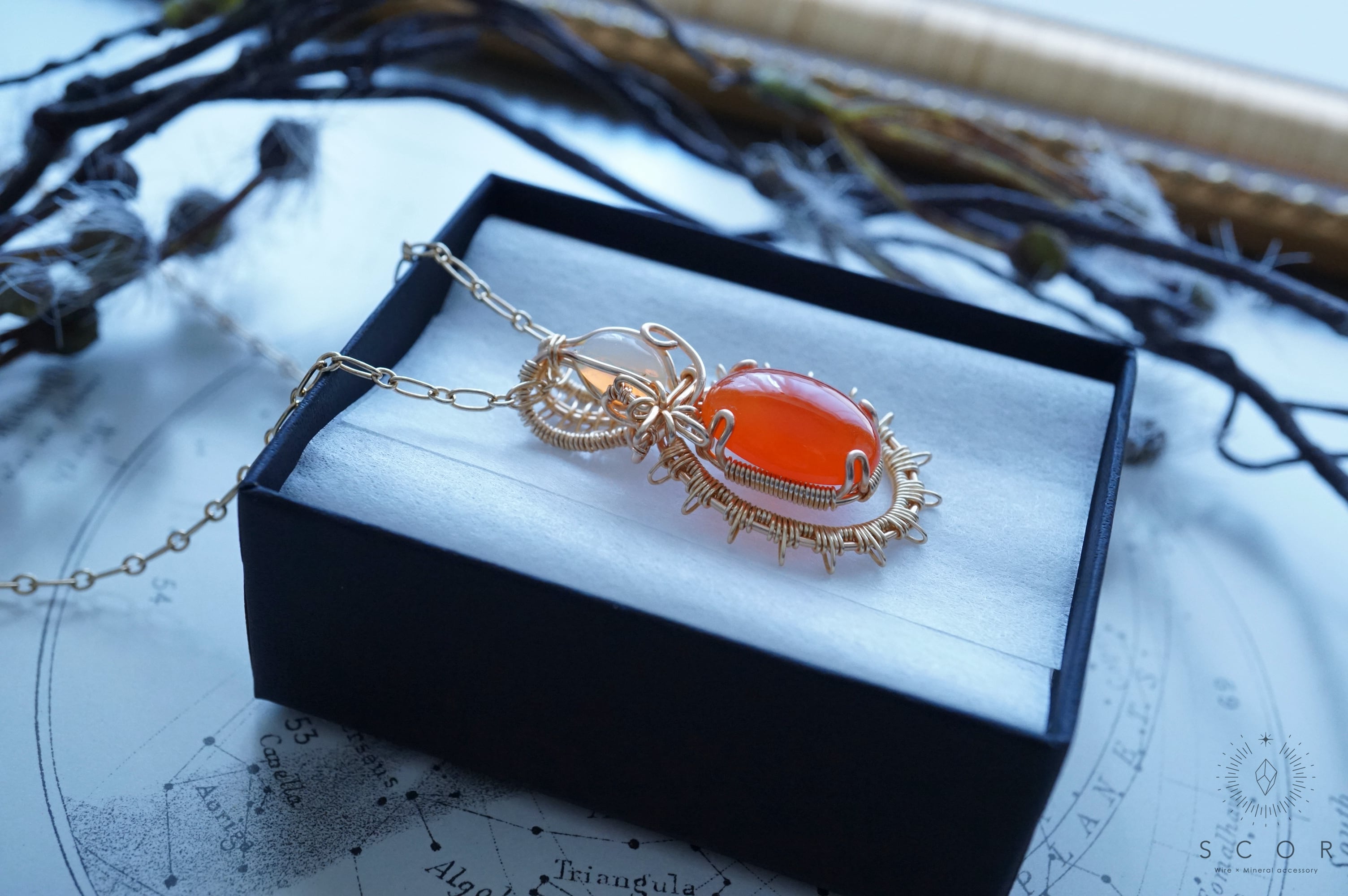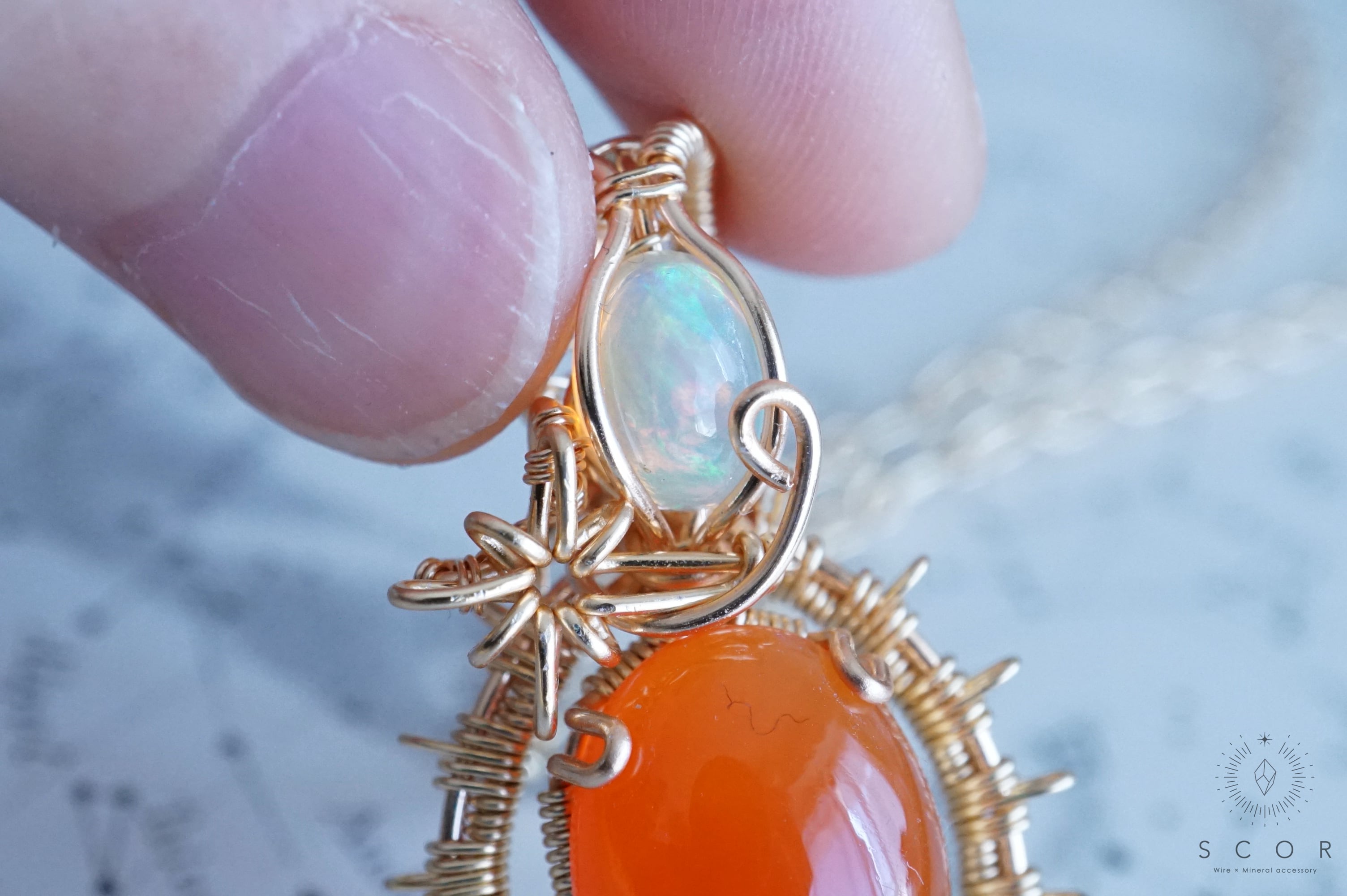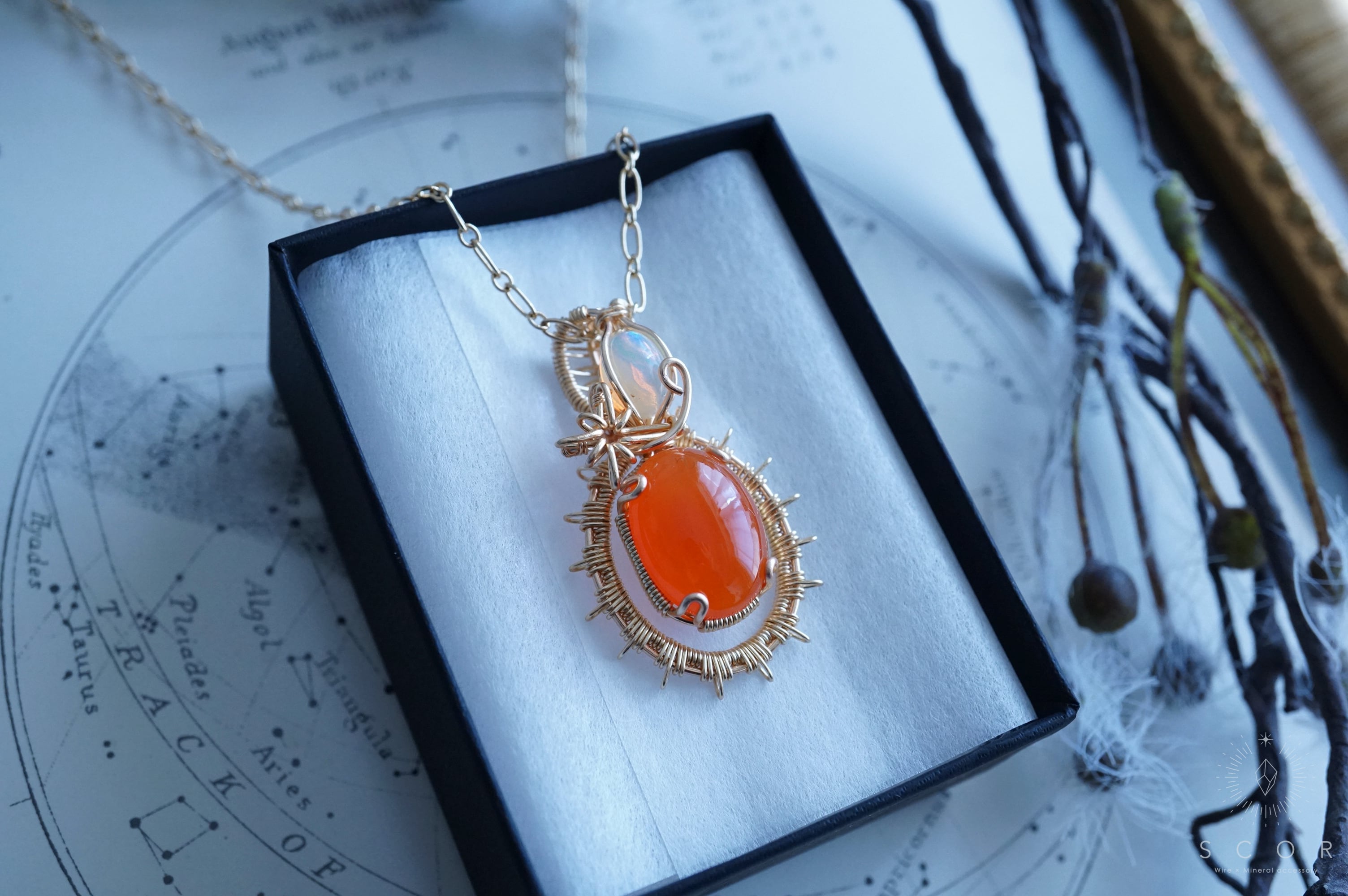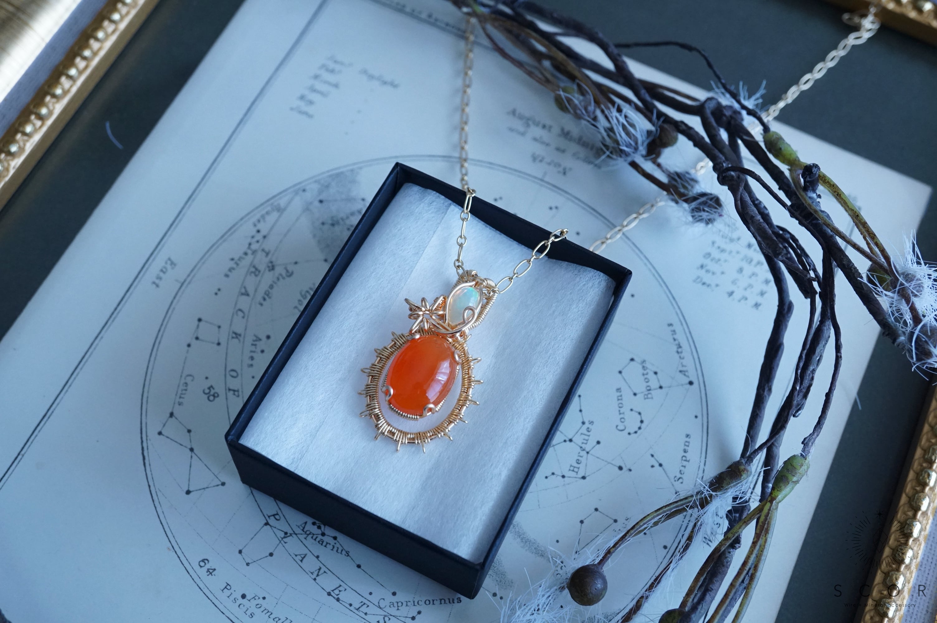カーネリアンとオパールの間に添えた光芒型のワイヤーモチーフは、小さな流星を表現。