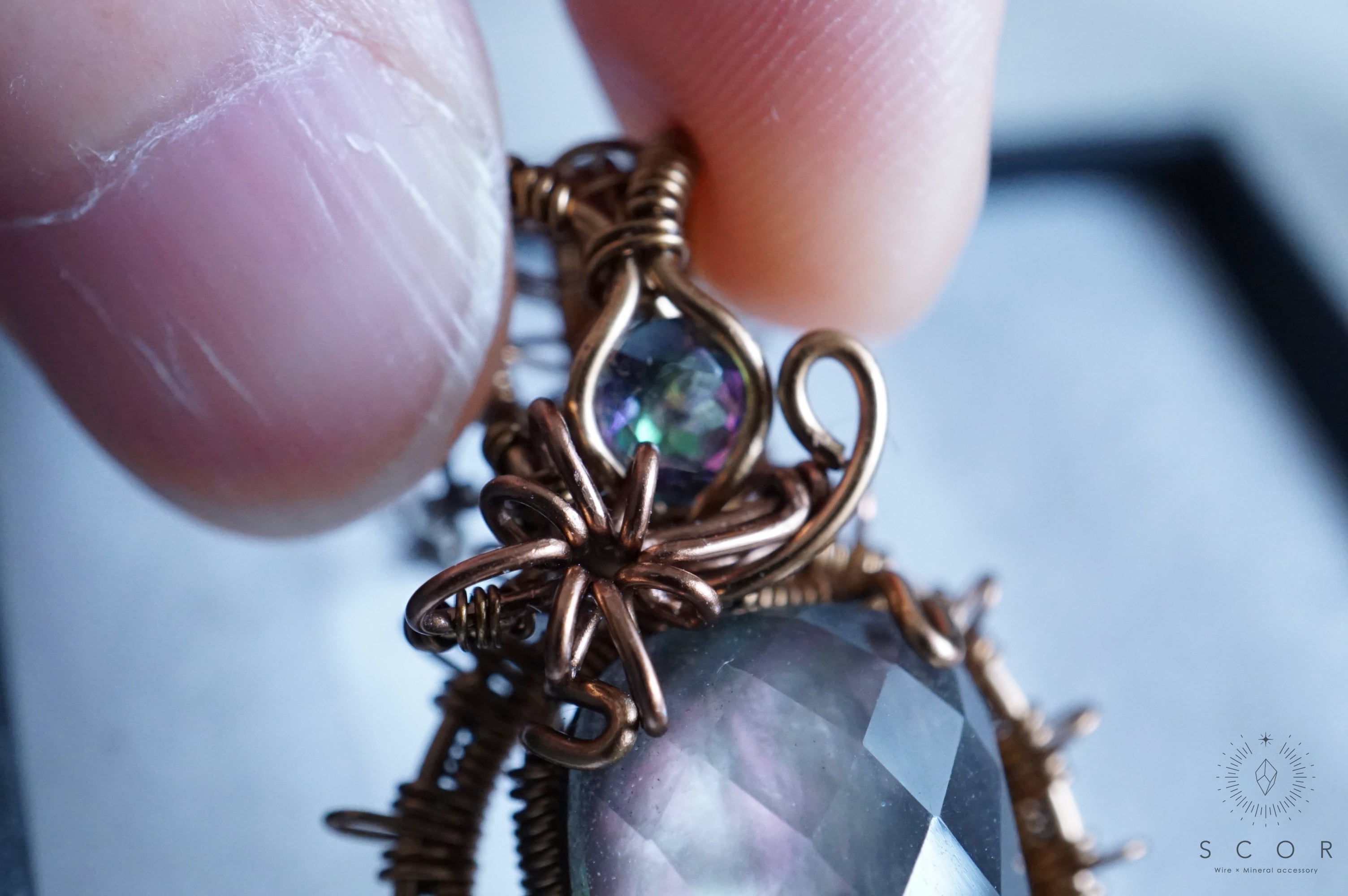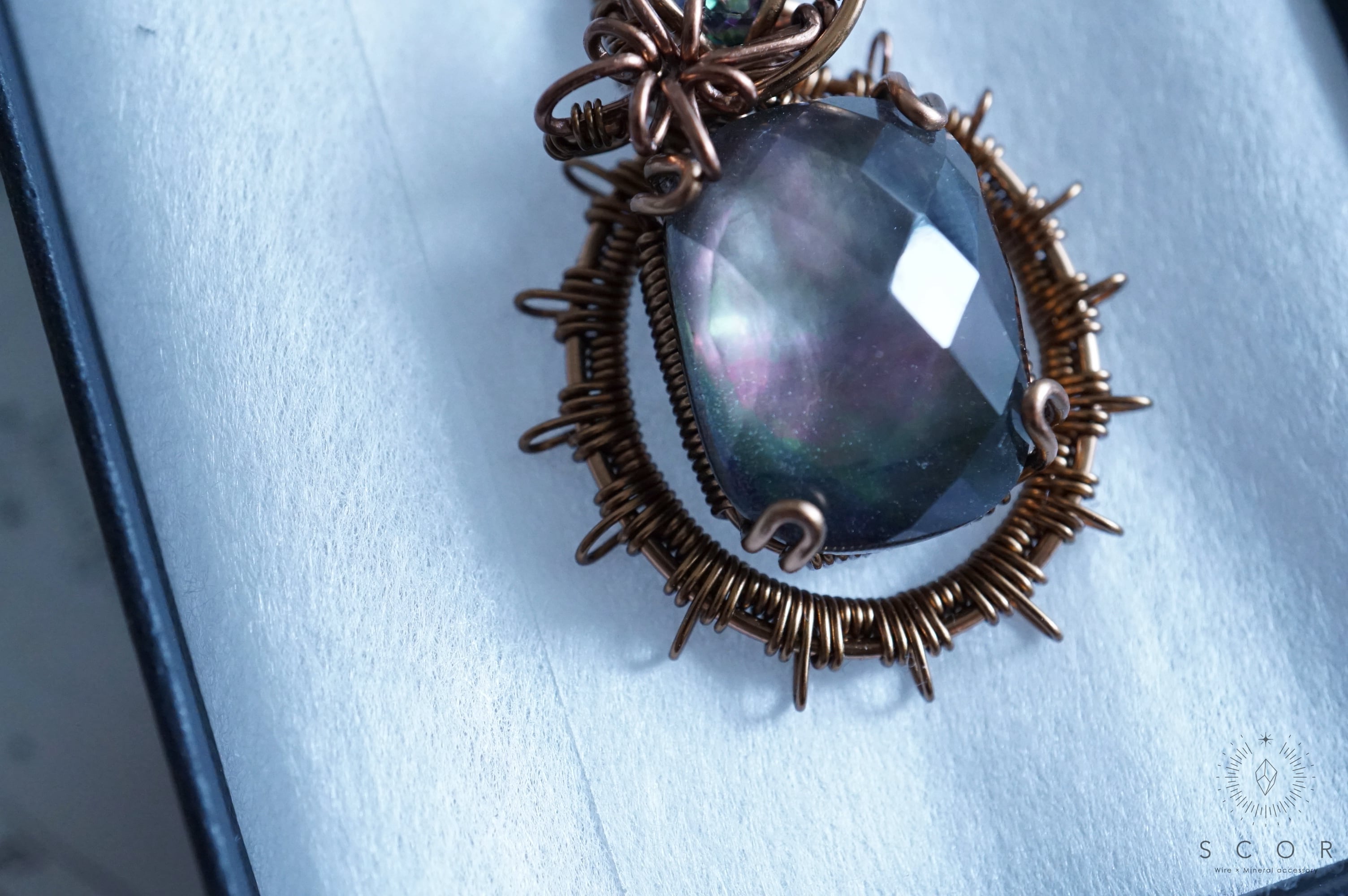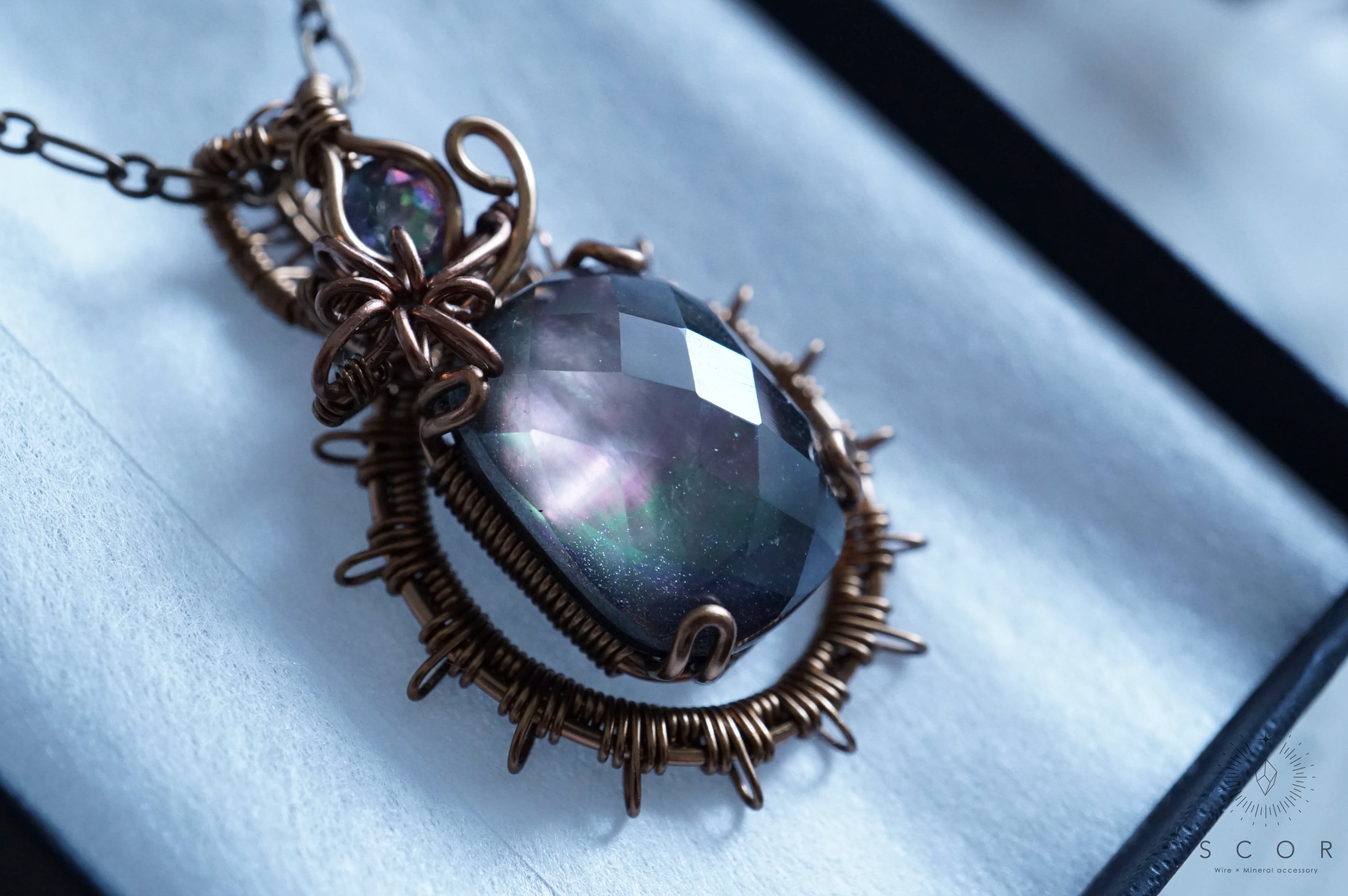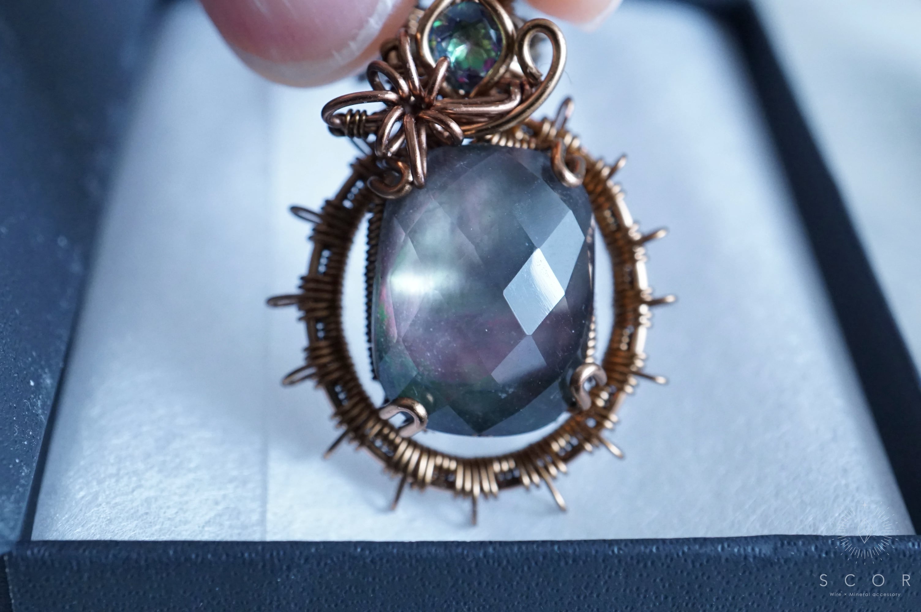 黒蝶貝のパープルとグリーンのオーロラのような光沢が、表面にチェッカーボードカットが施された水晶ドーム越しに見える、幻想的でクラシカルなムードのあるピースです。