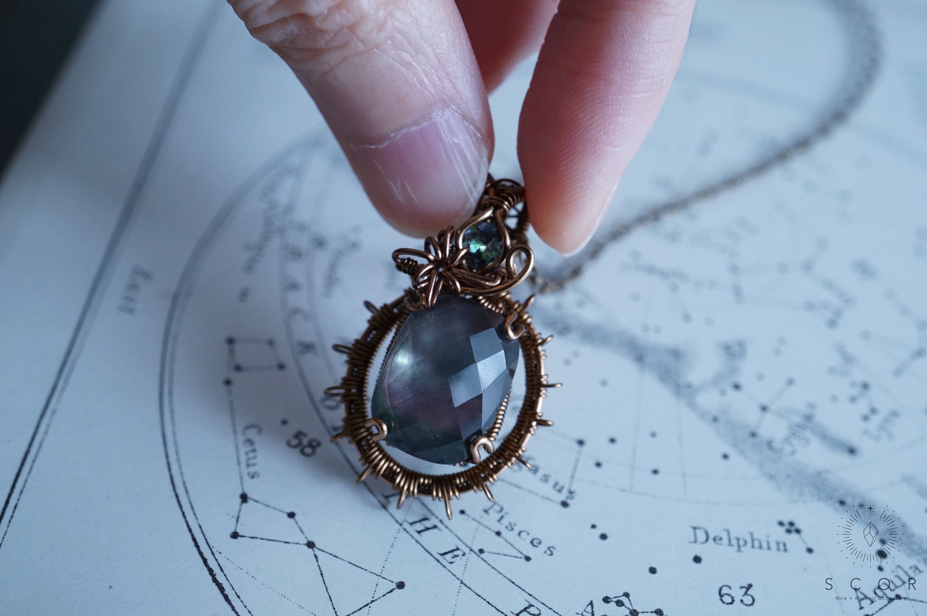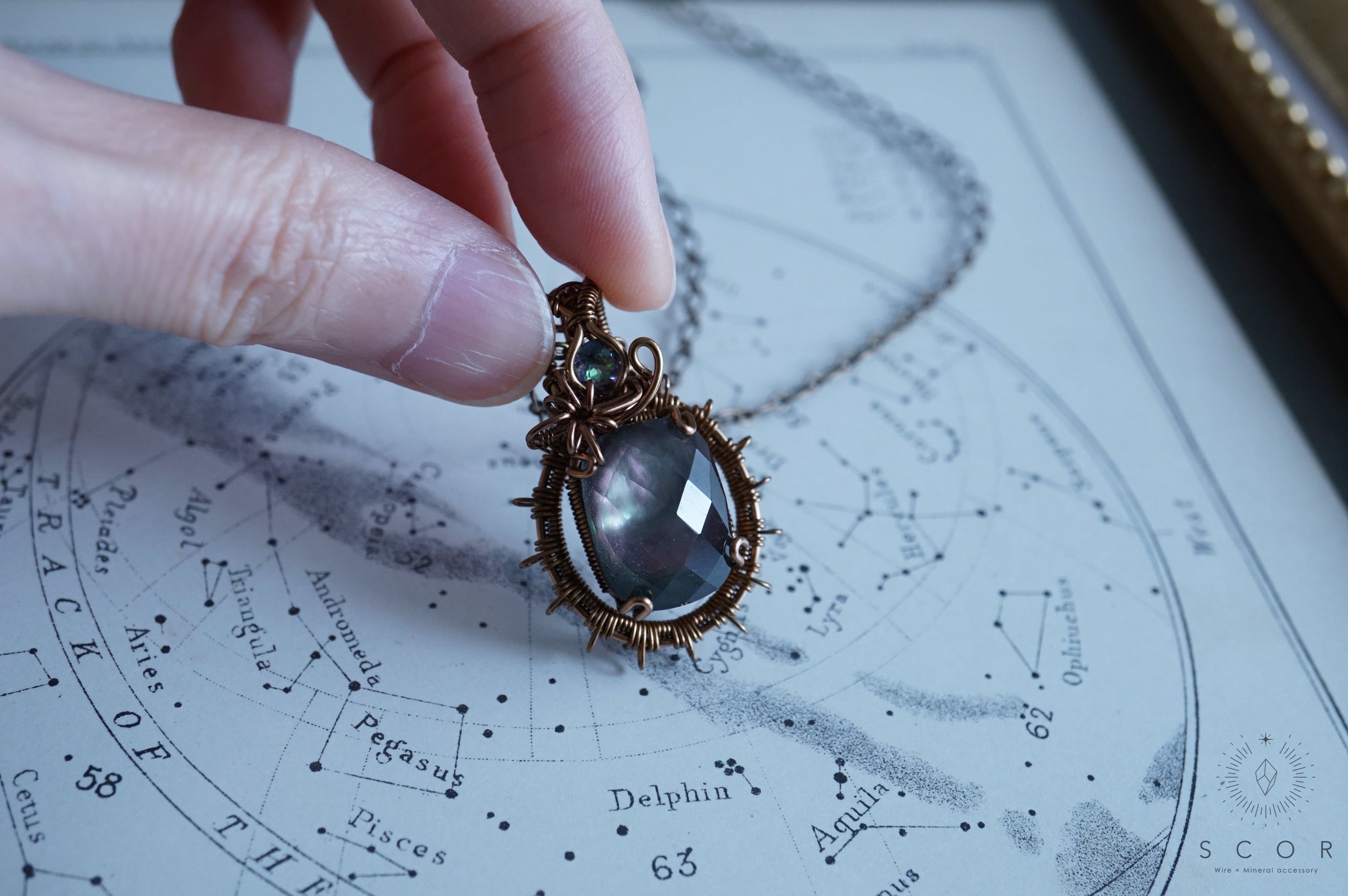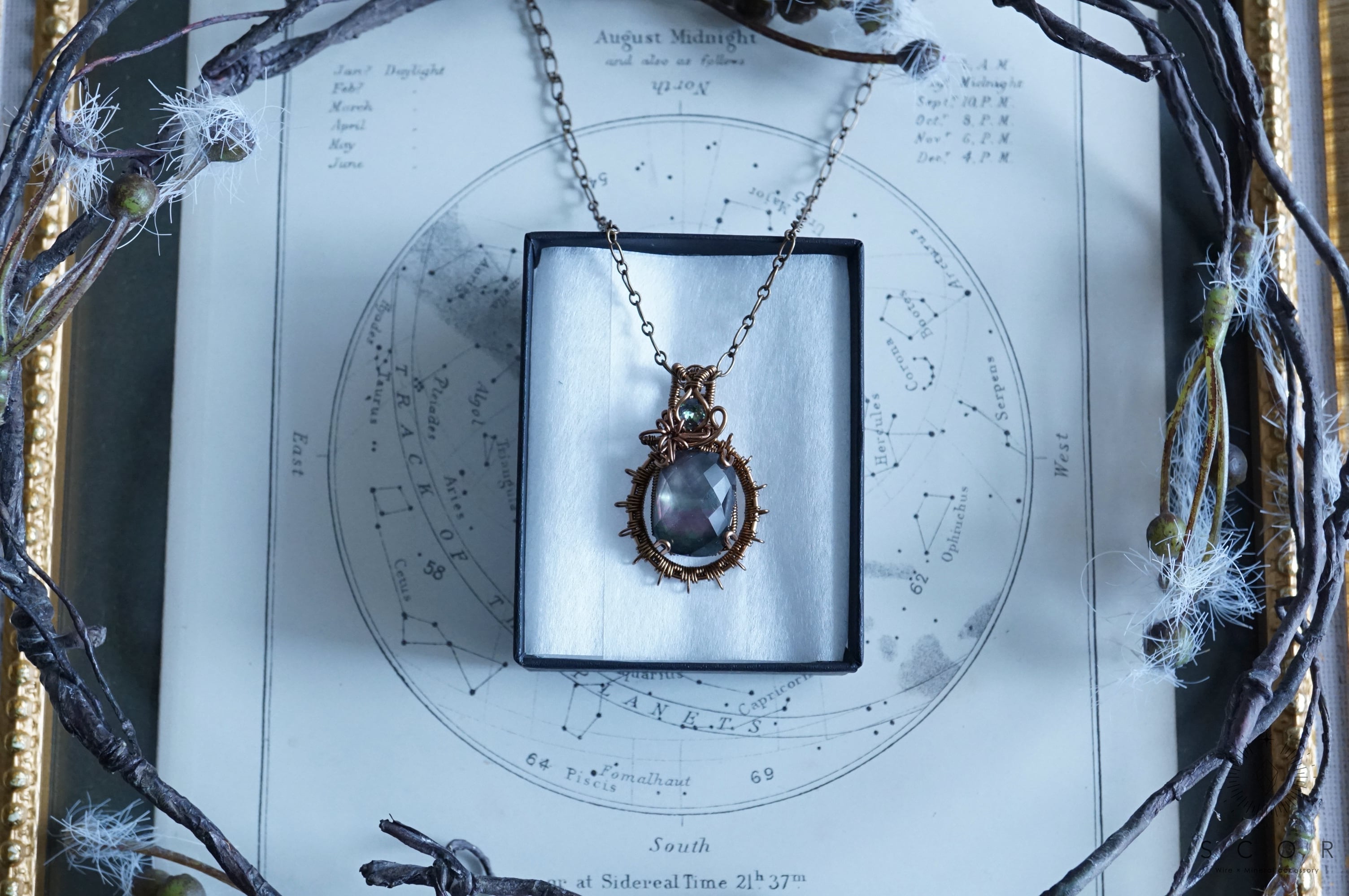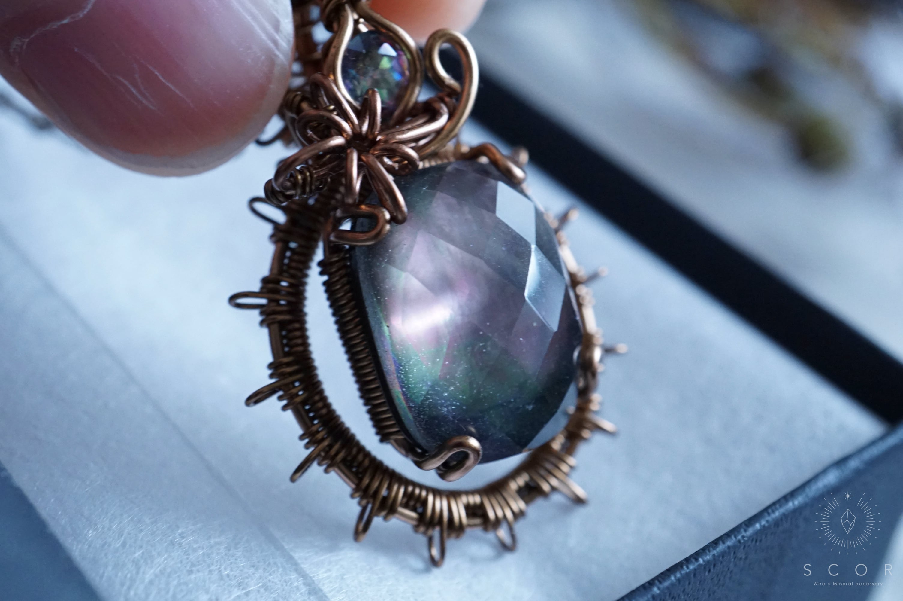 黒蝶貝のパープルとグリーンのオーロラのような光沢が、表面にチェッカーボードカットが施された水晶ドーム越しに見える、幻想的でクラシカルなムードのあるピースです。
