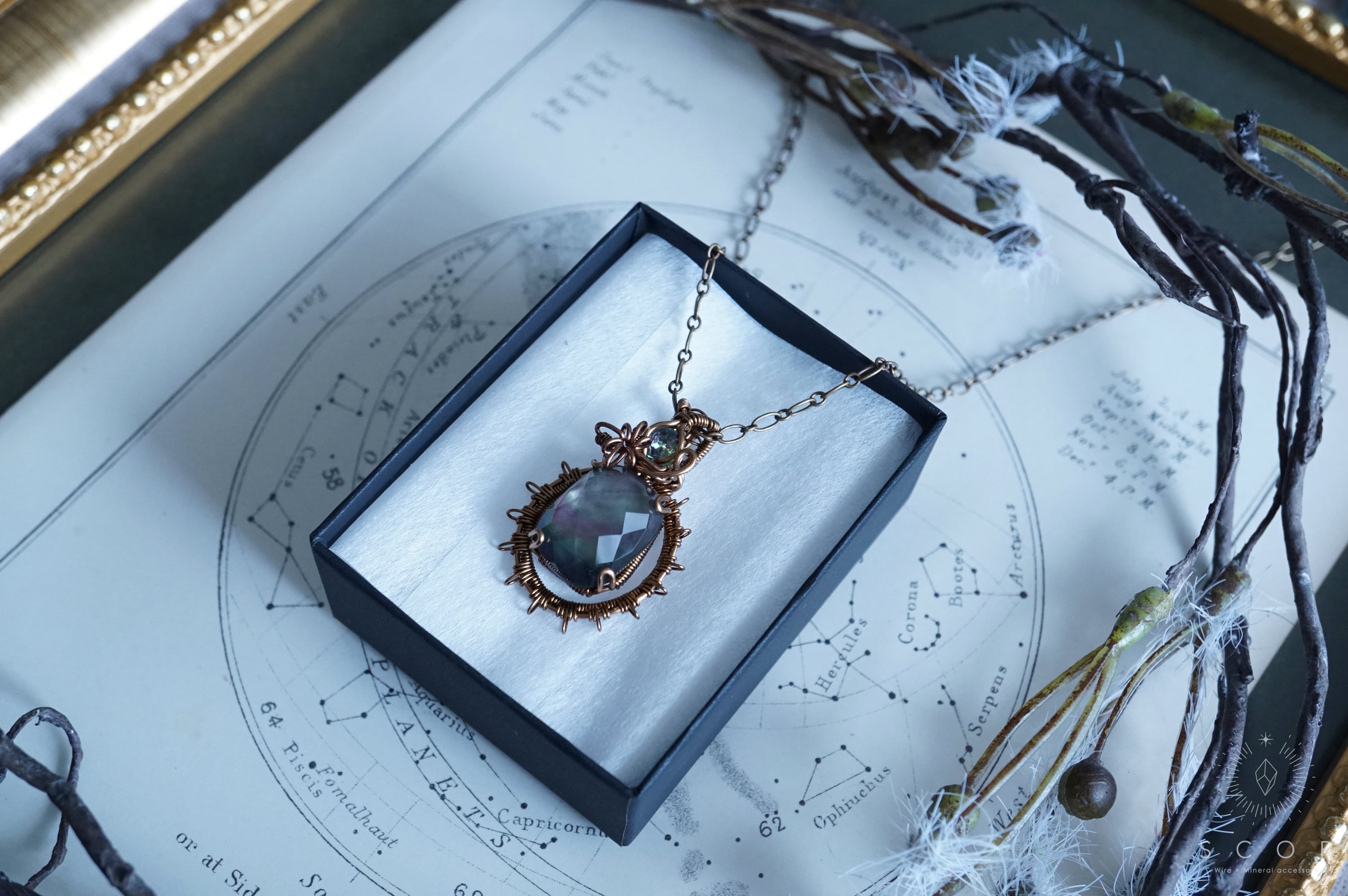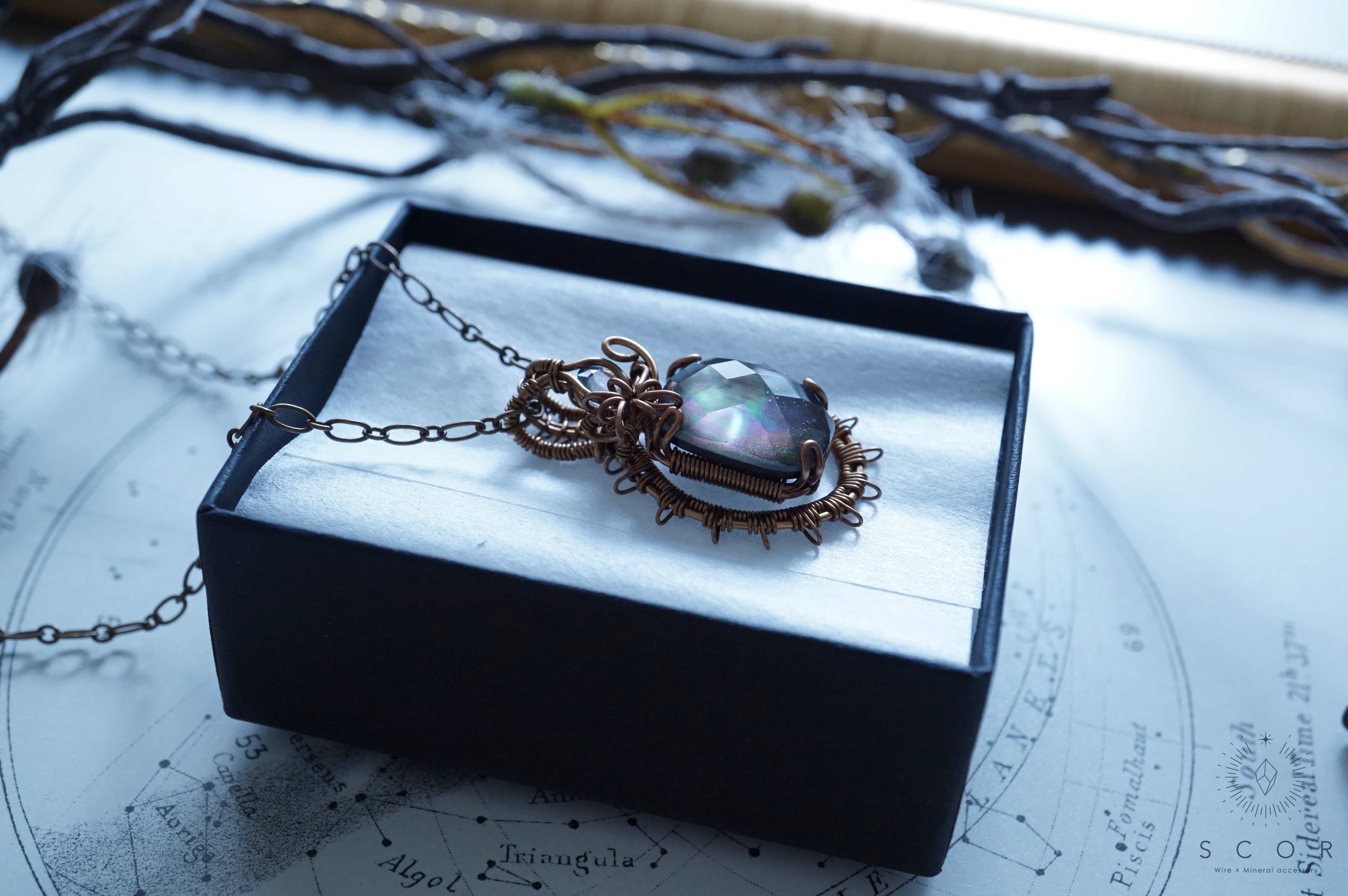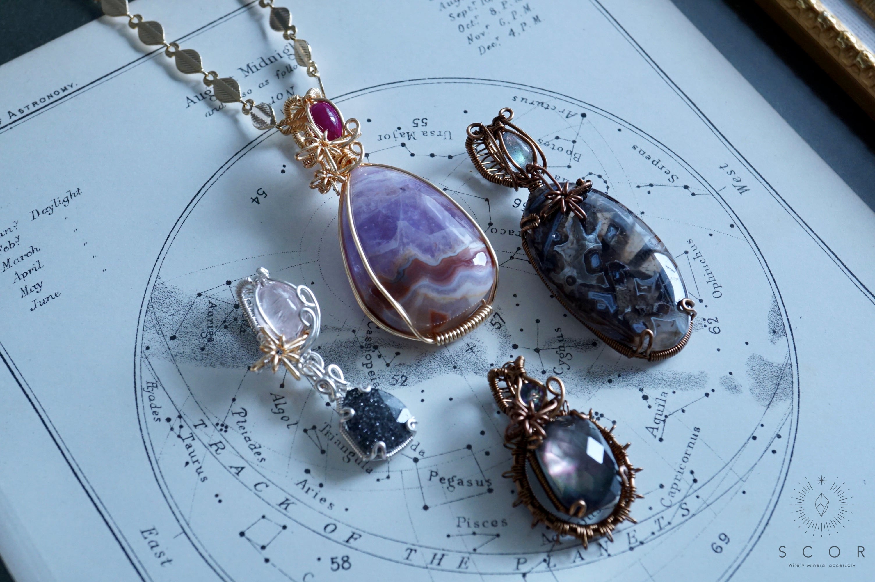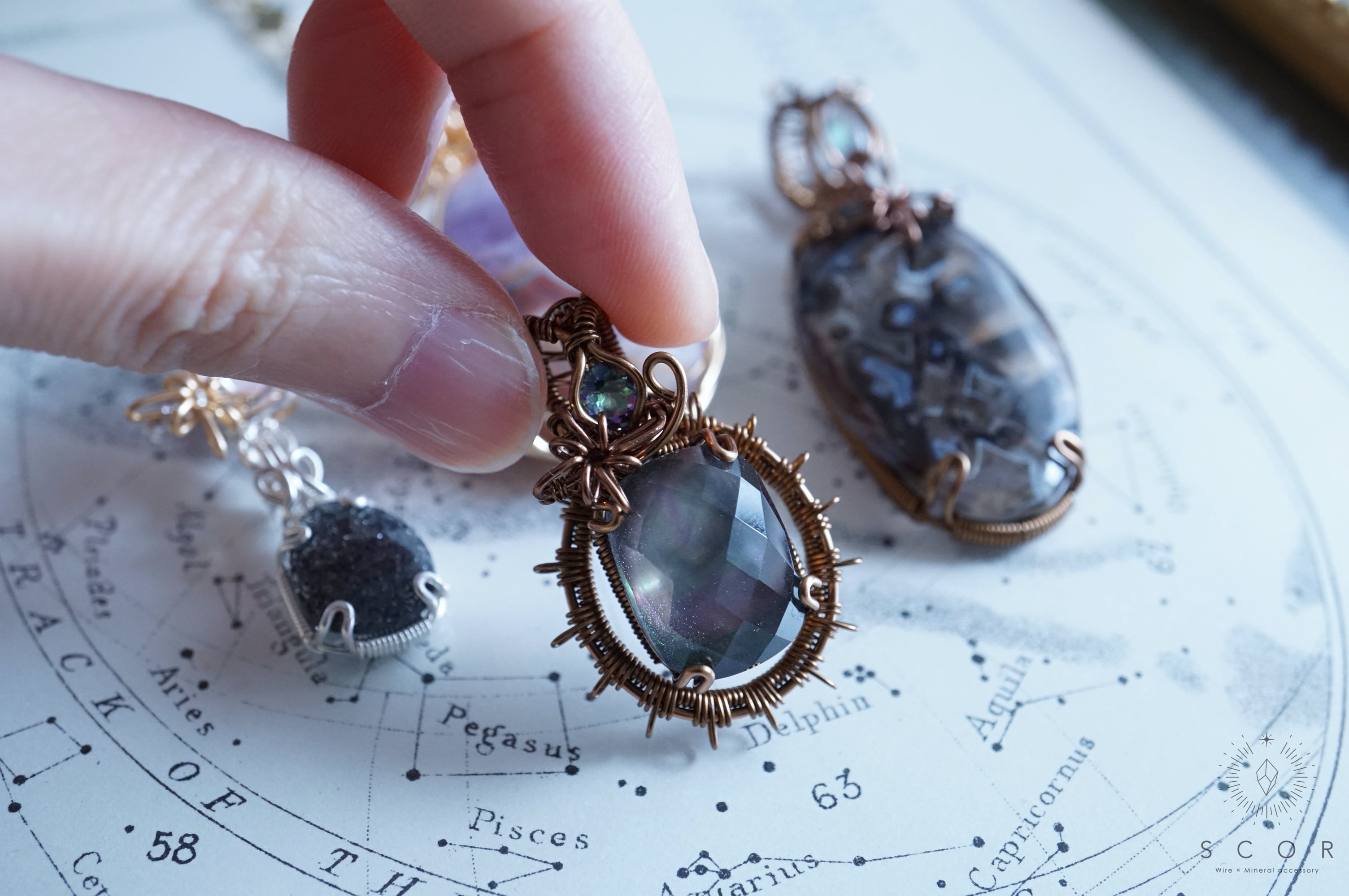 水晶 × 黒蝶貝ダブレットとルビーの間に添えた光芒型のワイヤーモチーフのみ金色ワイヤー仕立て。