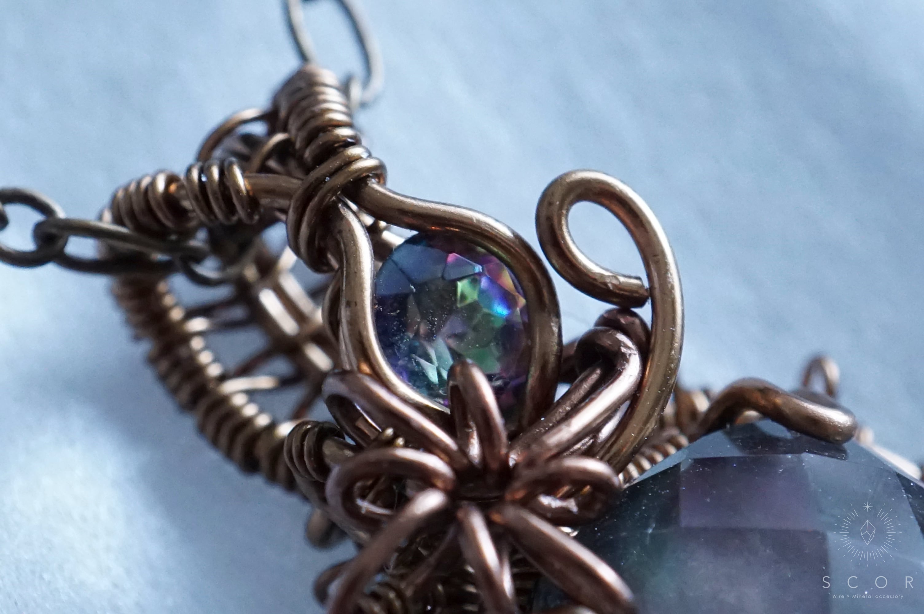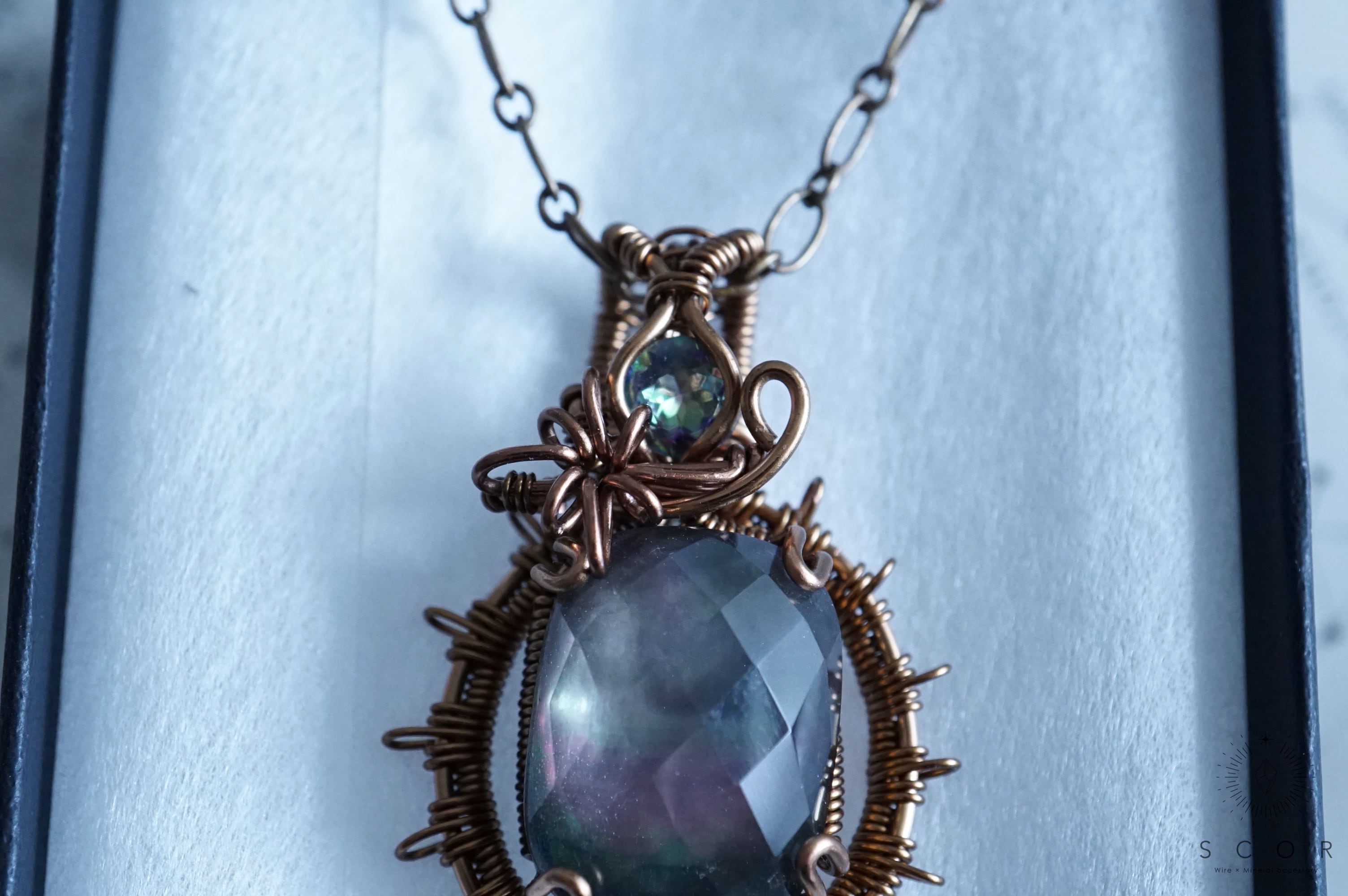ミスティッククオーツとは、人の手によって紫色にも緑色にも見えるカラーコーティングの加工が施された水晶。