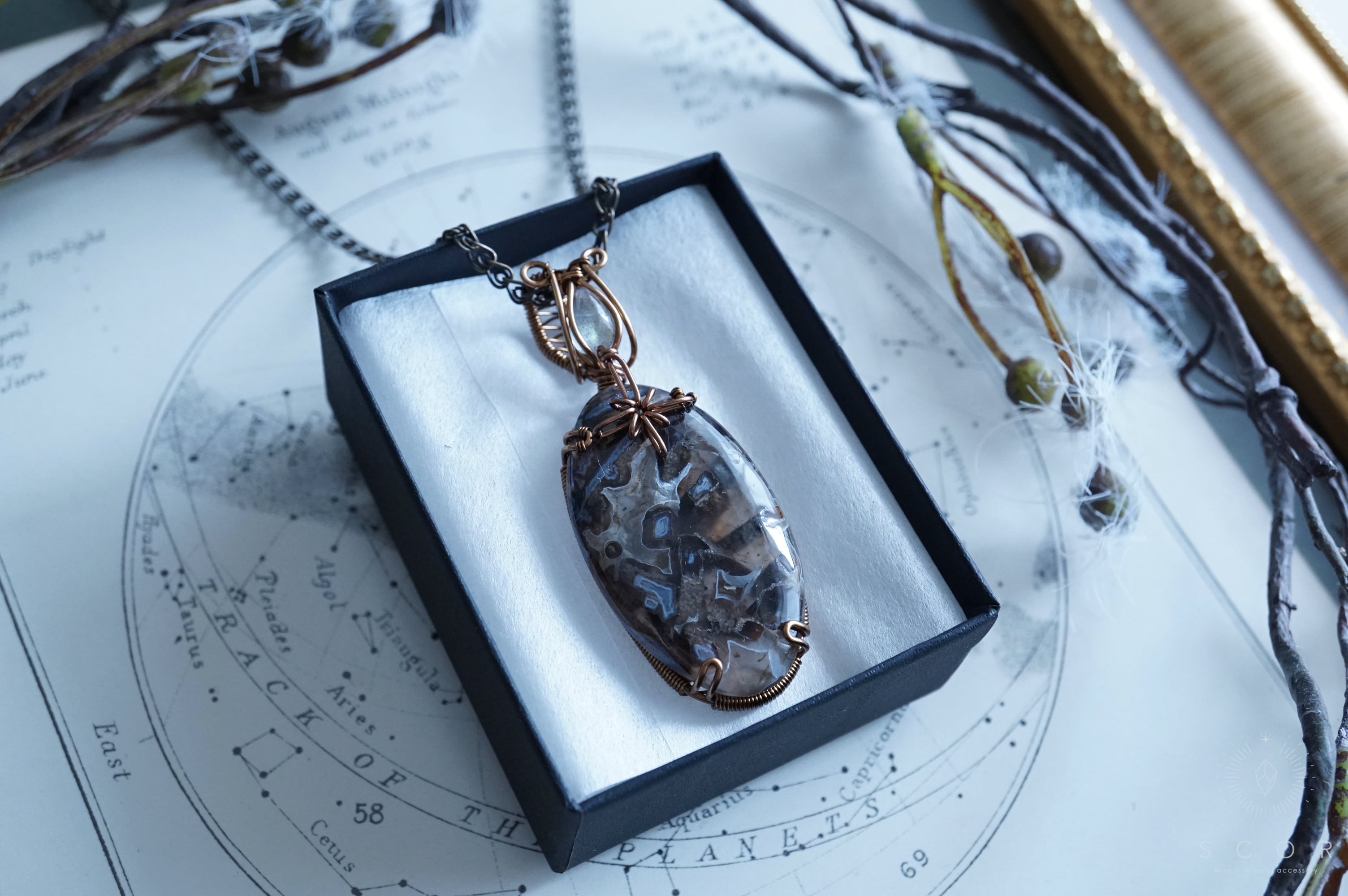 黒や濃い色の服と合わせると、ターキッシュアゲートの白い模様が浮かび上がり、シックなムードに。