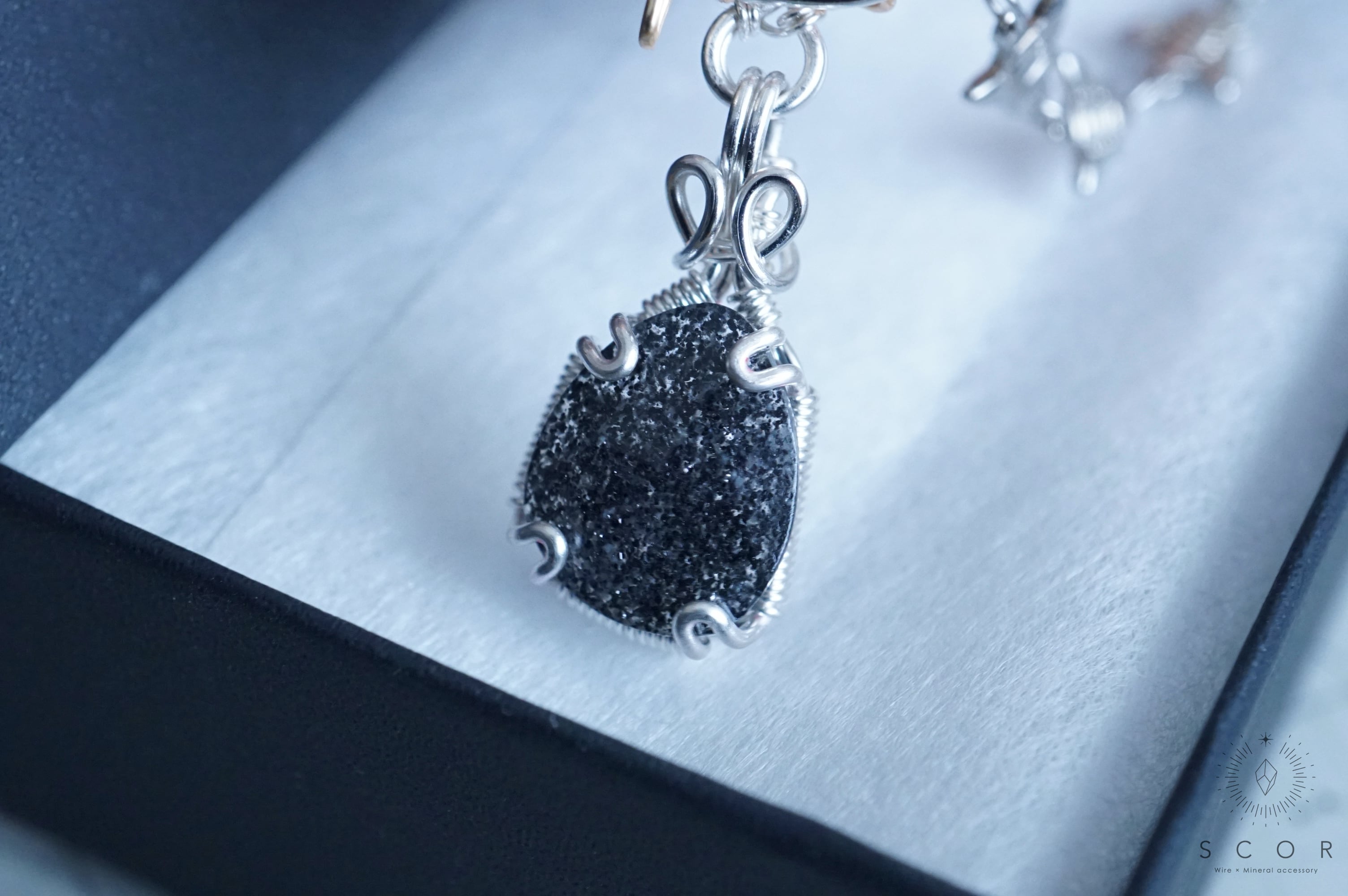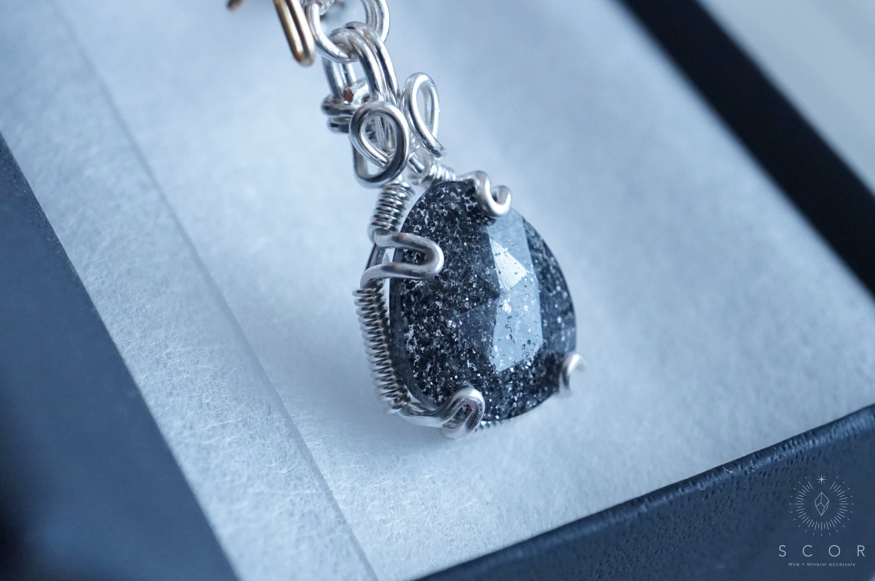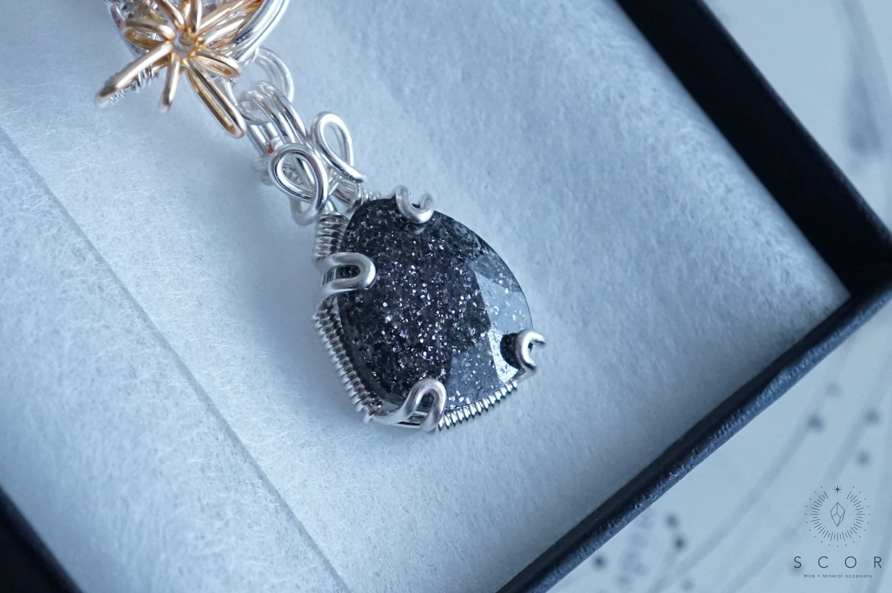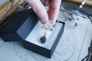 銀色のネックレスと合わせると、グラファイトインクオーツの鋭い煌めきとカボション表面のカットが際立ち、シックでクラシカルな雰囲気に。
