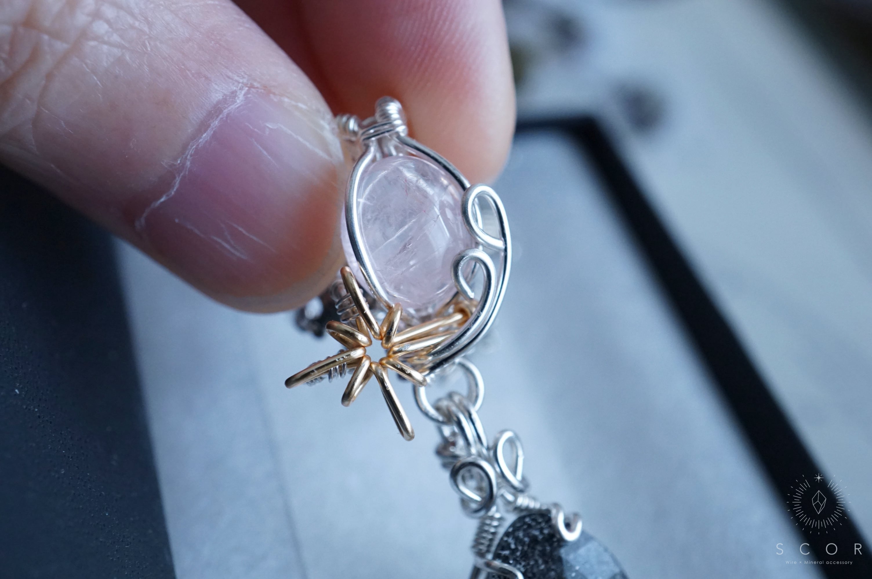 モルガナイトの下に配置した光芒型のワイヤーモチーフのみ金色ワイヤー仕立て。