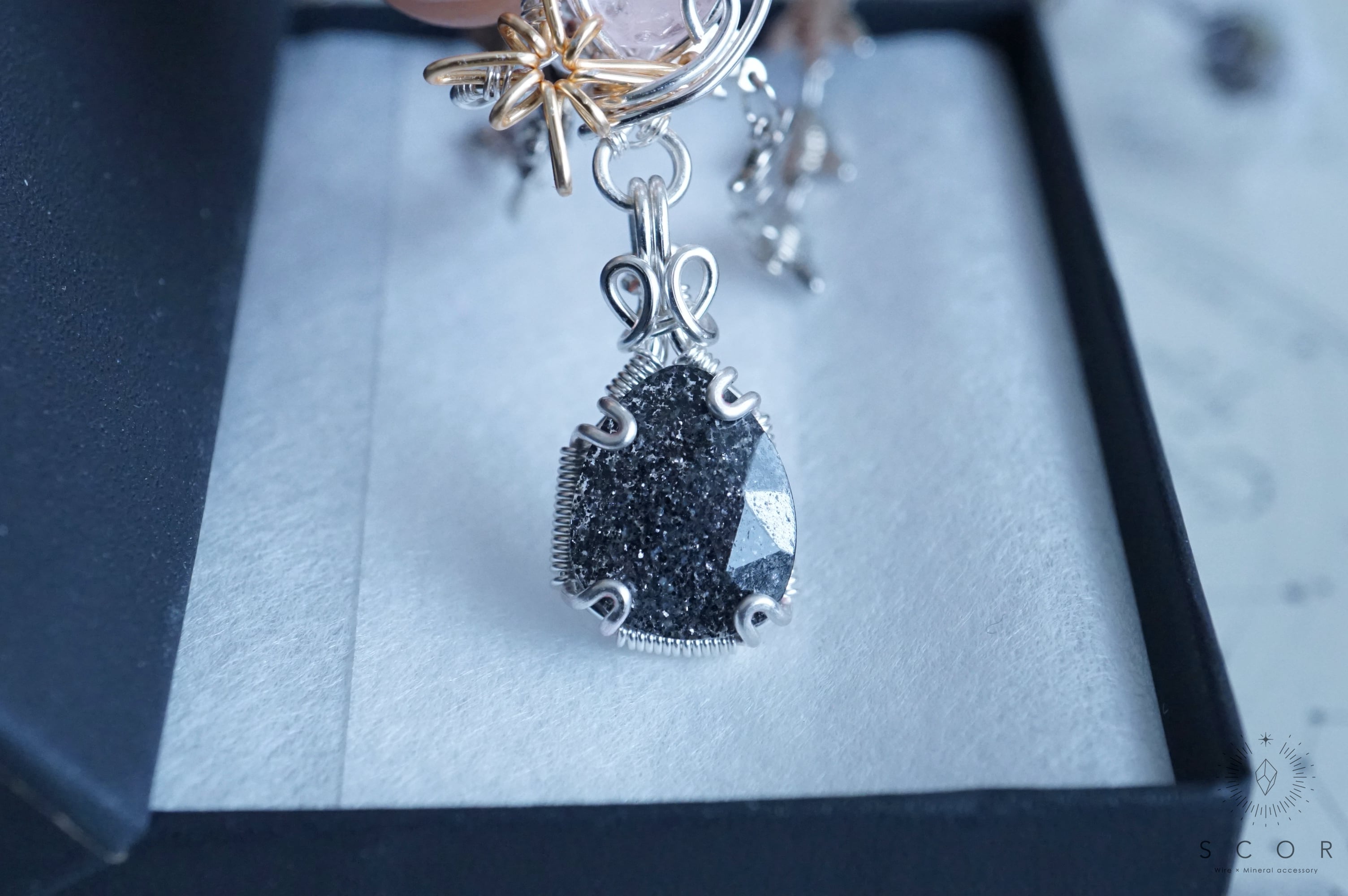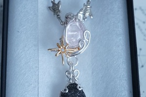 グラファイトインクオーツ(ブラックアベンチュリンインクオーツ)とモルガナイトを使ったペンダントトップです。