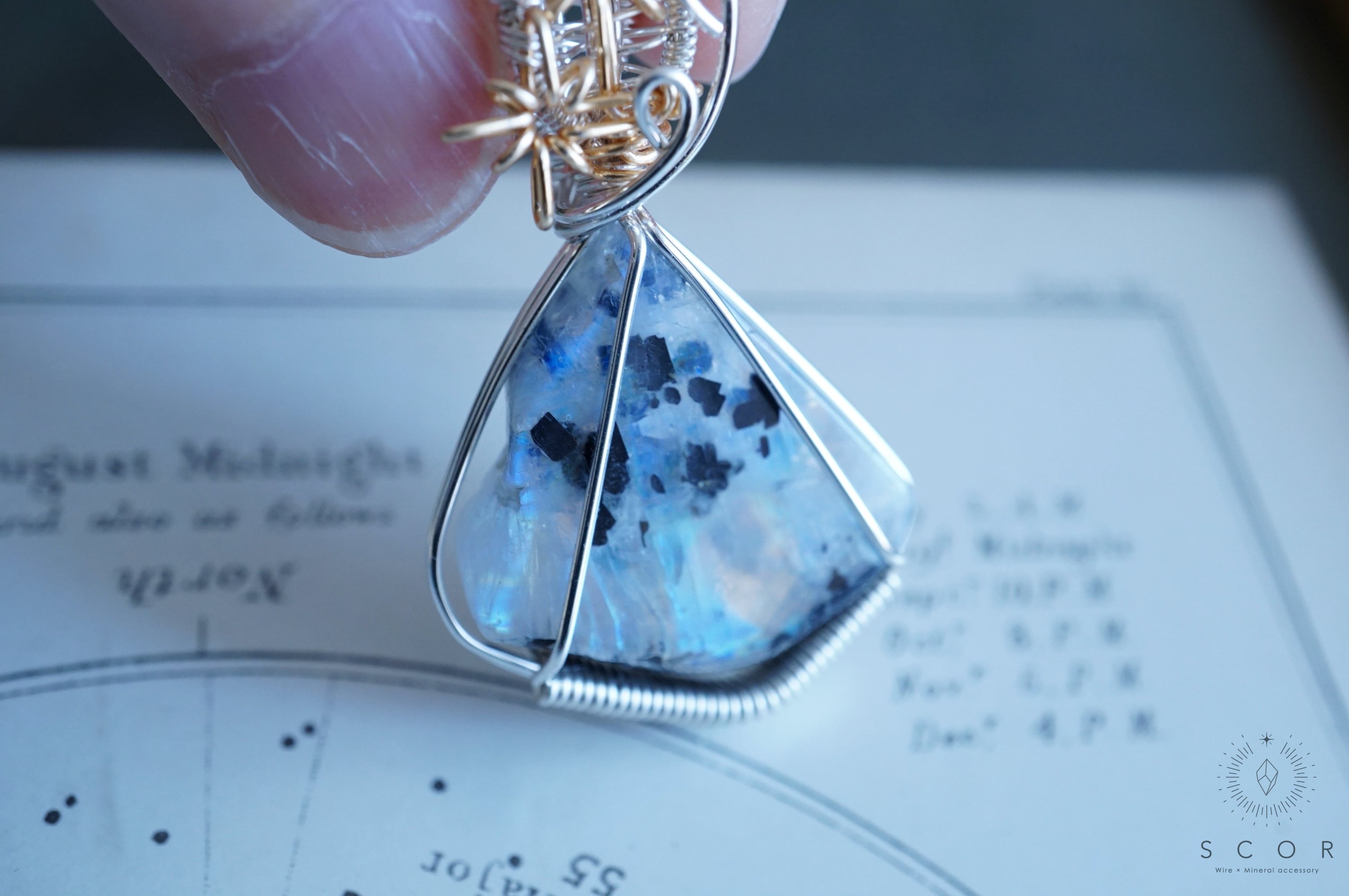透明部分と不透明部分が入り混じるホワイトラブラドライトに、黒い鉱物(バイオタイト / 黒雲母だと思われます)が点々と模様を描く、自然の妙味を目の当たりにできるピースです。