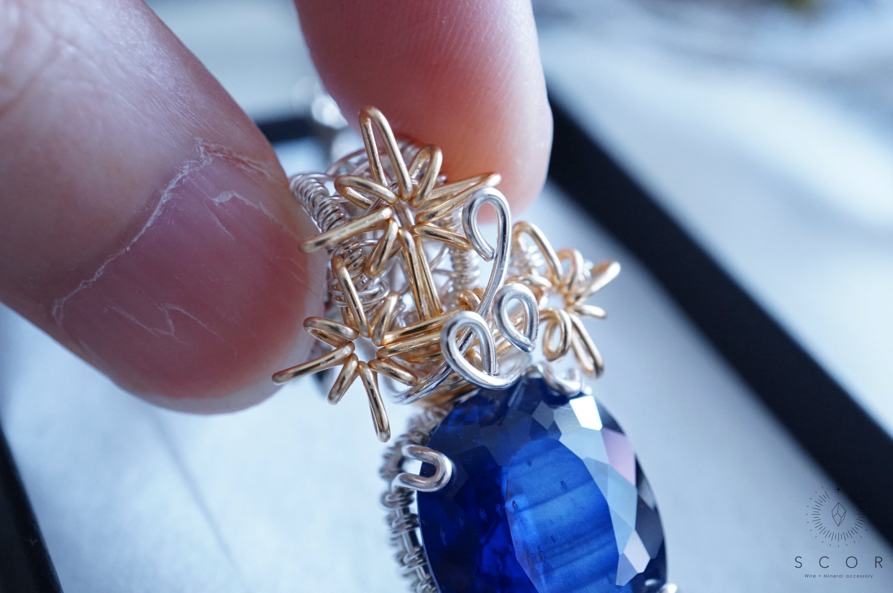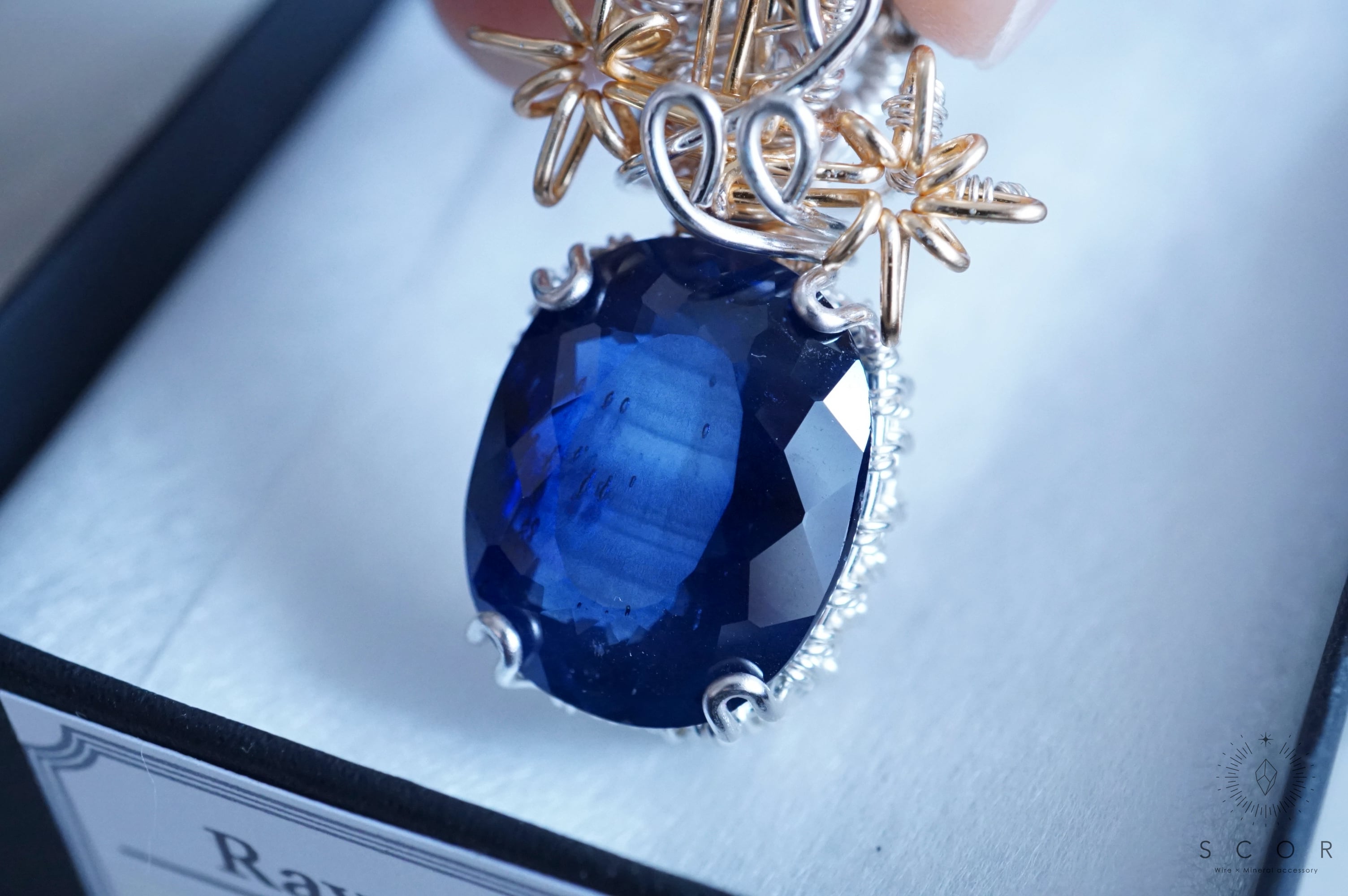 白や淡い色の服と合わせると、合成ブルーサファイアの石色が引き立ちます。