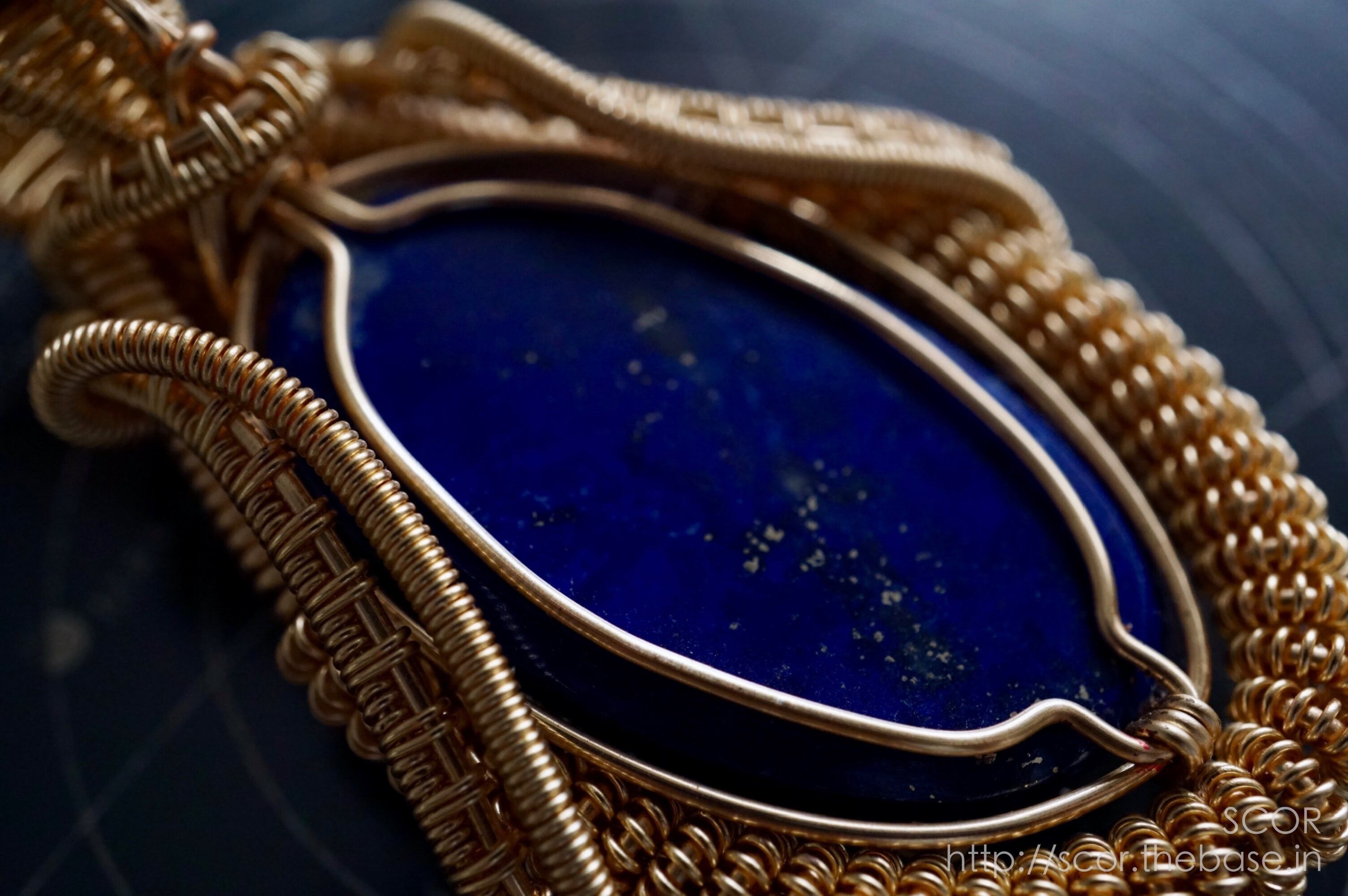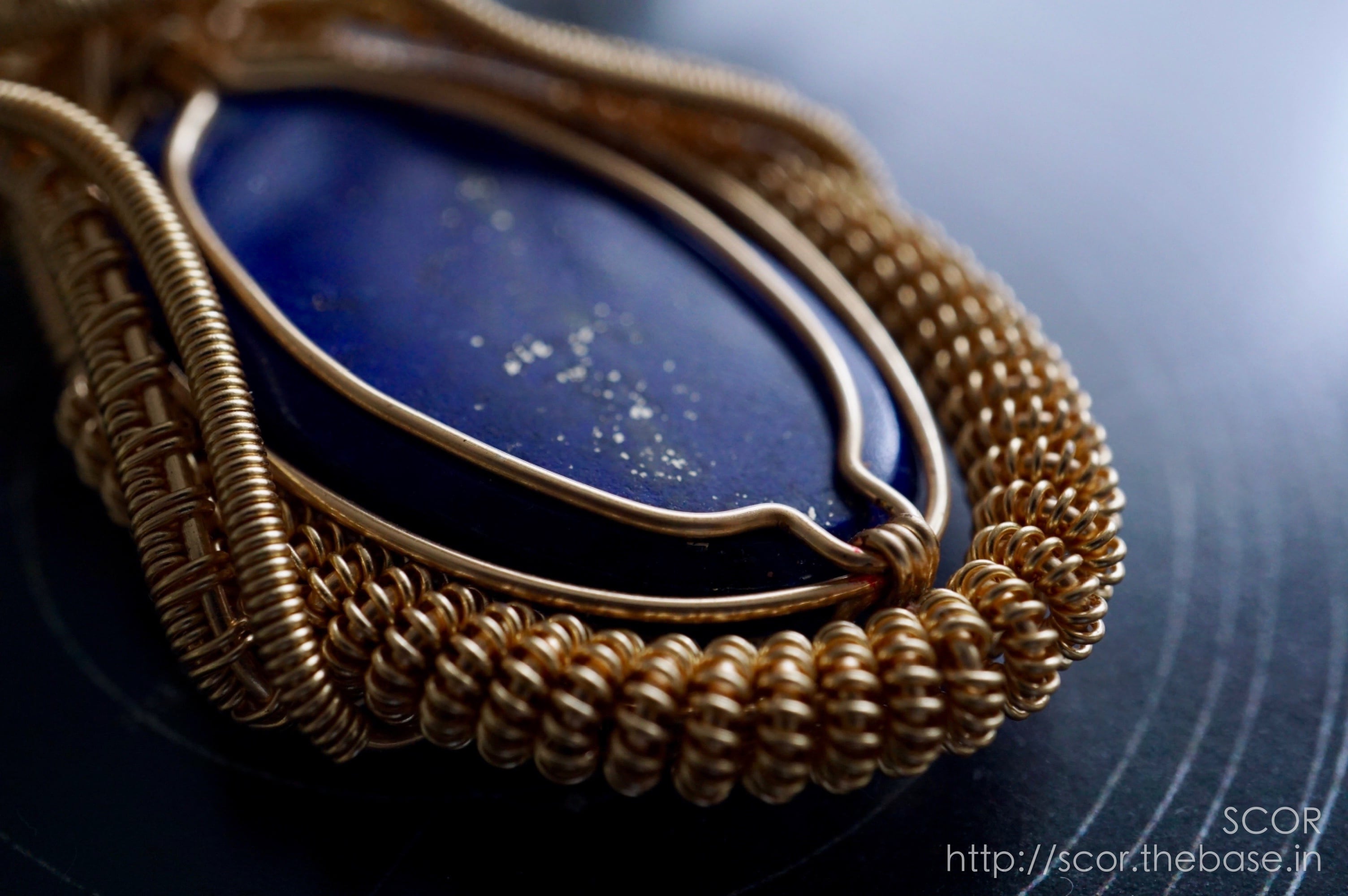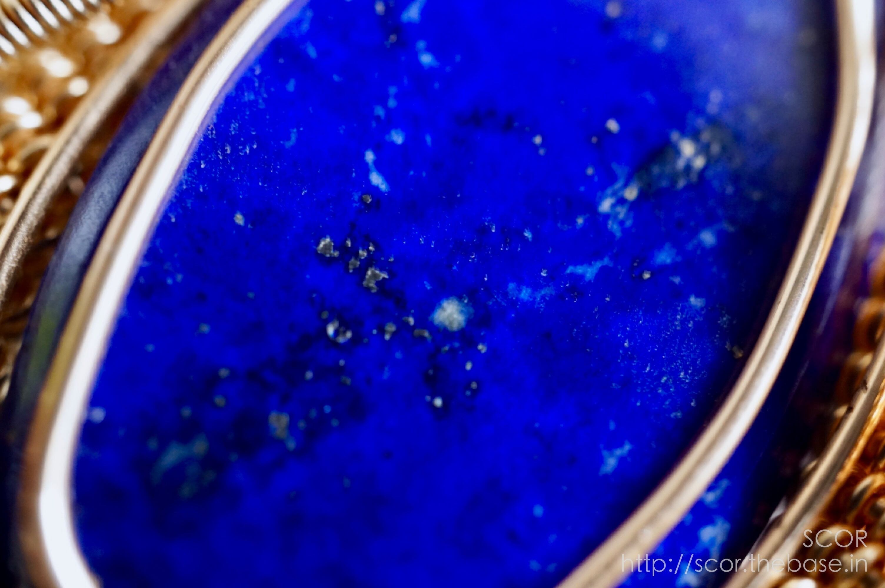 これぞラピスブルー!と言いたくなるような、深く美しい紺碧に、金色のパイライトが、まるで天の川のように散っていて、このピースのこの部分を生かしたデザインで作りたい、と思い、製作した作品です。