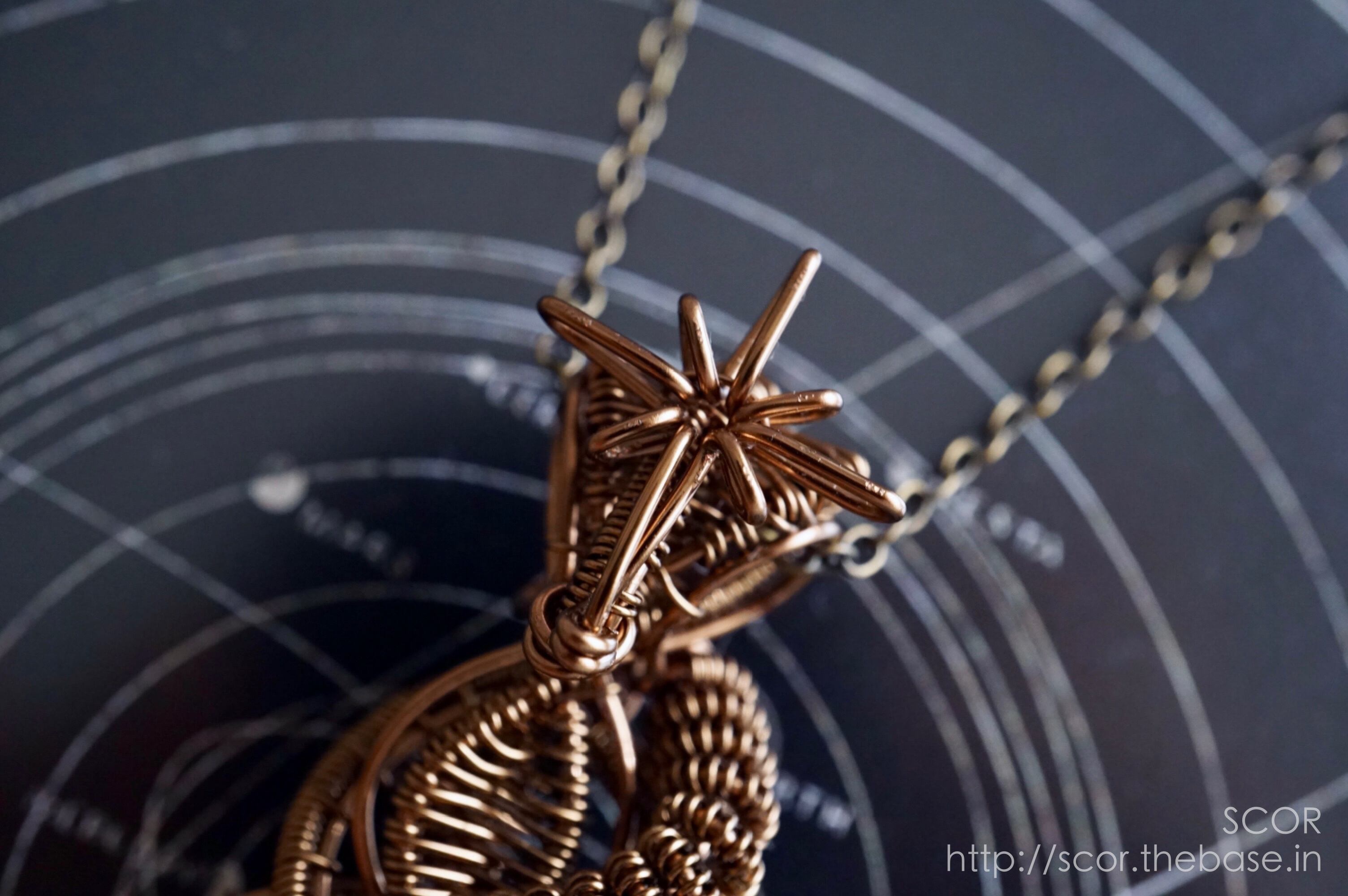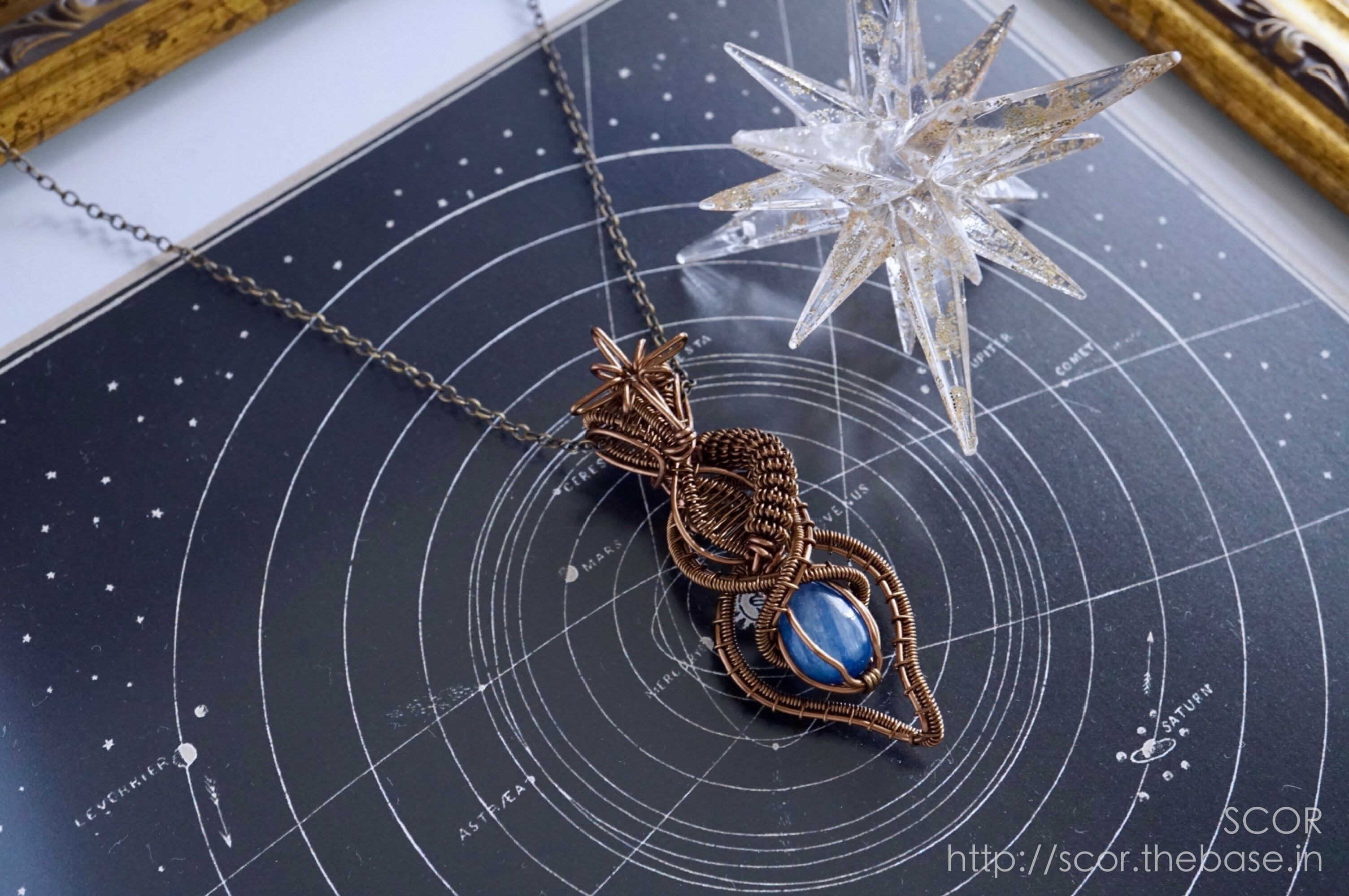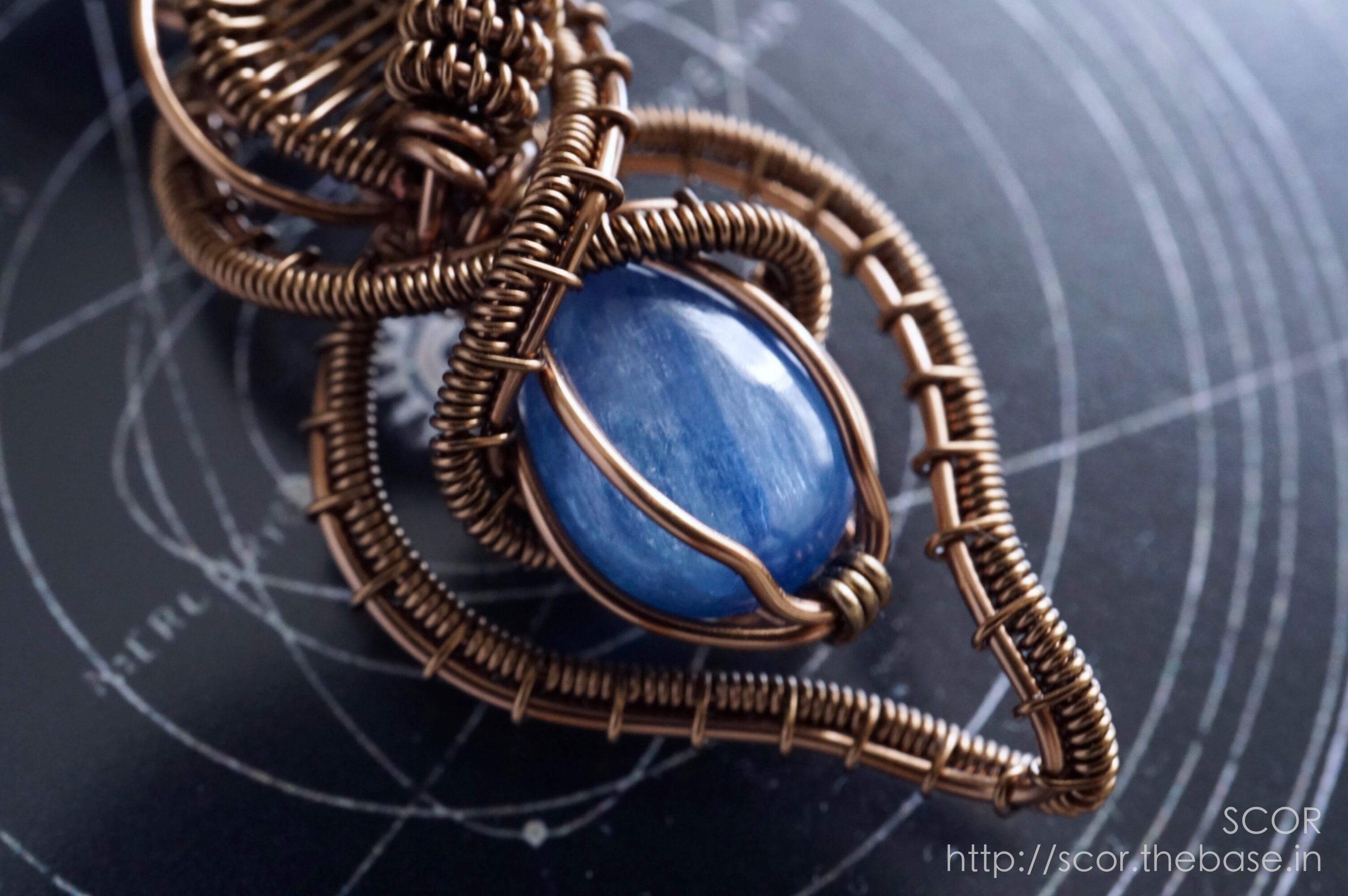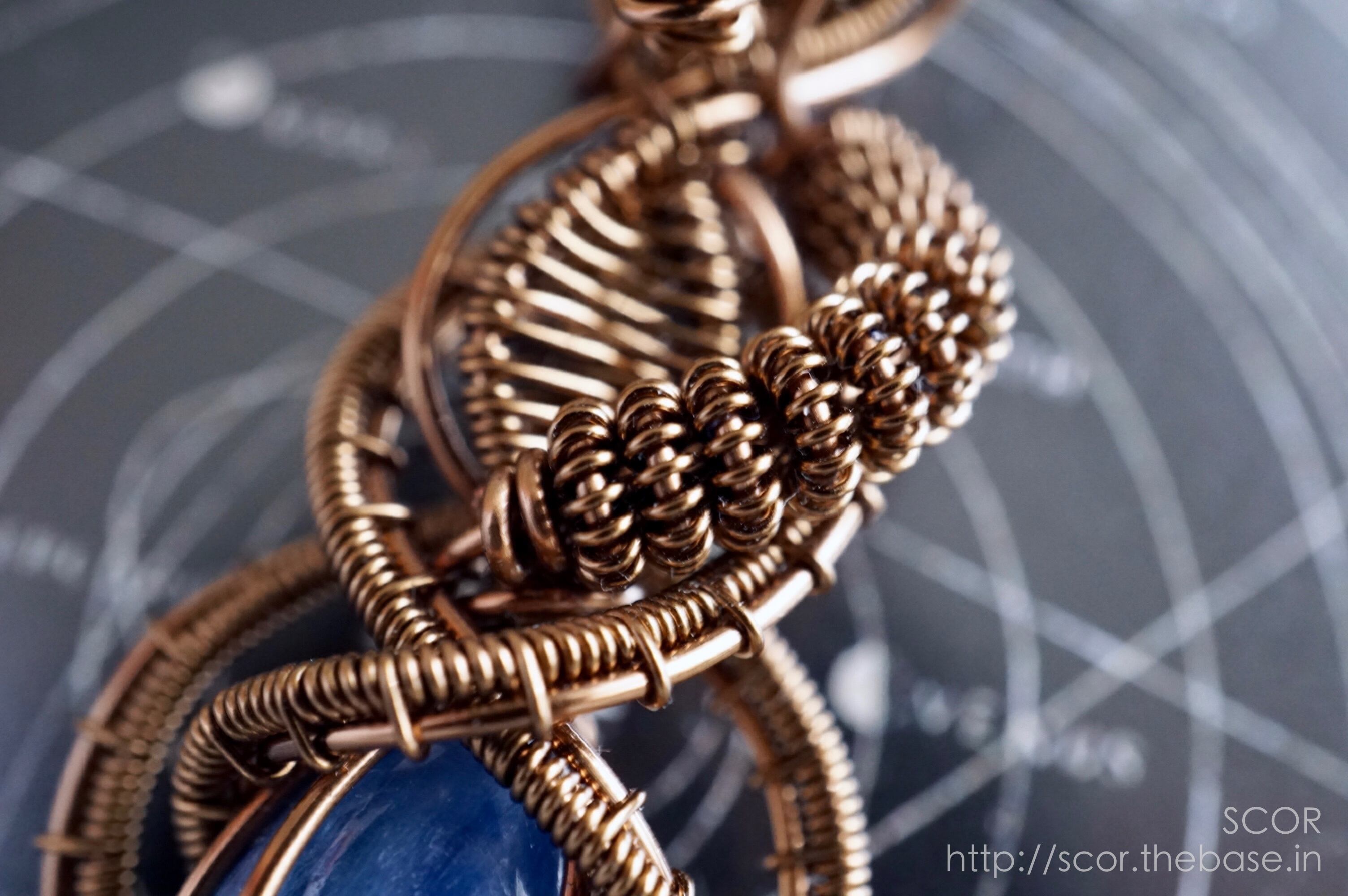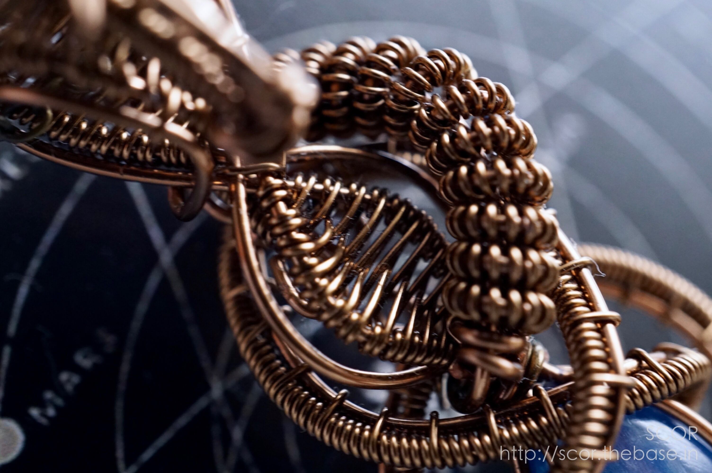 石の周りの、フレーム状の巻きワイヤーは、宇宙船の舳先のような、または、カイヤナイトを周回する衛星の軌道を想起させます