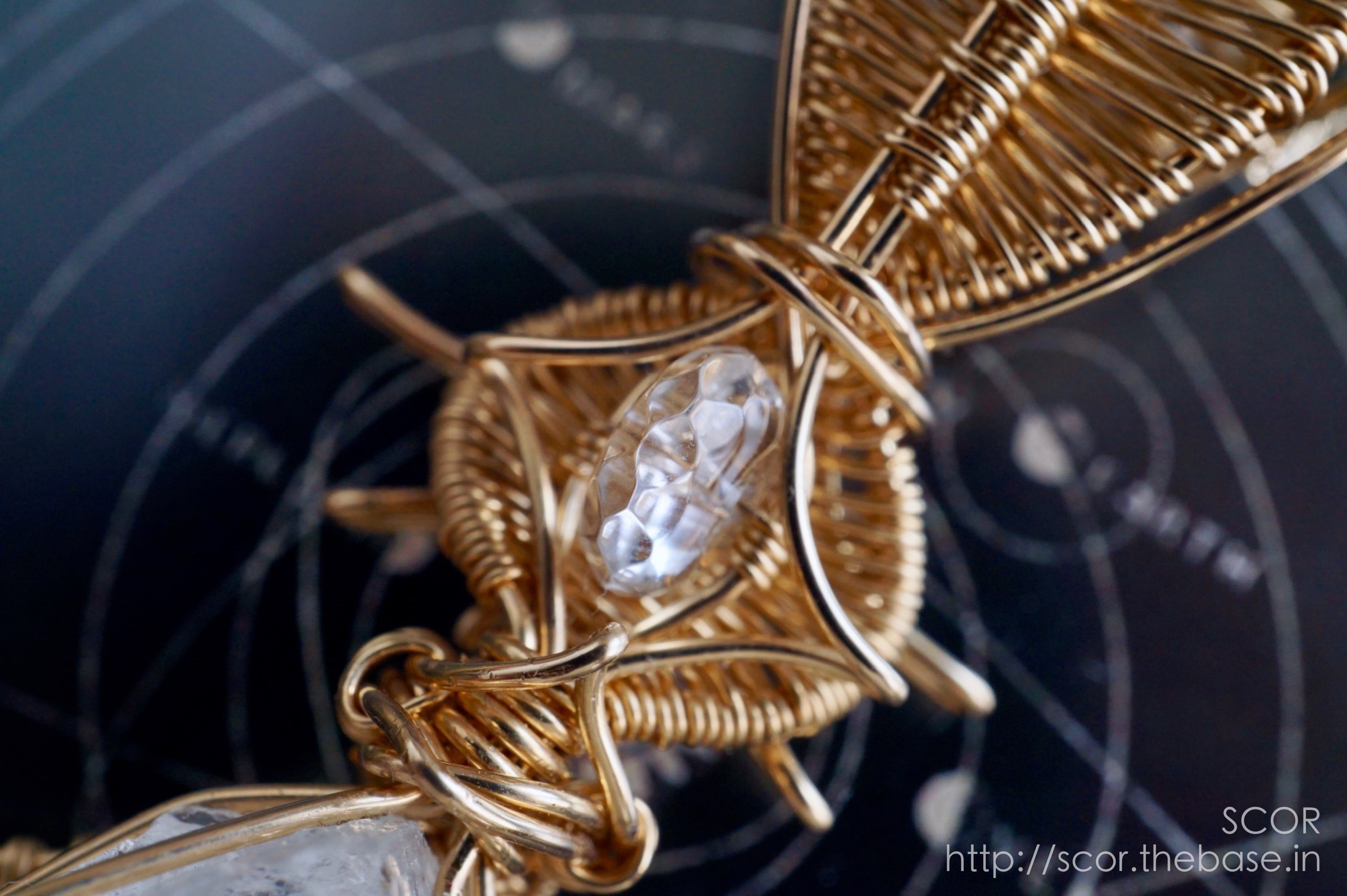 デザインは、アポフィライトの背面に、巻きワイヤーの大きな光芒モチーフを配し、バチカンと連なる中央部分には、カットが入った水晶ビーズと、それが引き立つようワイヤーで編んだ背景、光芒のモチーフが重ねられています。