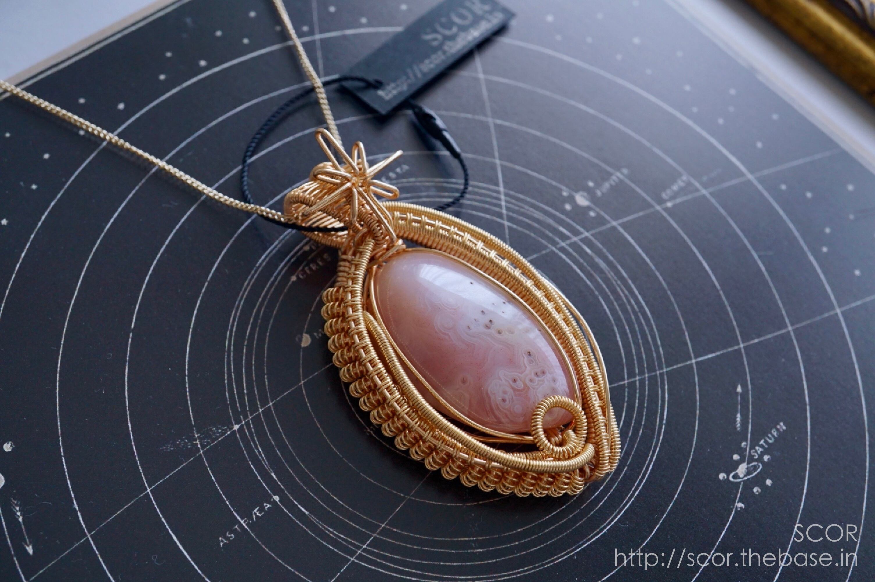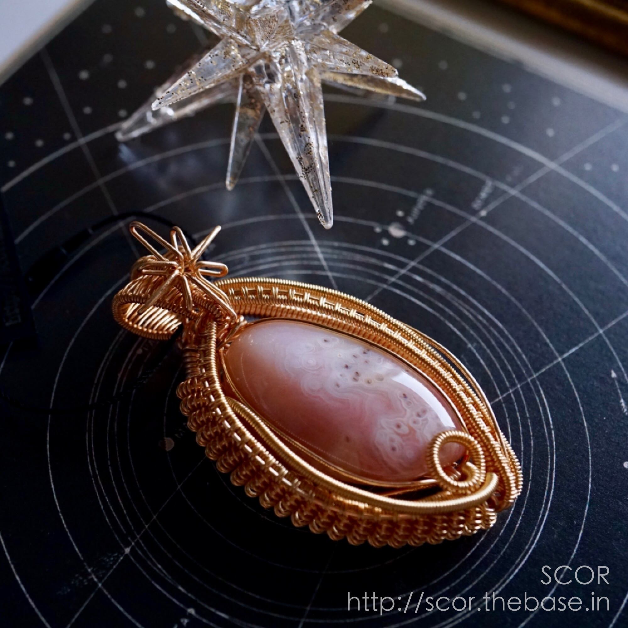 石の左右には、様々な巻き方のワイヤーを幾重にも重ねて、石を縁取るように配置し、左右の巻き方・組み合わせを変えて、変化をつけています。