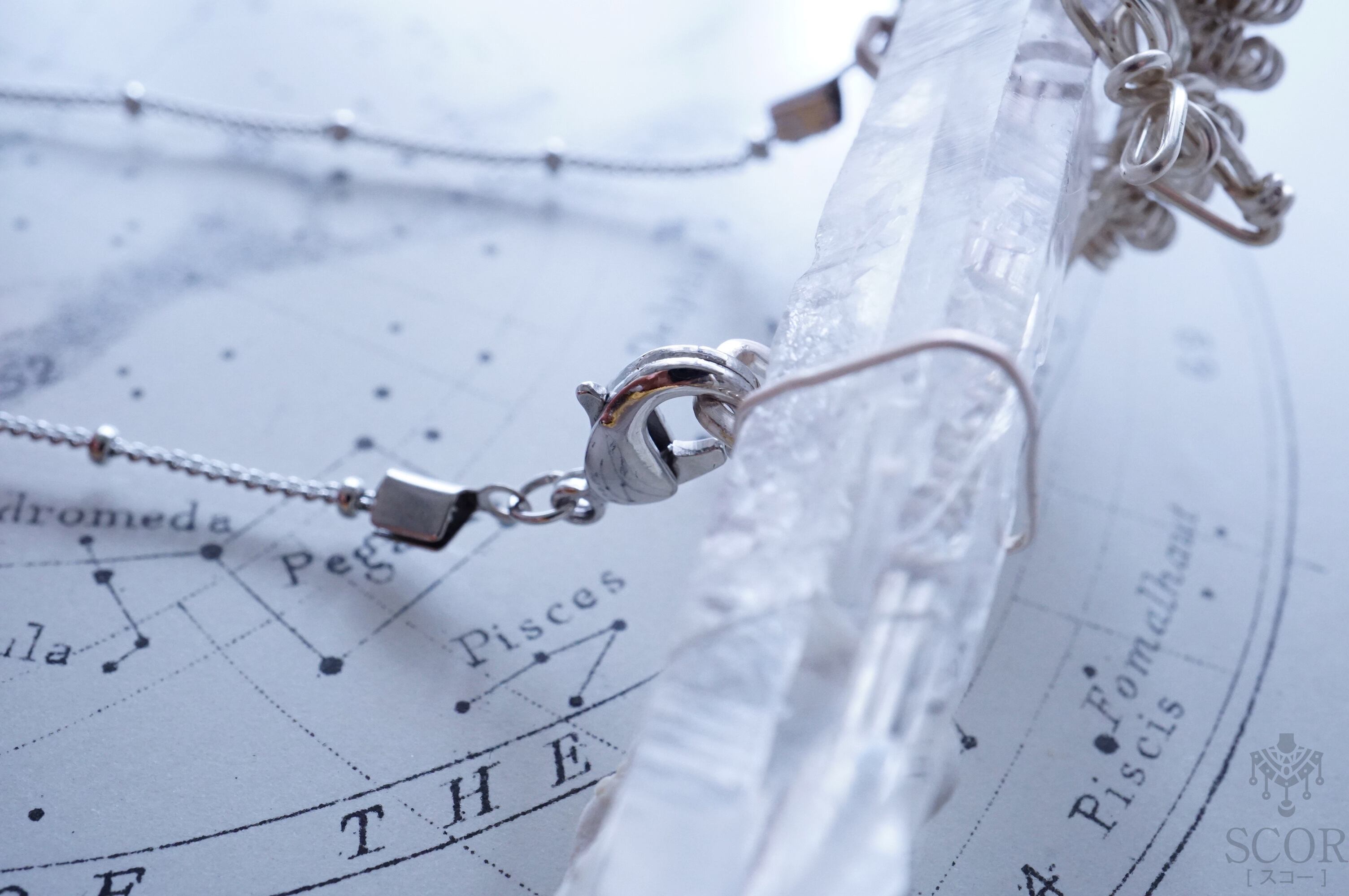 ワイヤー切断面は、なるたけ表に出ないように処理をしていますが、ストール、マフラー、レースなどと共に身につける際は、引っかかりにご注意ください。