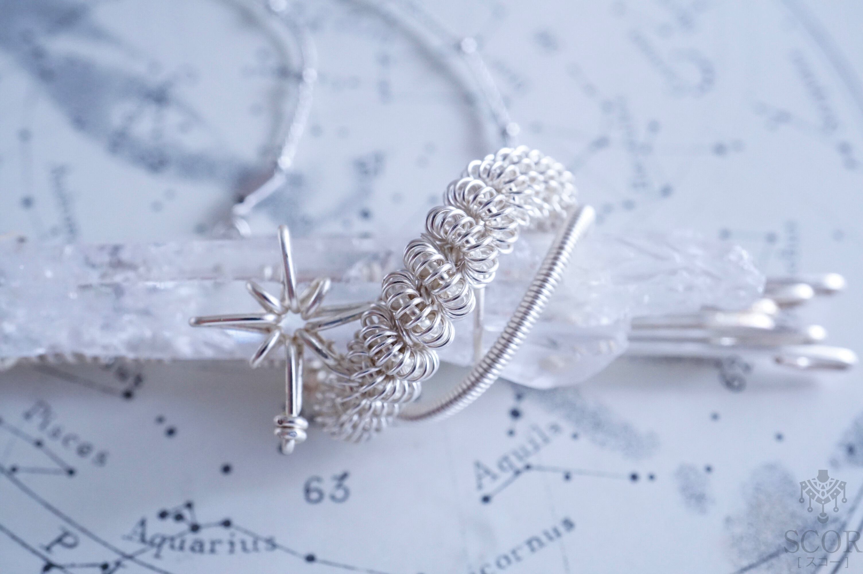 細いワイヤーによるコイルやcoiled coil(コイル状のコイル)は、流星のかけらによる光の軌跡を、その煌めきの瞬間を3つの光芒のモチーフで表現しています。