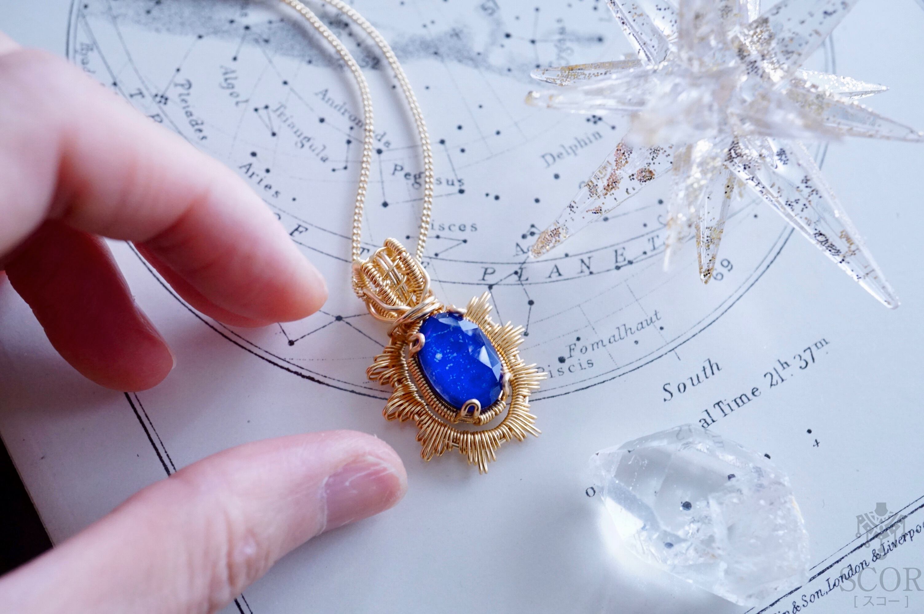 ラピスラズリと水晶のダブレットを星に見立て、その光をワイヤーで表現しました。